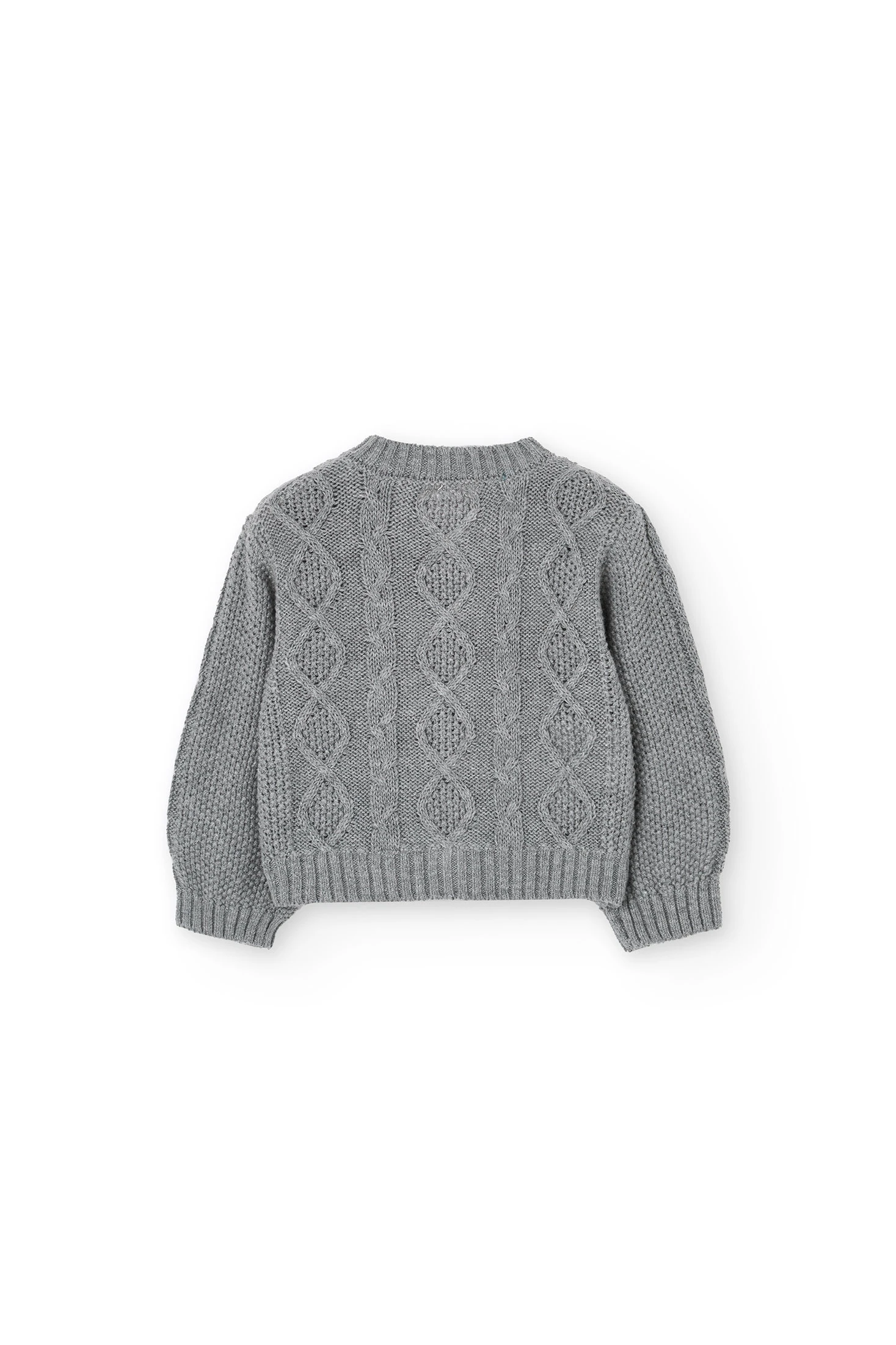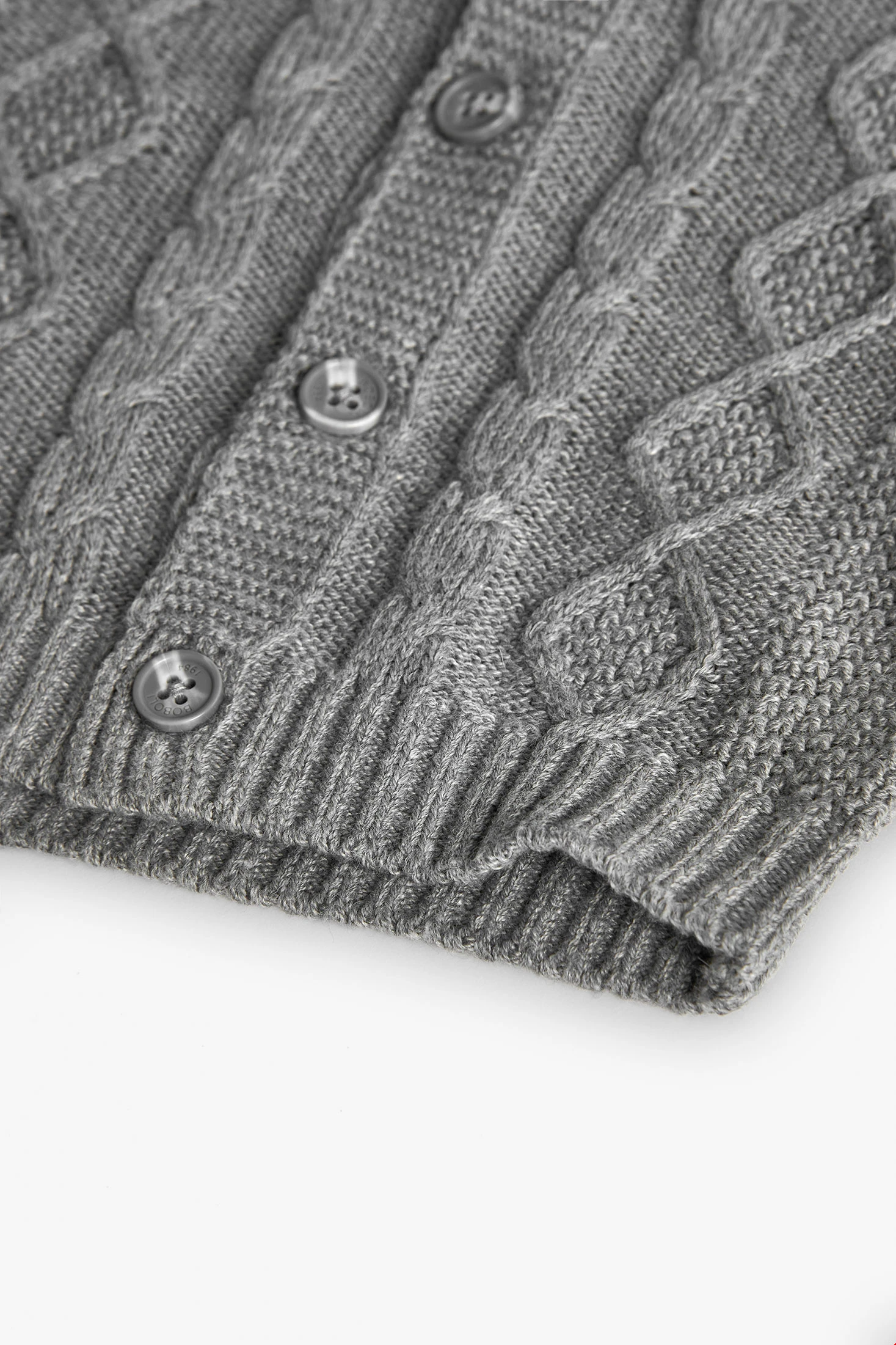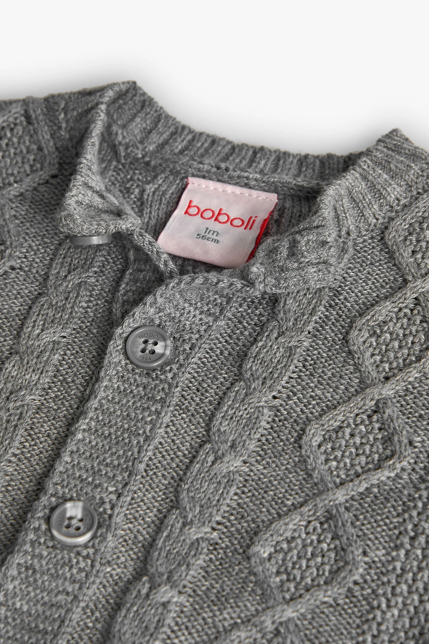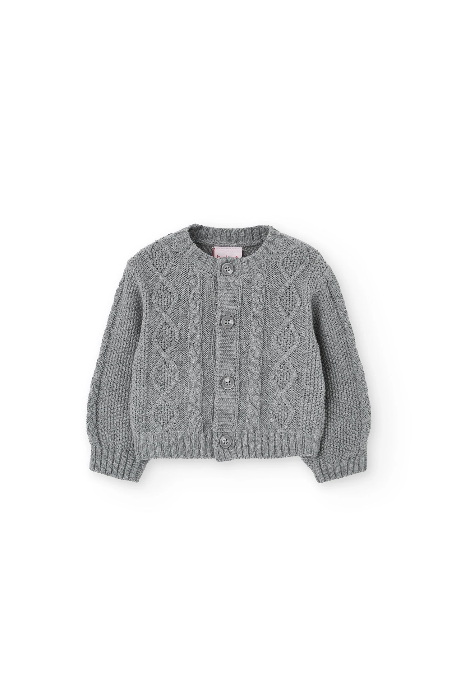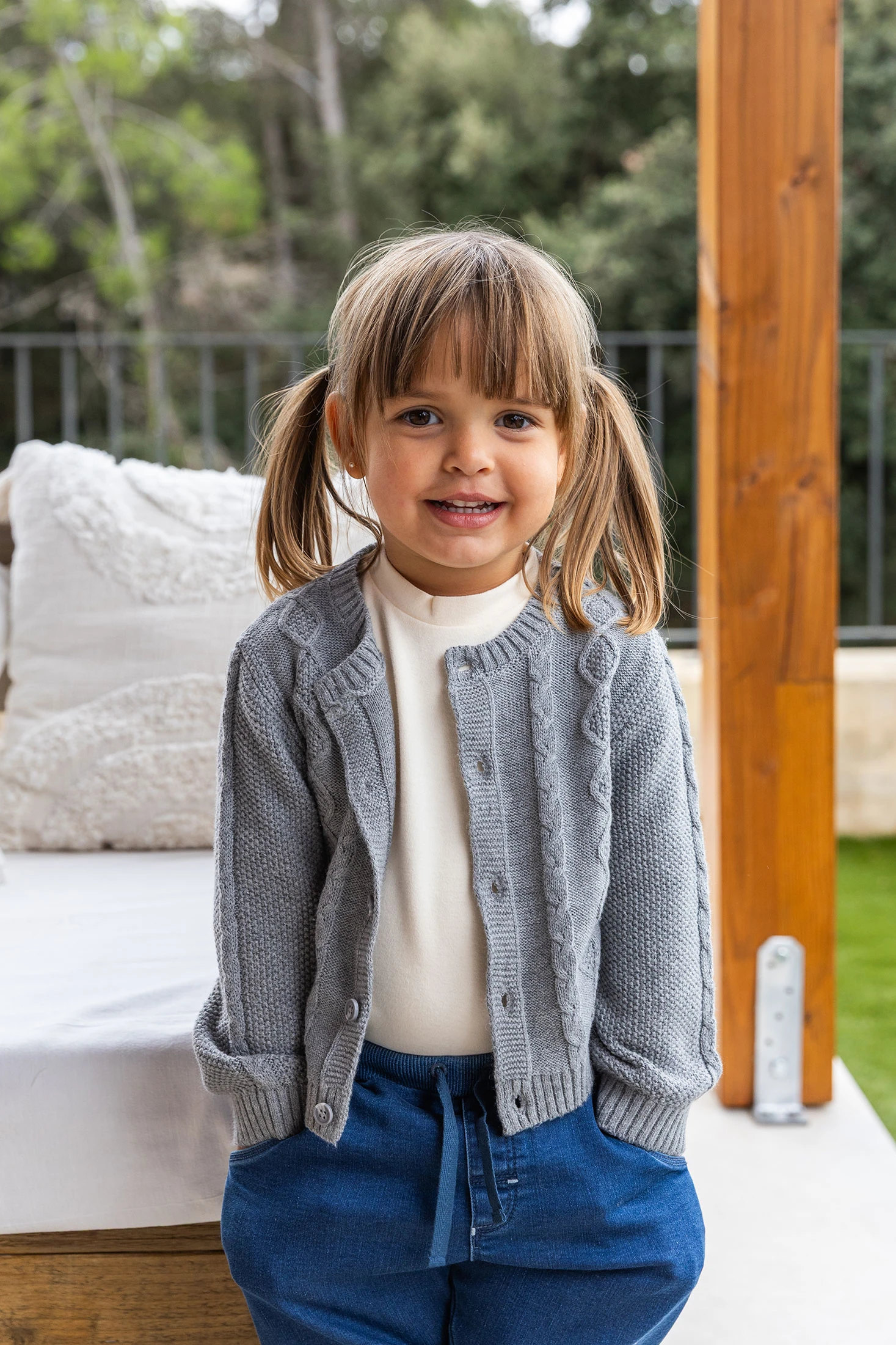 Knitted cardigan with a grey cable pattern for babies, perfect for the autumn and winter seasons, offering warmth without sacrificing style. Made with soft material, it ensures maximum comfort for your little one. Its practical front button closure makes it easy to put on and adjust. Available in sizes from 1 month to 2 years, this piece easily pairs with other outfits to create cosy and fashionable ensembles.