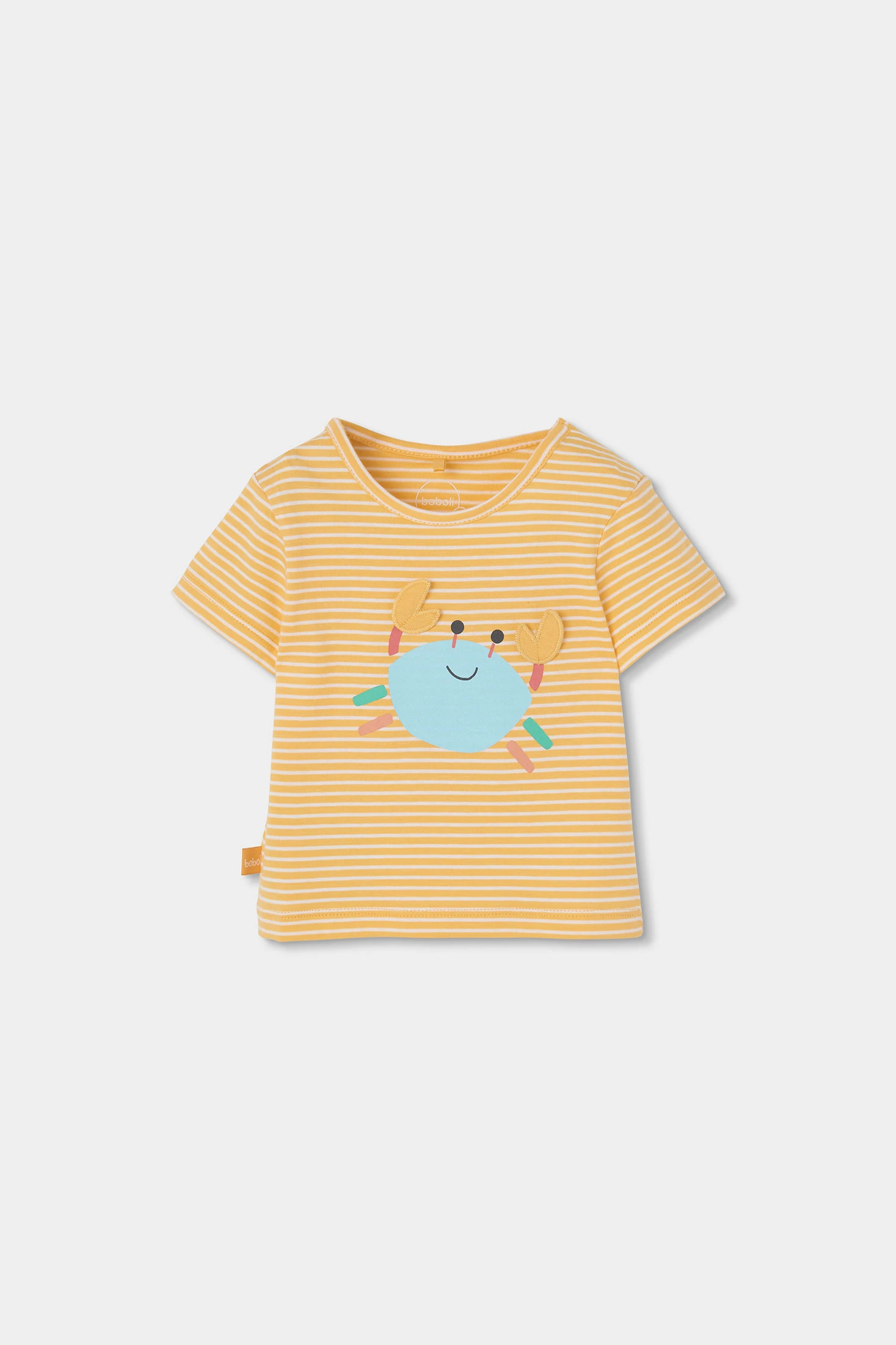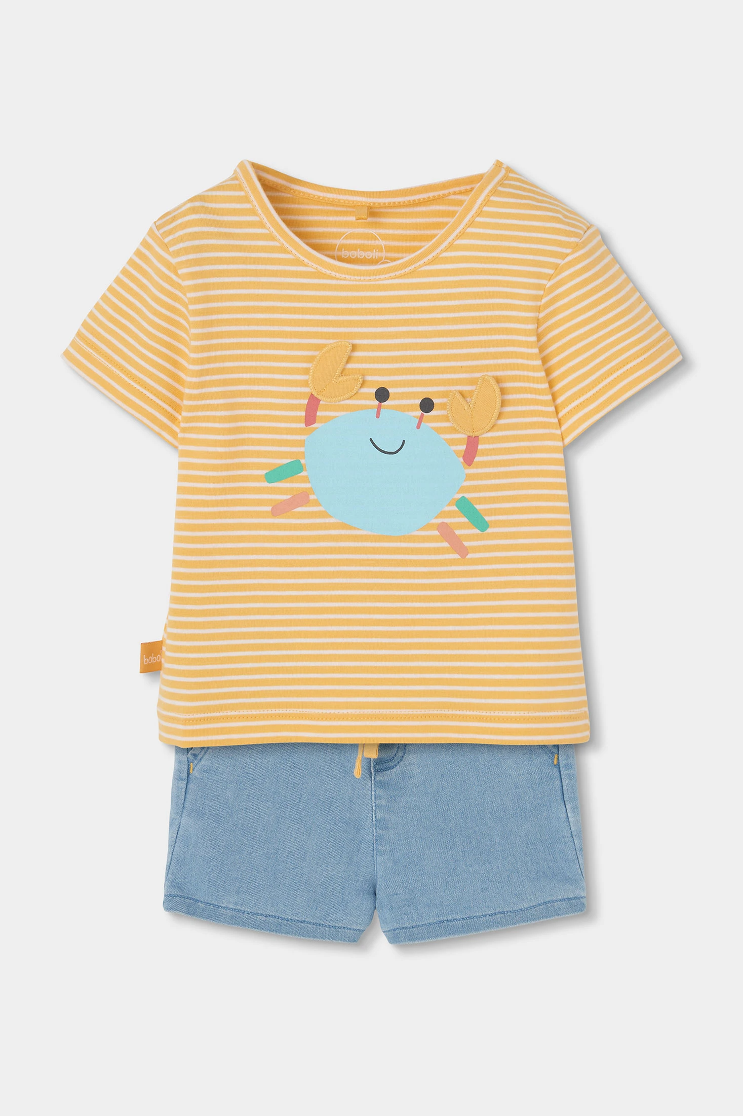 Set for baby boy ideal for the warmer months. Yellow cotton t-shirt with white stripes and a design of a cheerful blue crab, adding a touch of fun. Paired with light blue shorts, it is perfect for a summer look. The soft material ensures comfort for the baby. Available in sizes from 1 to 24 months, it is a versatile option that can be complemented with simple accessories for a fresh style.