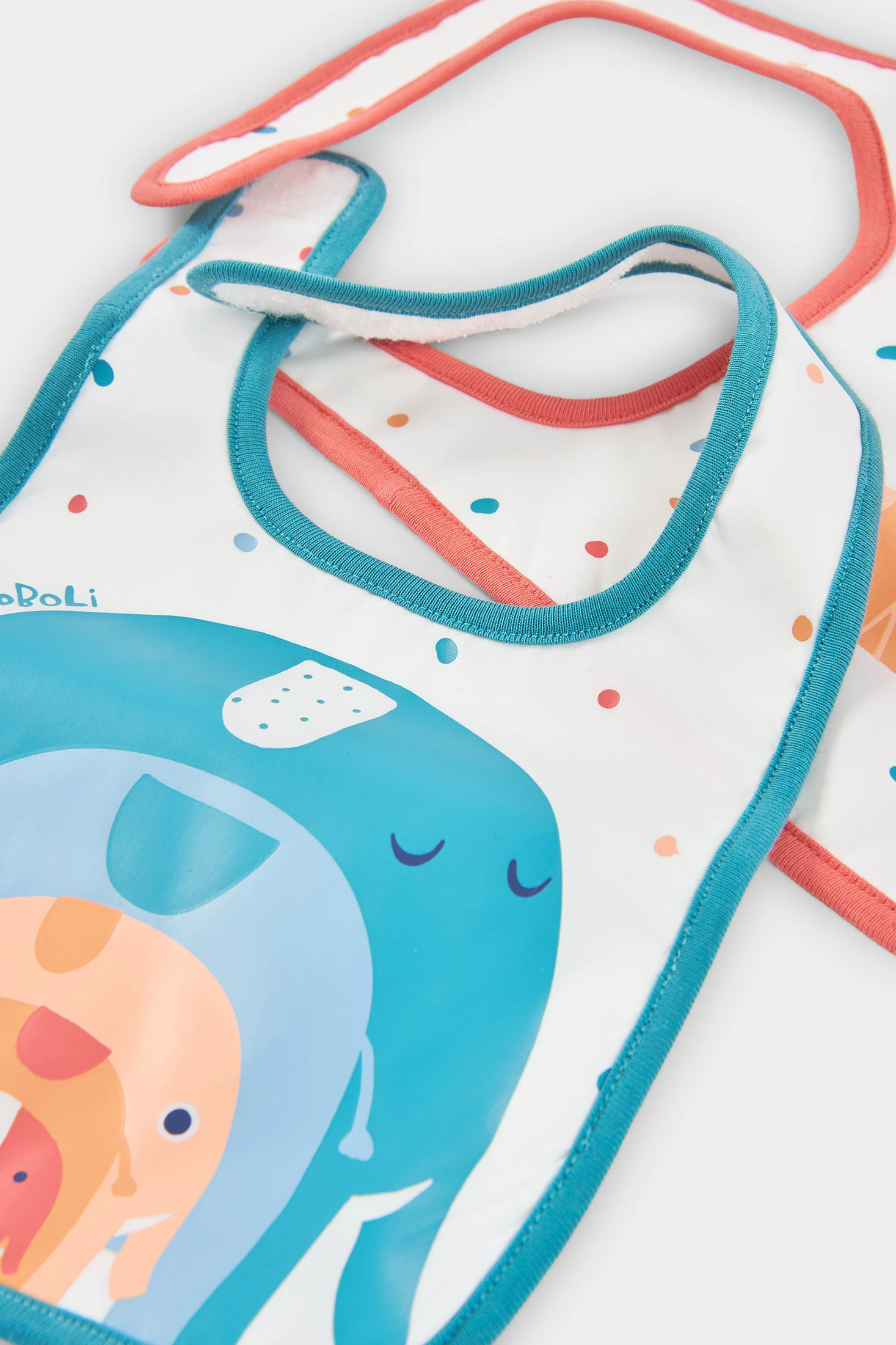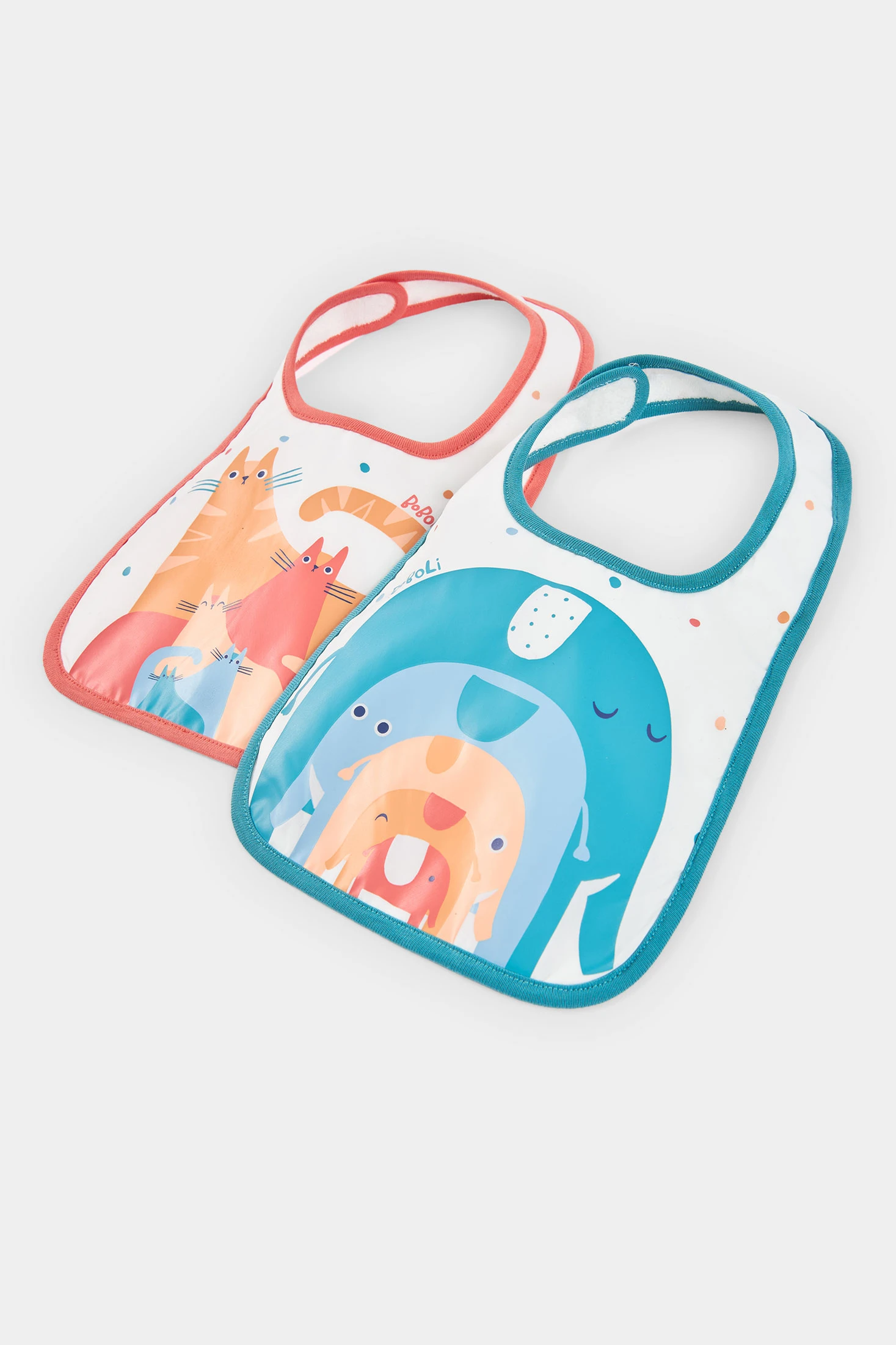 Pack of 2 white cotton bibs, ideal for babies. Designed to offer comfort and protection. They feature colourful prints with animals, adding a fun touch. One has a blue edge and the other red, each with different designs. They are perfect for daily use and ensure the baby's clothes stay clean during meals. A practical and stylish option, easy to match with any baby outfit.