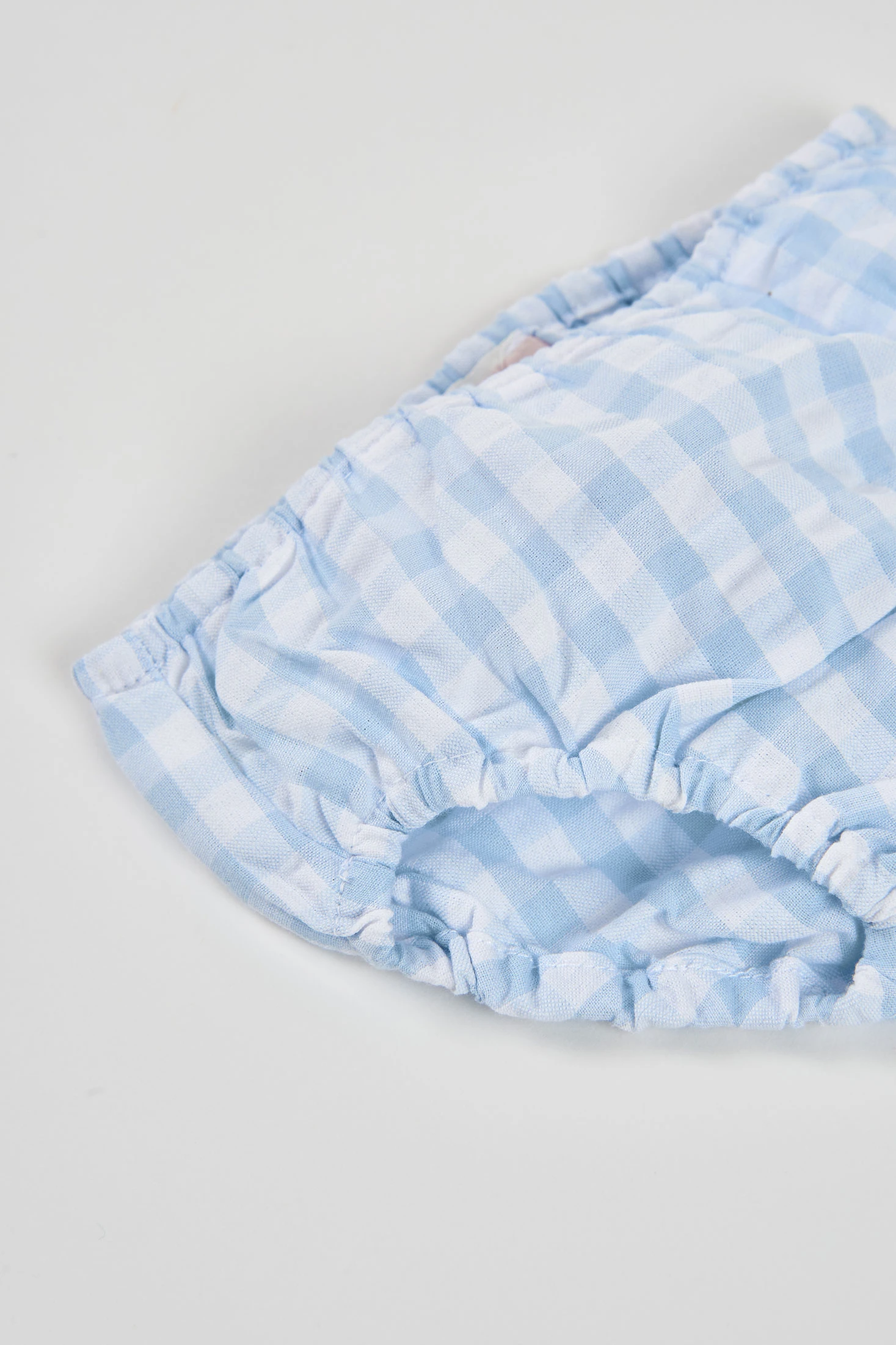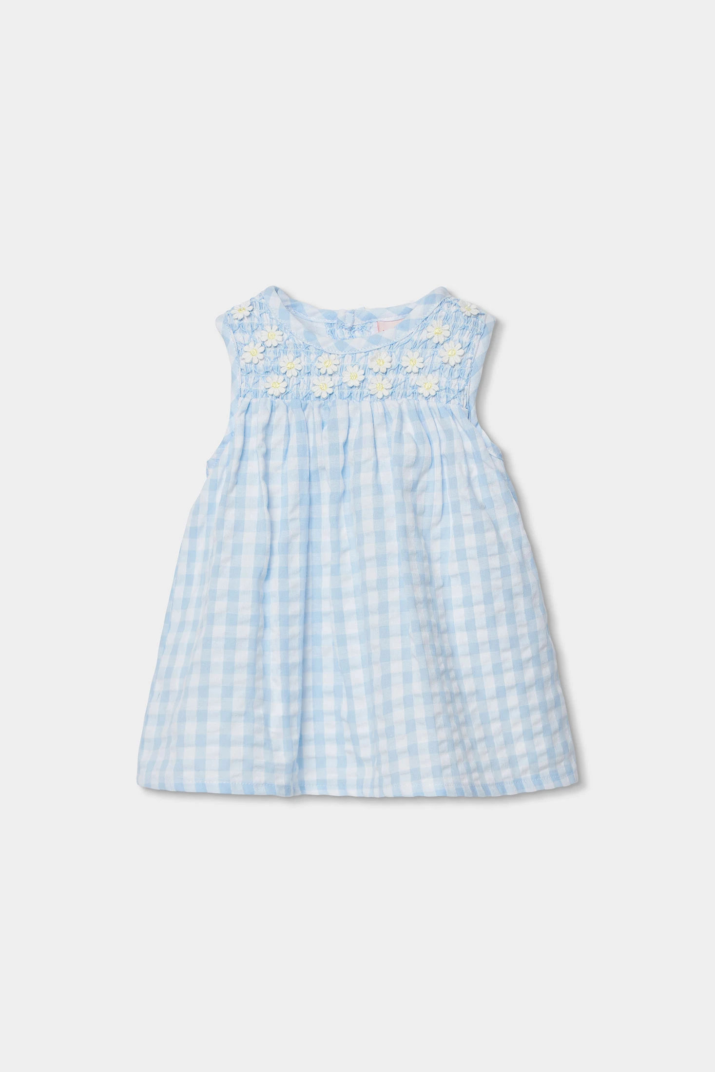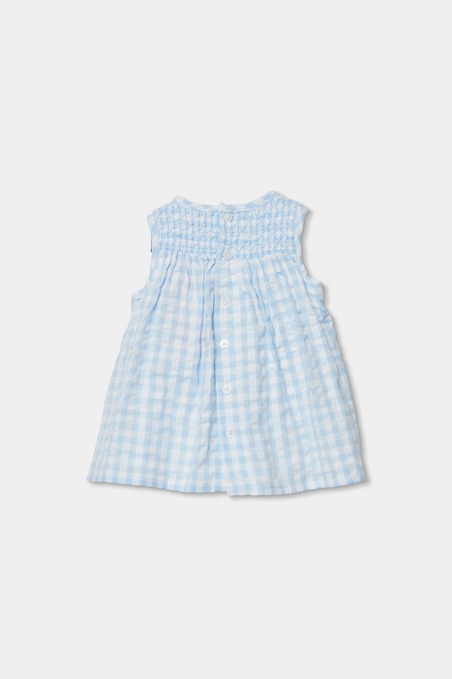 Baby poplin dress featuring a soft blue check design with floral embroidery on the chest. Ideal for warm climates due to its light and fresh material. Available in sizes from 1 month to 2 years, it perfectly adapts to the growth of the little ones. Sleeveless and with a loose fit, it offers comfort and freedom of movement. Perfect for special occasions or outdoor outings, adding a touch of freshness and charm to your baby's wardrobe.