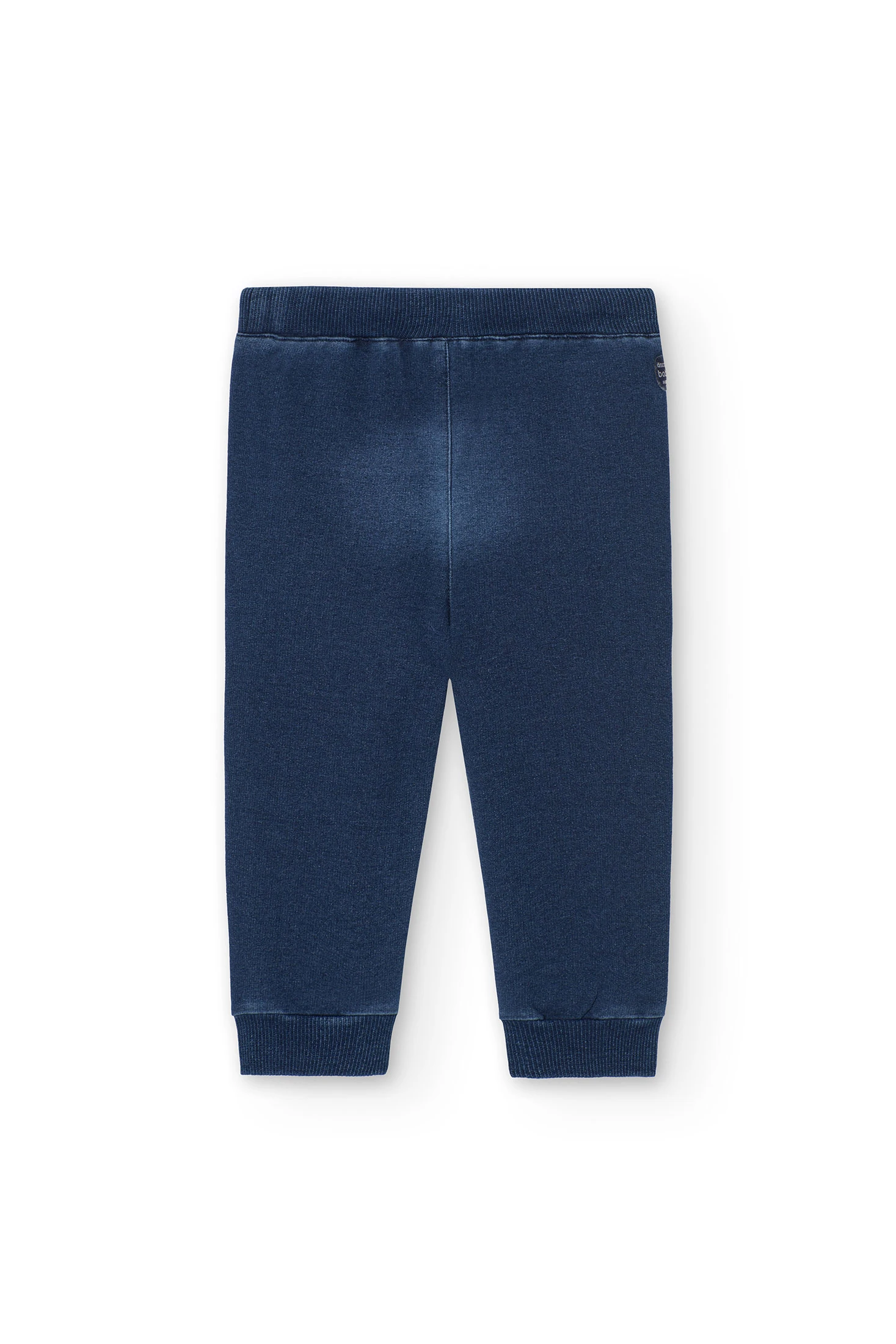 This is a plain denim fleece trouser for baby boys. It's a perfect piece for in-between seasons. The fabric is knitted, providing comfort and flexibility for your little one's adventures. The design is simple and smooth, making it a versatile addition to any wardrobe. It comes in a vibrant blue colour, adding a playful touch. Available sizes range from 12 months to 8 years, ensuring a good fit as your child grows. This trouser is not only stylish but also practical, making it an essential item for your child's clothing collection.