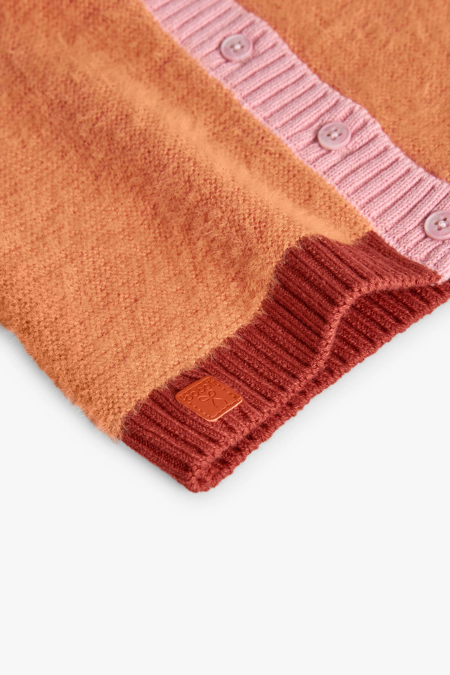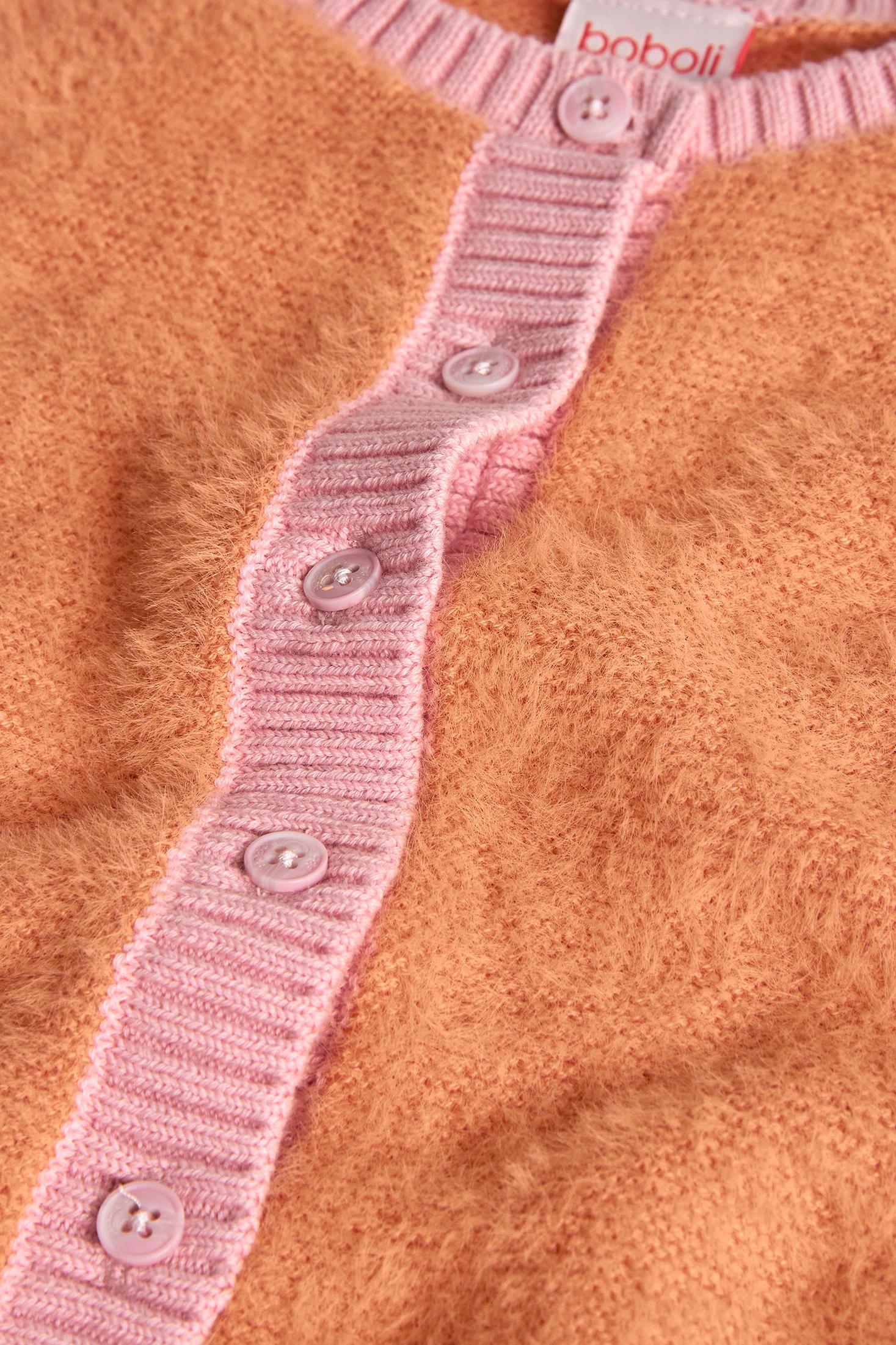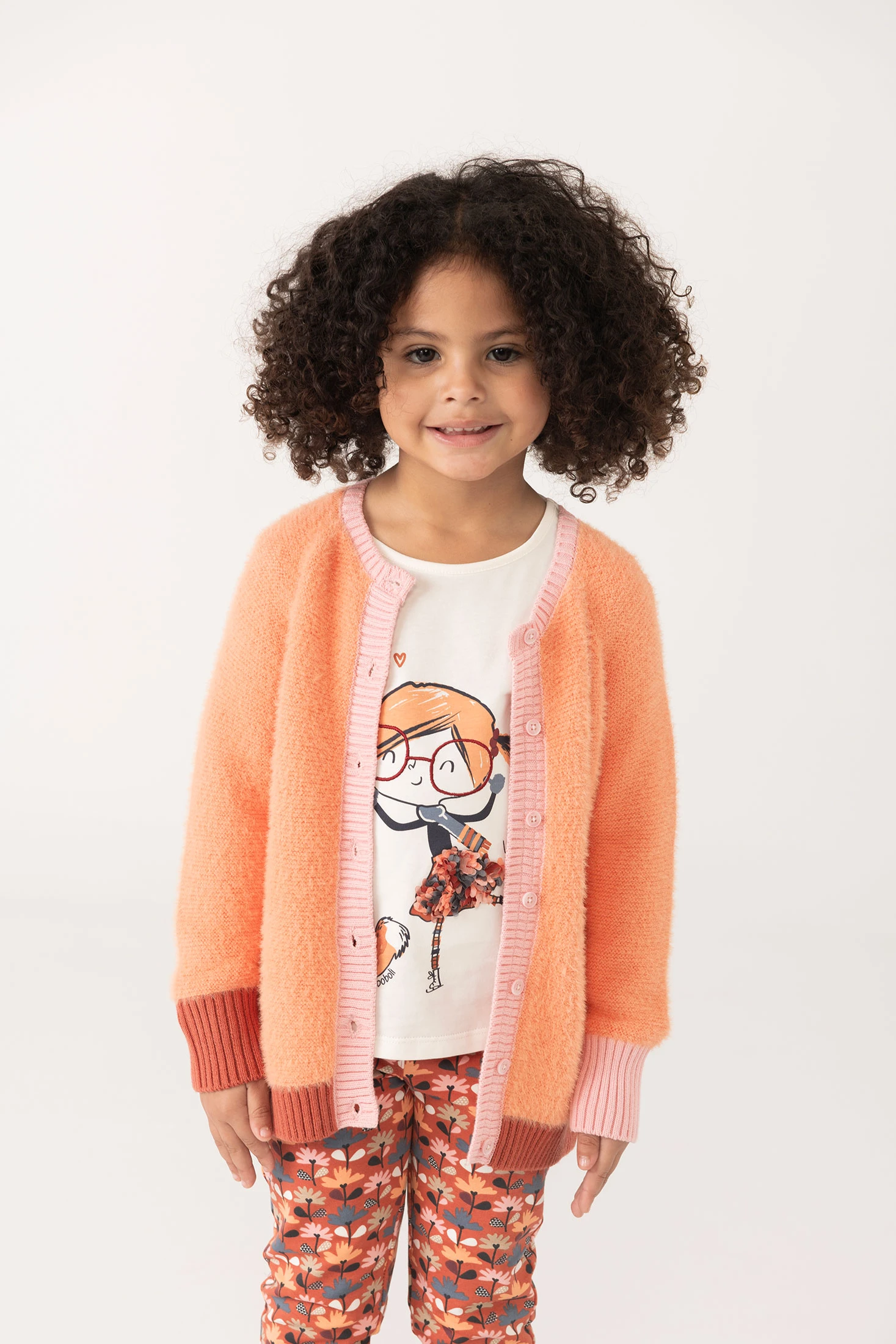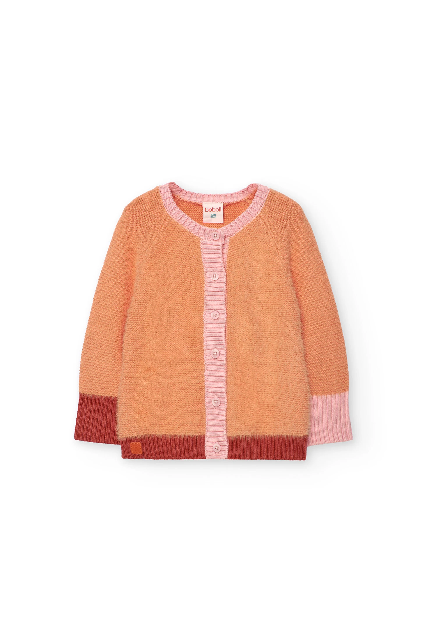 Knitted cardigan for girls in orange, a charming and practical option for children's wardrobe. Crafted from a soft fabric, it ensures comfort and warmth during the cooler seasons. The multicoloured design adds a delicate and attractive touch. Front button fastening for easy wearability. Available in sizes from 12 months to 10 years, it pairs perfectly with trousers or dresses for a sweet and elegant look.