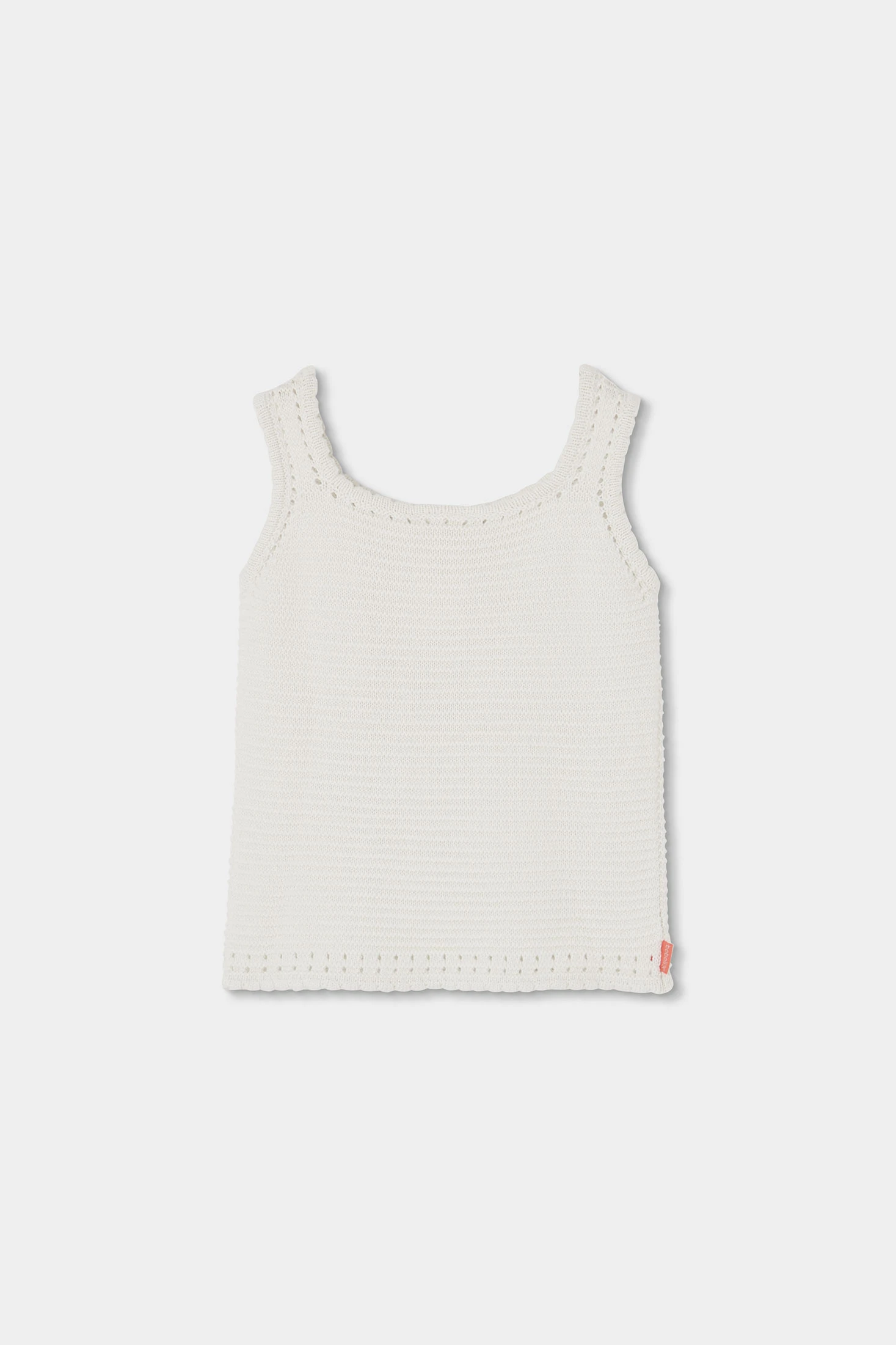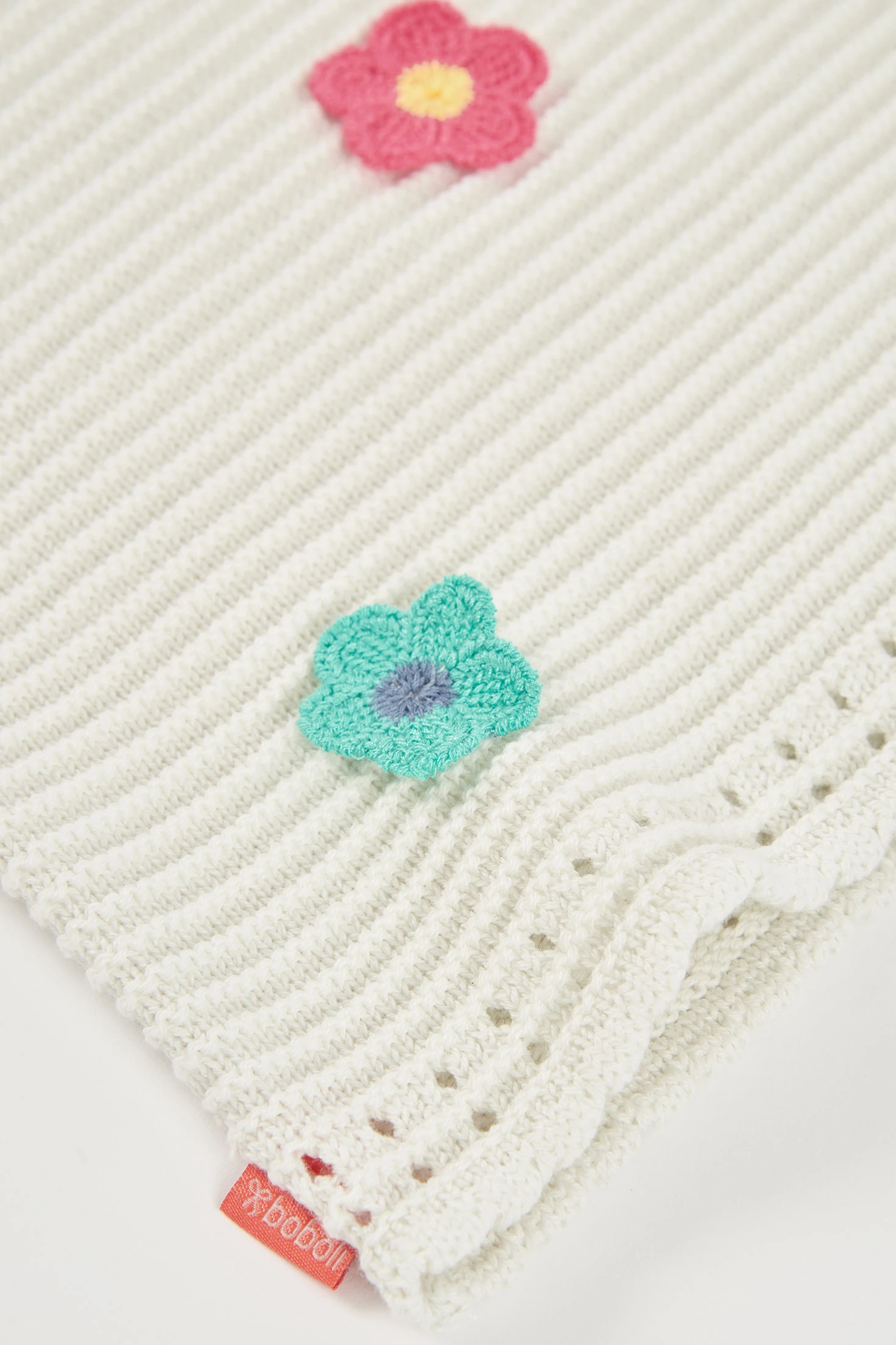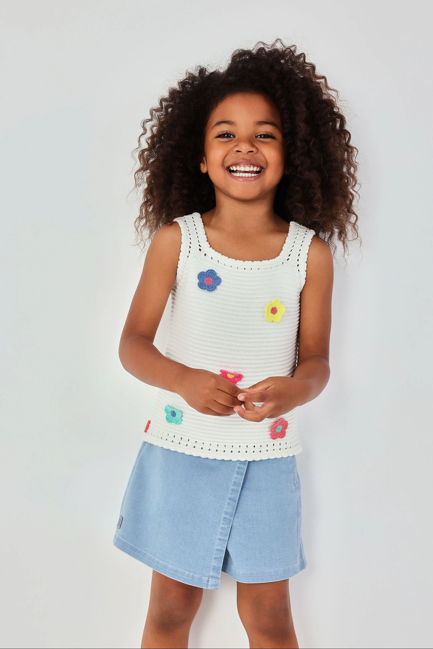 Girl?s top in pearl colour. Made from a knitted cotton fabric, it offers comfort and flexibility. It features a design with crochet flowers applied in various colours. Available in sizes from 12 months to 10 years. Its neutral colour makes it easy to match with different garments, making it a versatile option for everyday wear. Perfect for wearing under a light jacket or with a casual skirt, while always maintaining a fresh and contemporary look.