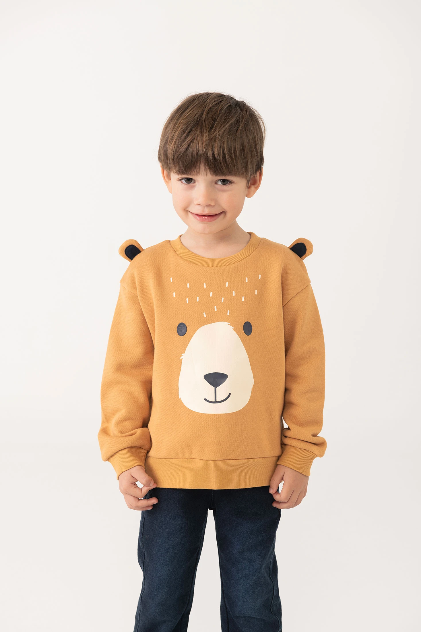 Yellow fleece sweatshirt for boys, designed to provide warmth and comfort during the colder months. Crafted from soft fleece, it ensures an ideal feeling of warmth for autumn and winter. The cheerful yellow colour adds a touch of energy to a child's wardrobe, while its long-sleeve design ensures maximum protection against the cold. Available in sizes from 12 months to 10 years, it is perfect for pairing with jeans or casual trousers for any occasion.