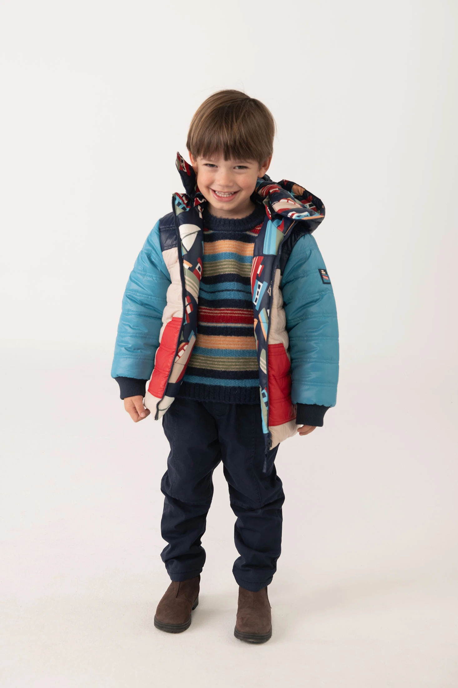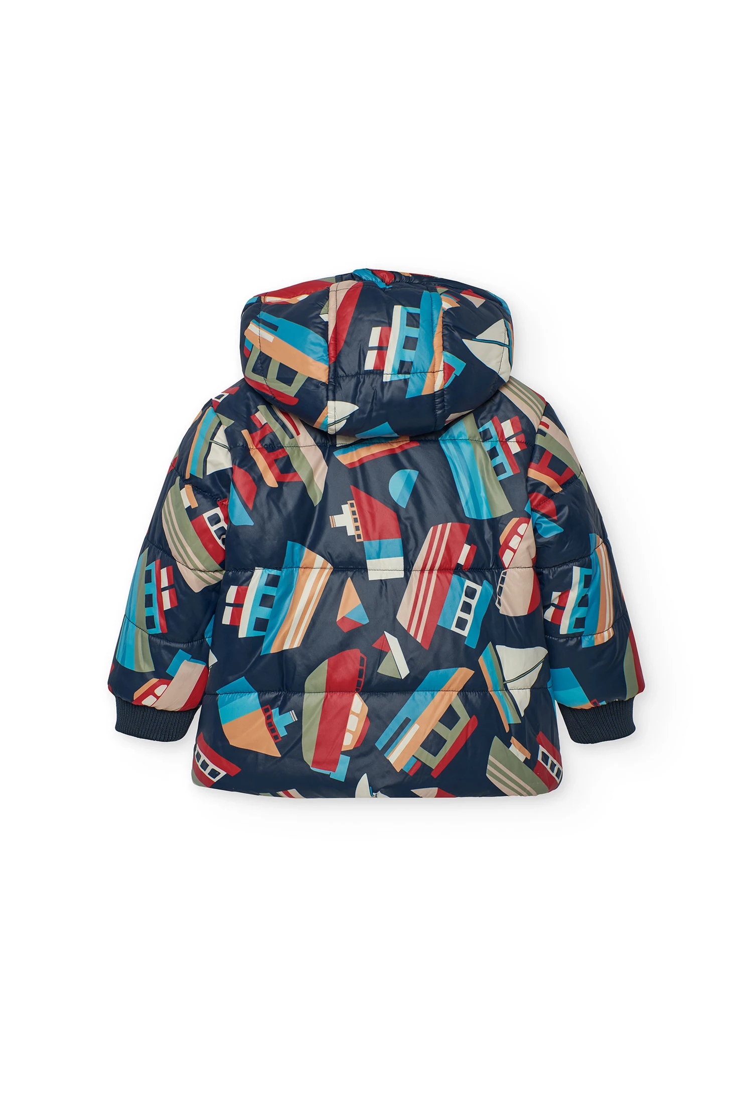 Reversible printed technical fabric parka for boys, an essential versatile garment for children's wardrobe. Crafted from high-quality materials, it ensures warmth and comfort during the autumn and winter seasons. The multi-tonal design allows for varied combinations, alternating styles thanks to its reversible feature. Available in sizes from 12 months to 10 years, it offers options for children of various ages. Perfect for pairing with jeans or casual trousers, it guarantees a modern and functional look for cold days.