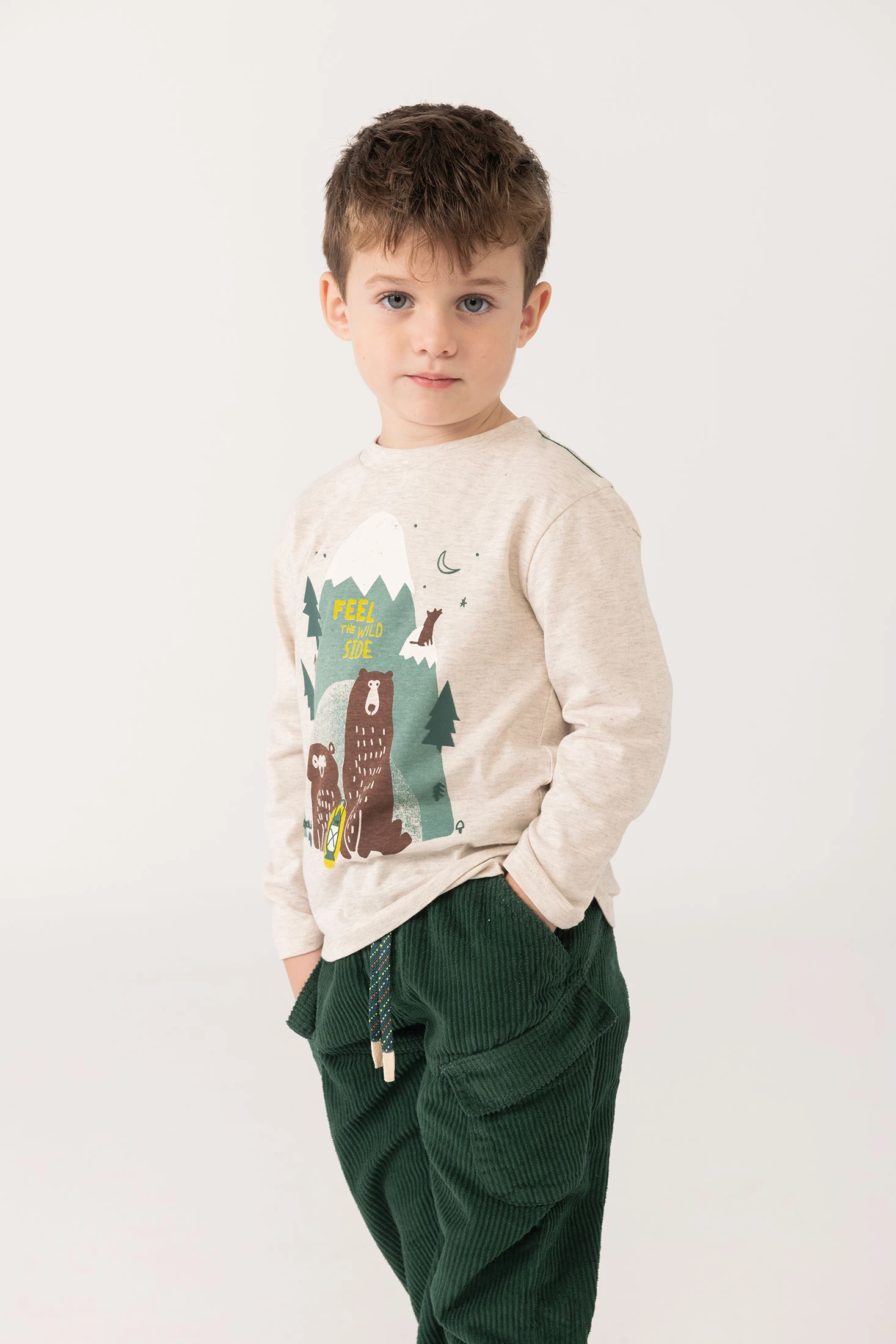 Knitted t-shirt for boys in beige, featuring a charming print of bears and mountains, ideal for an adventurous look. Perfect for the autumn and winter seasons, it is made from a soft fabric that ensures comfort and warmth. Available in sizes from 12 months to 10 years, its round neck design facilitates everyday wear. It can be easily paired with neutral-toned trousers or jeans, offering a versatile and stylish outfit. An ideal choice for parents seeking a balance between functionality and style for their children.