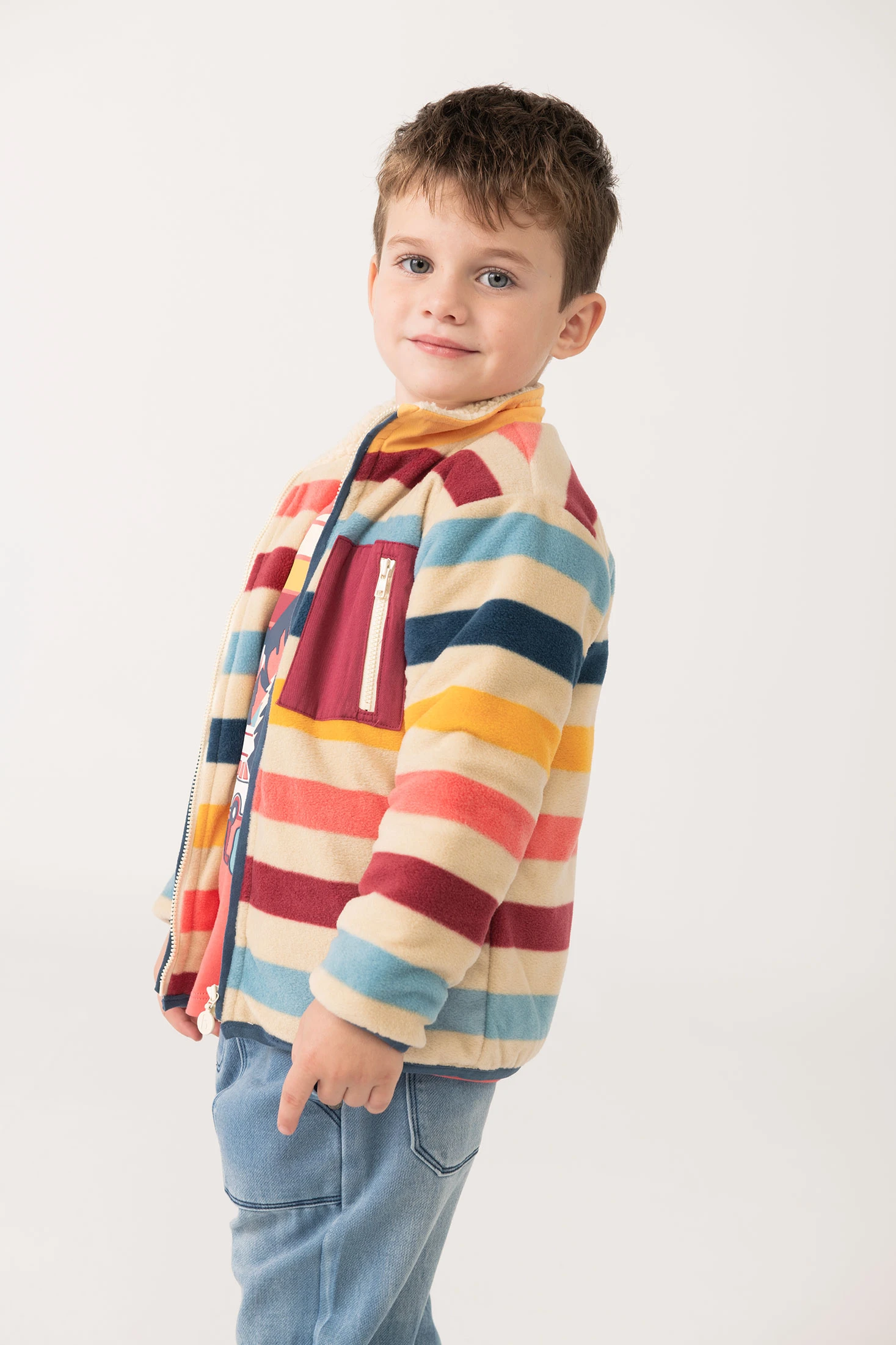 Striped fleece jacket for boys in various colours, ideal for the colder months due to its warm construction. Made from a soft and cosy fleece material, it provides comfort and warmth to your little one. Available in a range of sizes from 12 months to 10 years, ensuring a perfect fit. The modern design allows it to be paired with trousers in neutral or bright tones, creating charming outfits. An essential garment in your little one's wardrobe that balances style and functionality.