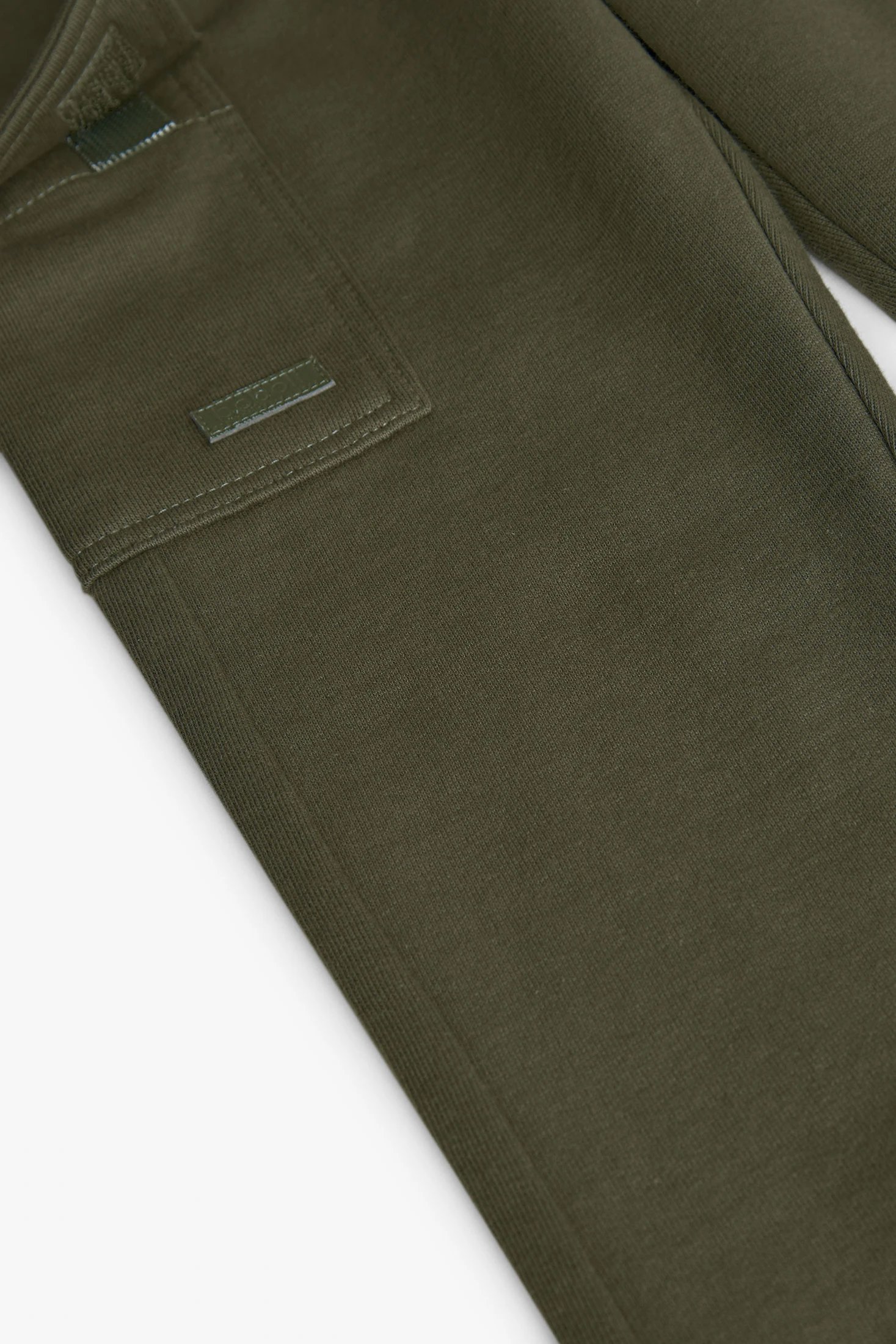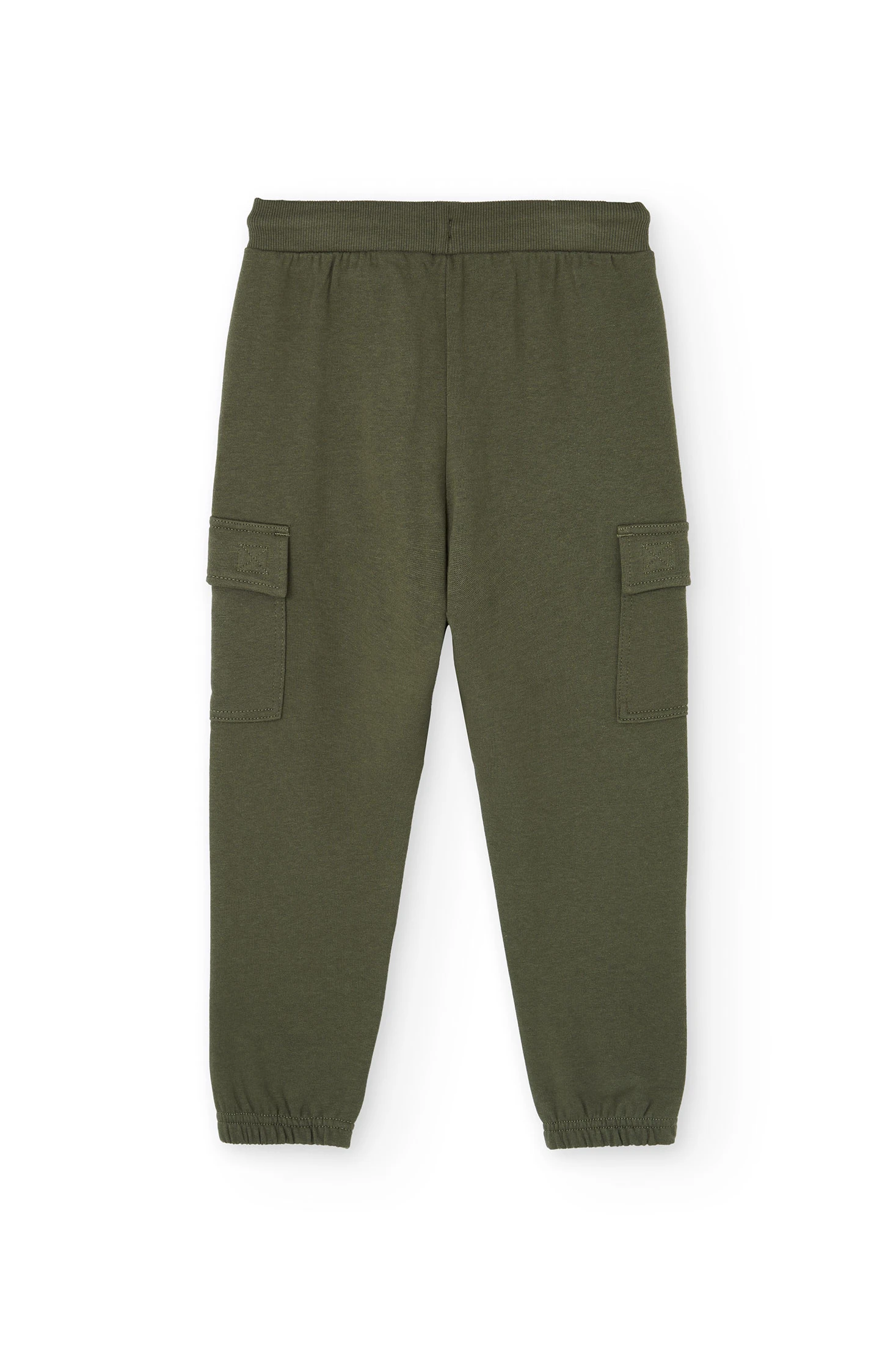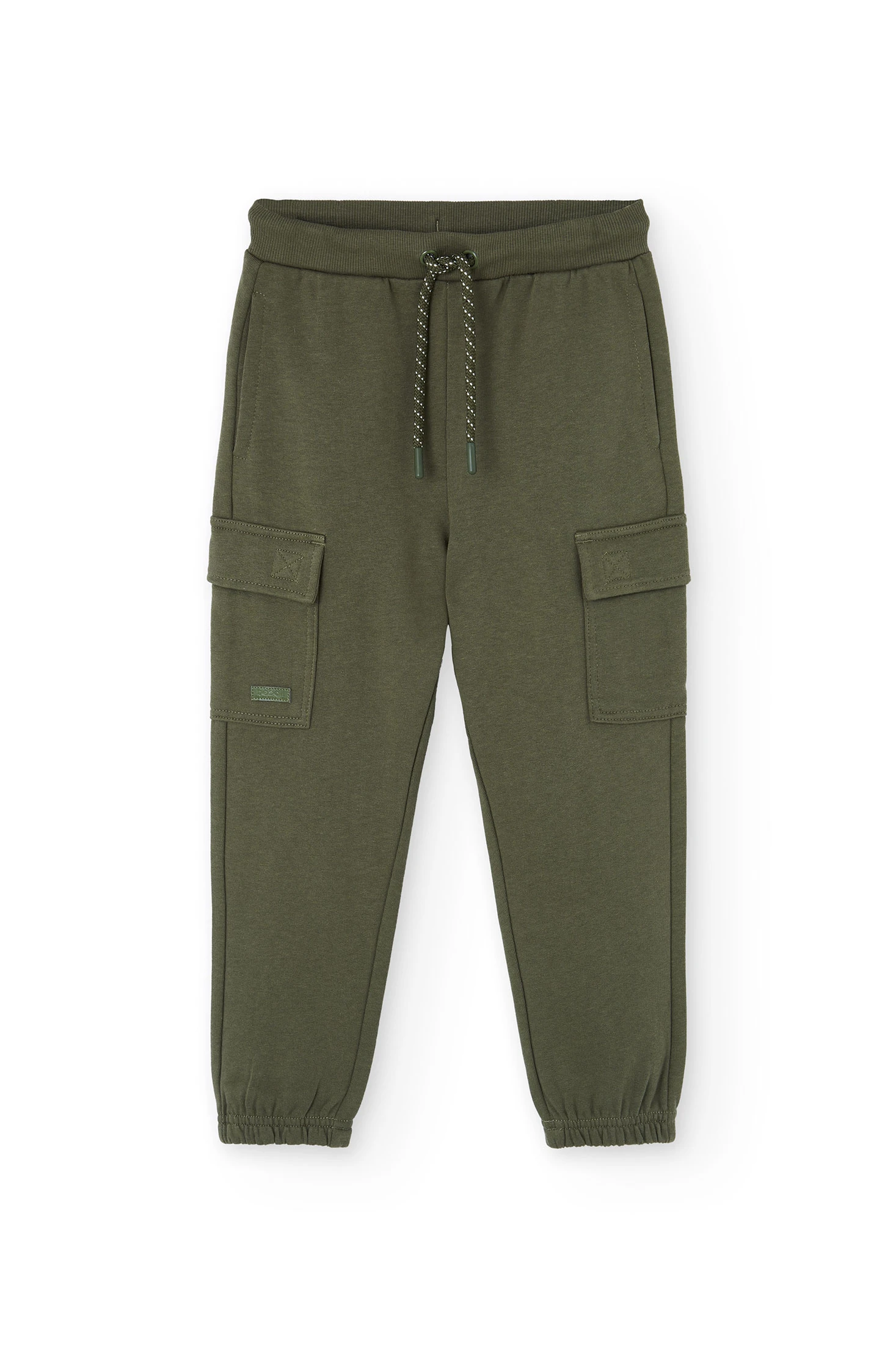Green fleece trousers for boy, ideal for the autumn and winter months thanks to their warm and cosy fabric. In an olive green shade, this model features a functional design that includes side pockets and an adjustable waistband with a drawstring for an optimal fit. The elastic cuffs at the legs provide a modern and comfortable style. Available in sizes from 2 to 14 years, these trousers are perfect for everyday wear and easily pair with t-shirts and jumpers for a casual and relaxed look.