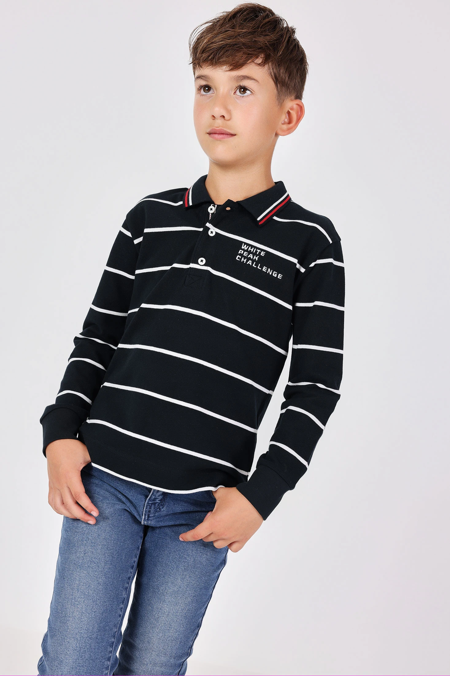 Striped knit polo in black for boys, a versatile and elegant garment, perfect for the autumn and winter seasons. Made from a soft and warm knit fabric, it ensures comfort throughout the day. Its black tone makes it easy to match with various garments, making it ideal for both casual and more formal occasions. Available in sizes from 2 to 14 years, this polo is a smart choice to dress your little one with style and comfort. Pair it with canvas trousers or jeans for a versatile and modern look.