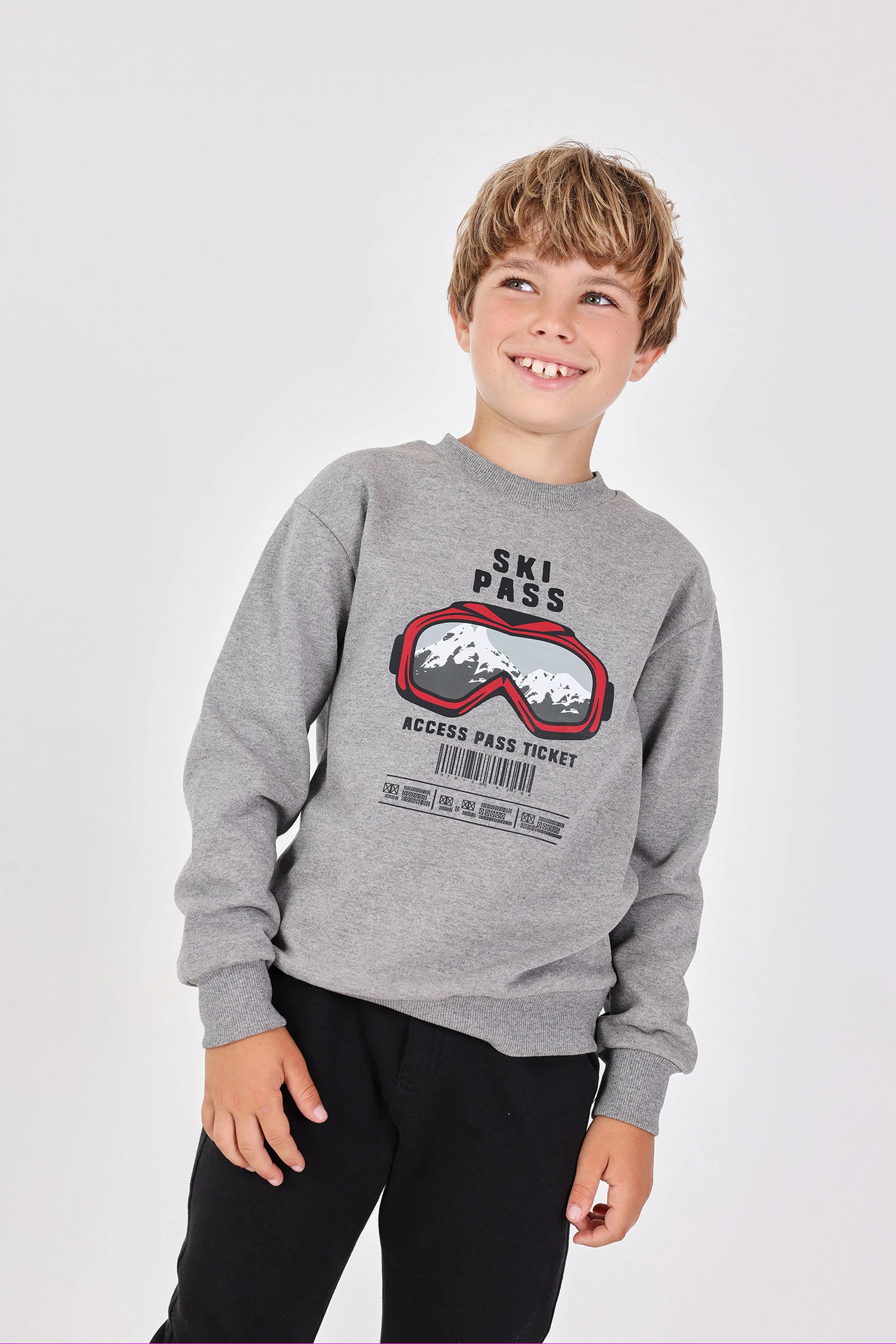 Grey fleece outfit for boy snow goggles