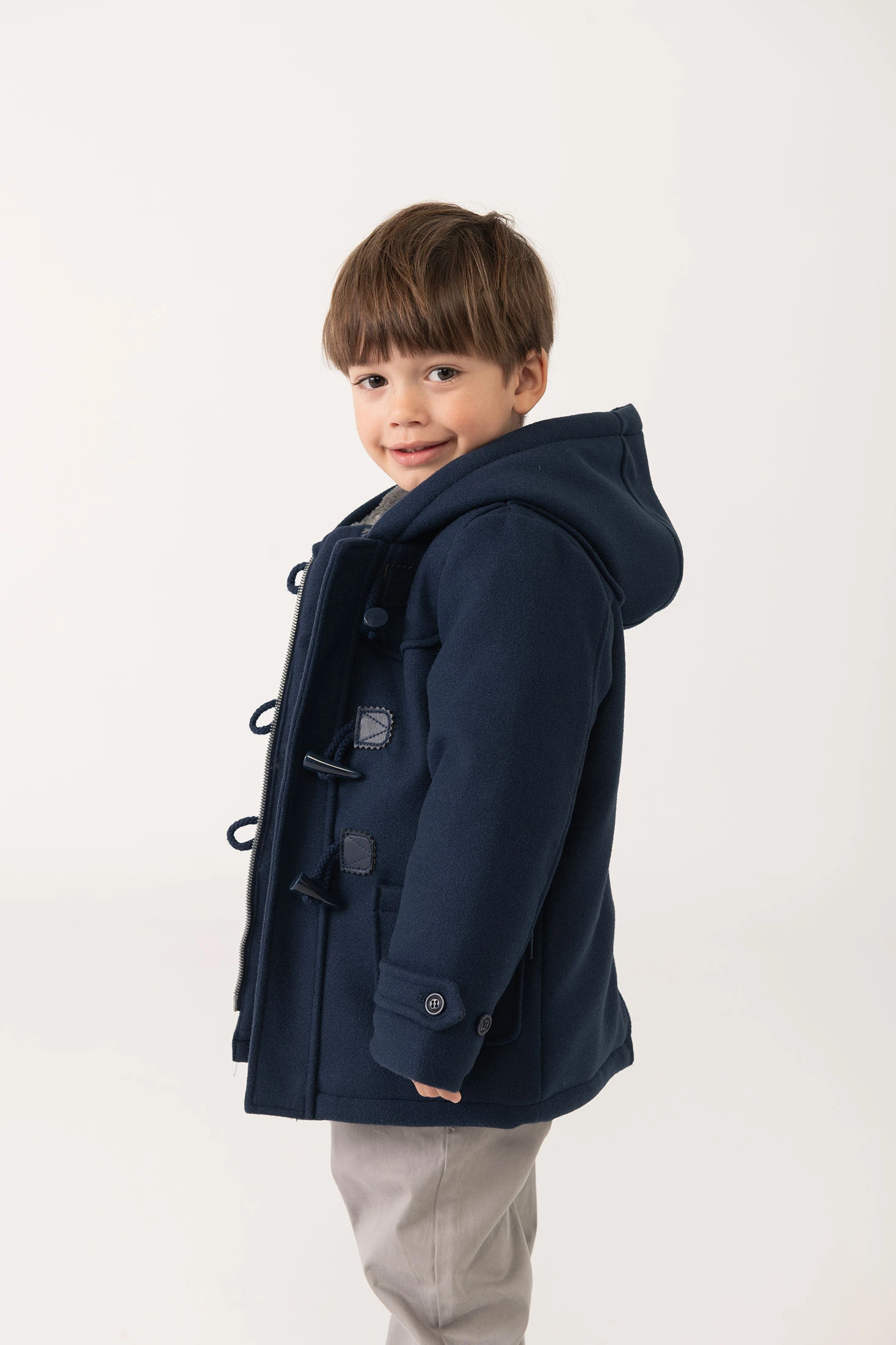 Navy blue duffle coat for boys, ideal for the winter season, offers an excellent combination of warmth and style. Made from high-quality fabric, its design features classic toggle fastenings and a lined interior ensuring maximum comfort. An integrated hood provides additional coverage against cold, while long sleeves retain body heat. Available in sizes from 12 months to 10 years, this duffle coat suits various stages of childhood growth. Its elegant navy hue allows for easy combinations, offering a sophisticated and practical look for any occasion.