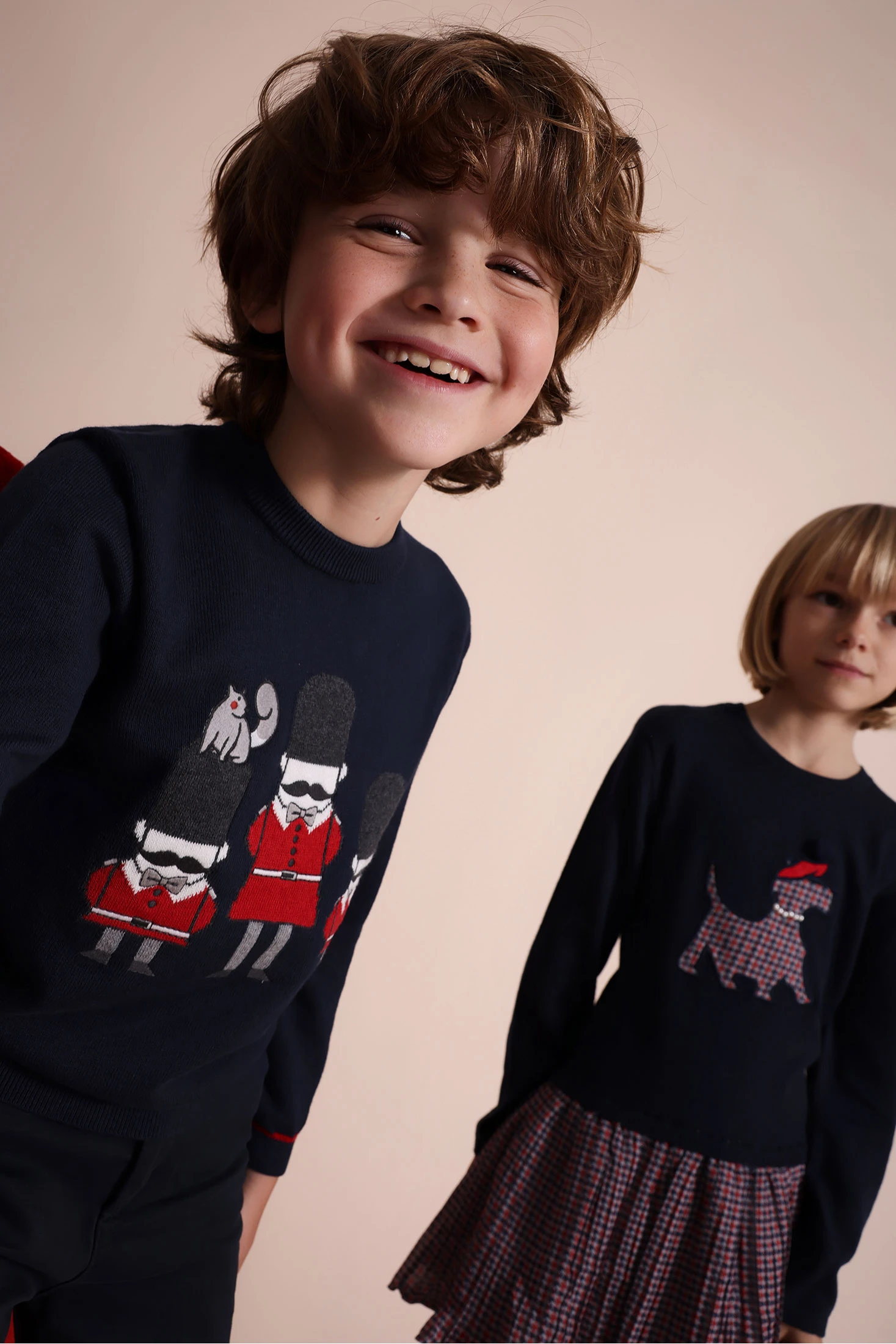 Navy blue knitted jumper for boys, featuring a charming design of guards and an animal on one of them, perfect for the autumn and winter seasons. Made from a soft and warm fabric, it offers comfort for your child's daily wear. It features a round neck and long sleeves, along with two buttons on the shoulder for easy dressing. Available in sizes from 12 months, it is ideal for keeping the little ones warm and stylish during the colder days. Pair it with neutral-toned trousers or skirts for a classic and elegant look.