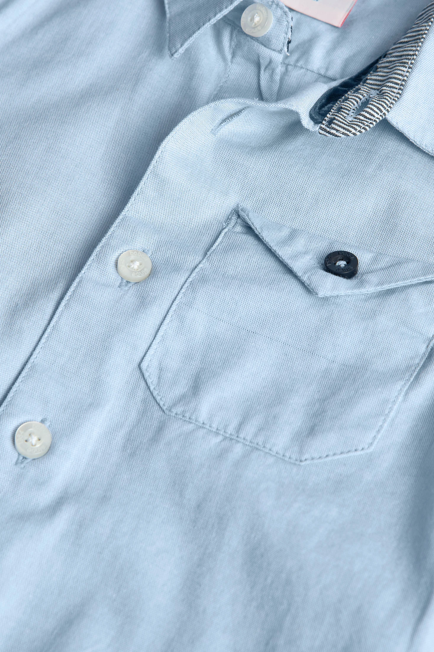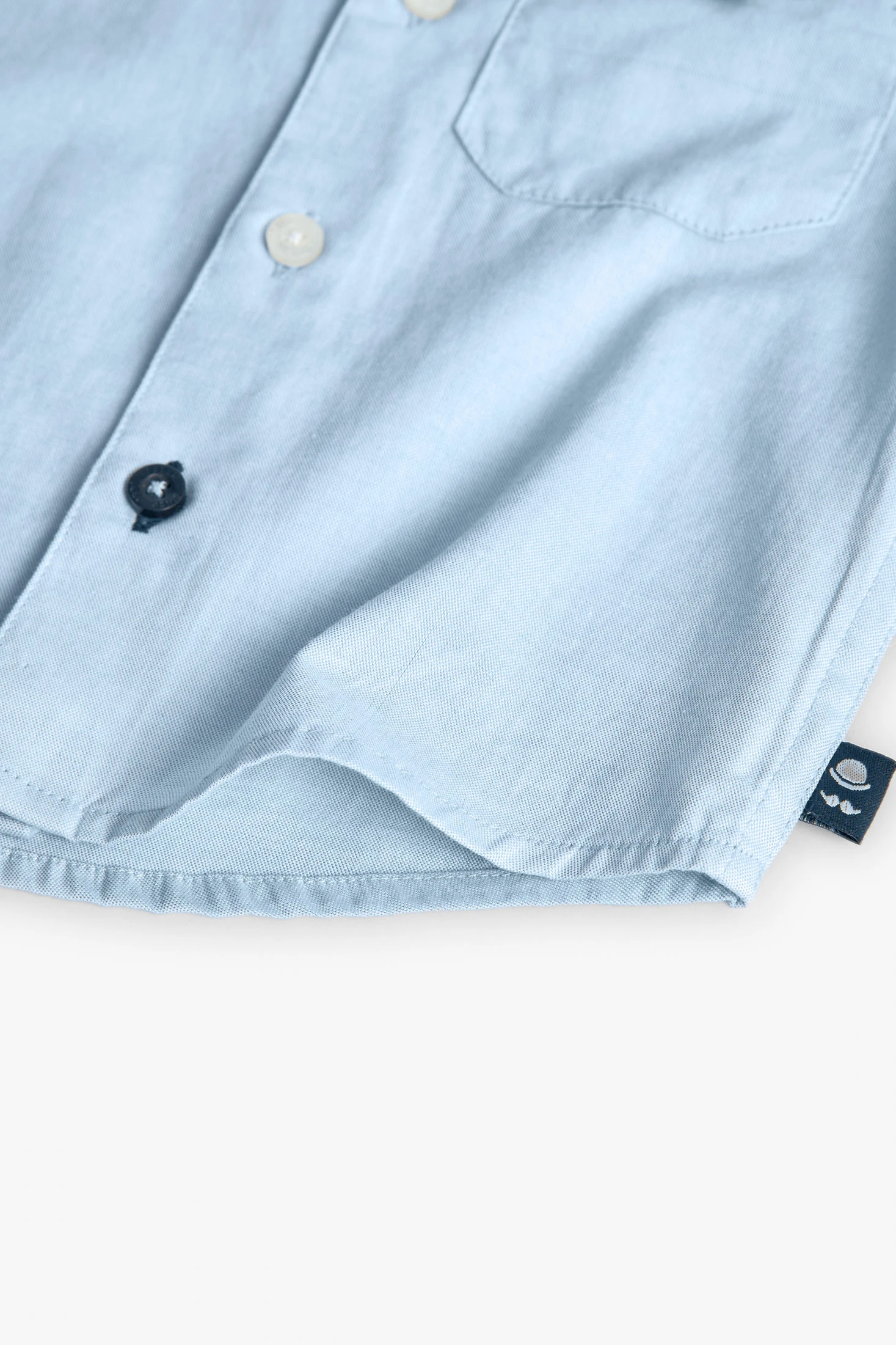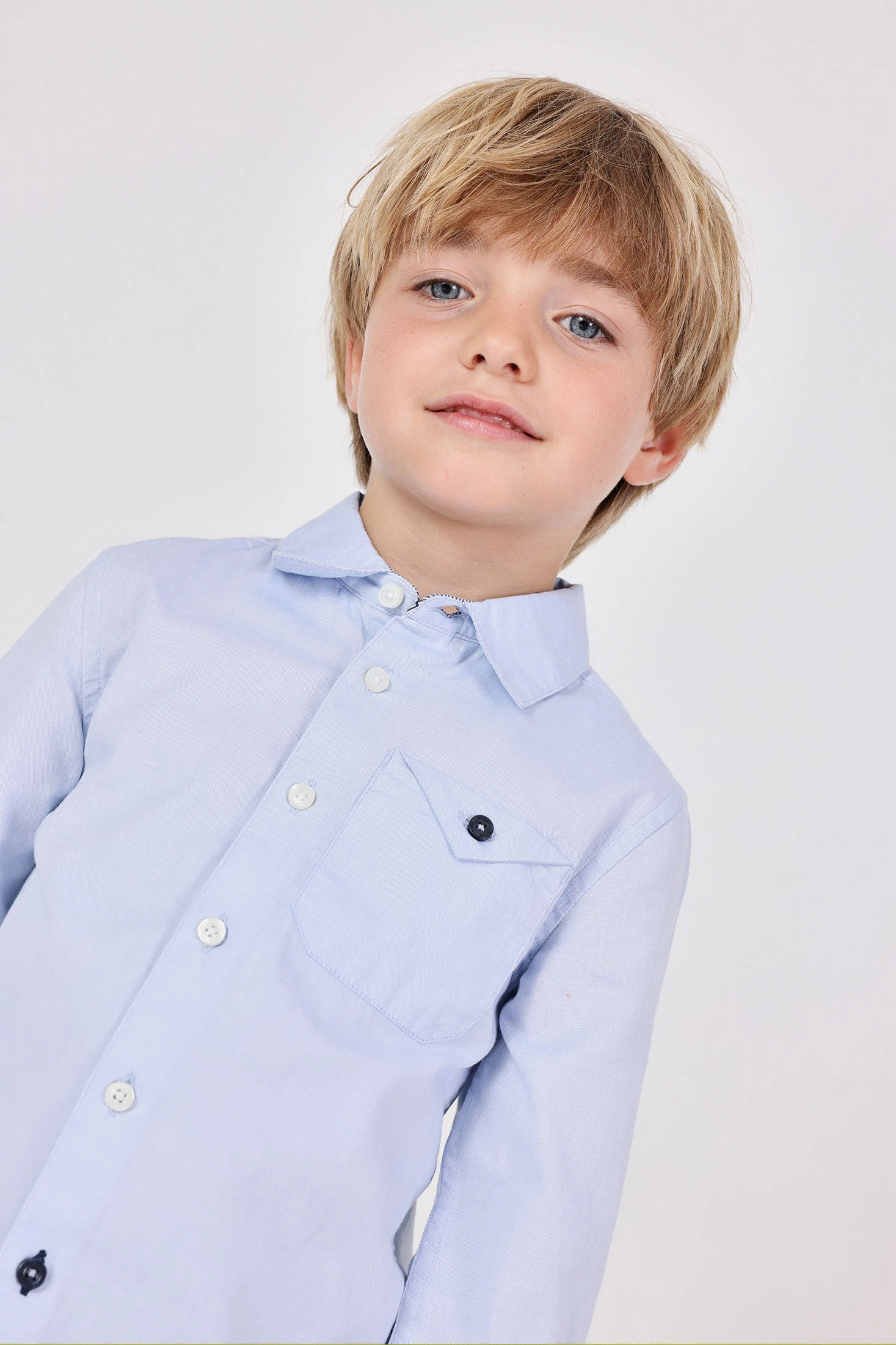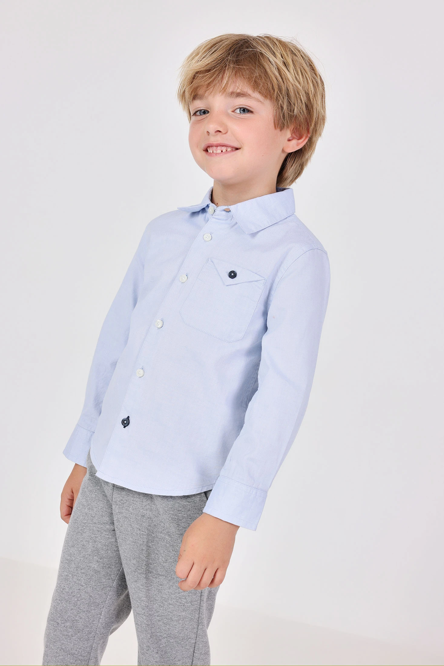 Oxford shirt for boys in light blue, ideal for special occasions and casual events, ensuring comfort thanks to its soft cotton construction. With a delicate design, classic collar, and refined details, it adds a touch of elegance to your little one’s wardrobe. Available in sizes from 12 months, it is perfect for warmer seasons and pairs easily with dress trousers or jeans for a charming look. A practical, elegant, and easy-to-care-for garment for discerning parents.