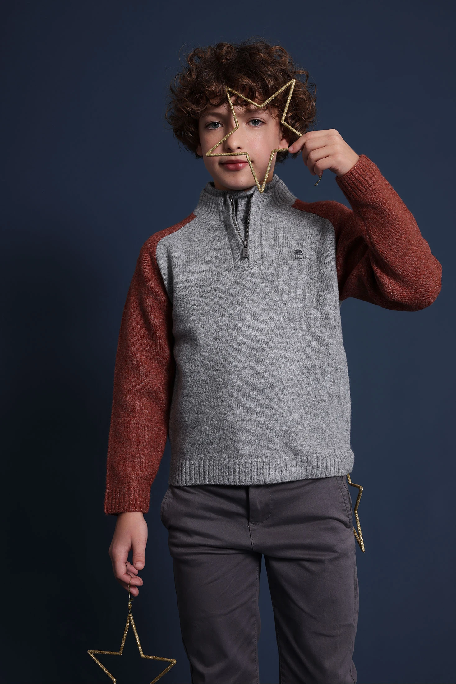 Knitted jumper in grey marl for boys, ideal for the autumn and winter seasons due to its soft and warm fabric. Designed with a sophisticated round neck, it ensures a comfortable and easy fit. Available in sizes from 2 to 14 years, it guarantees your child stays warm and stylish on cold days. Its versatility allows for easy pairing with jeans or chinos, perfect for creating both casual and formal outfits. A basic and essential garment in the children's wardrobe, suitable for any occasion.