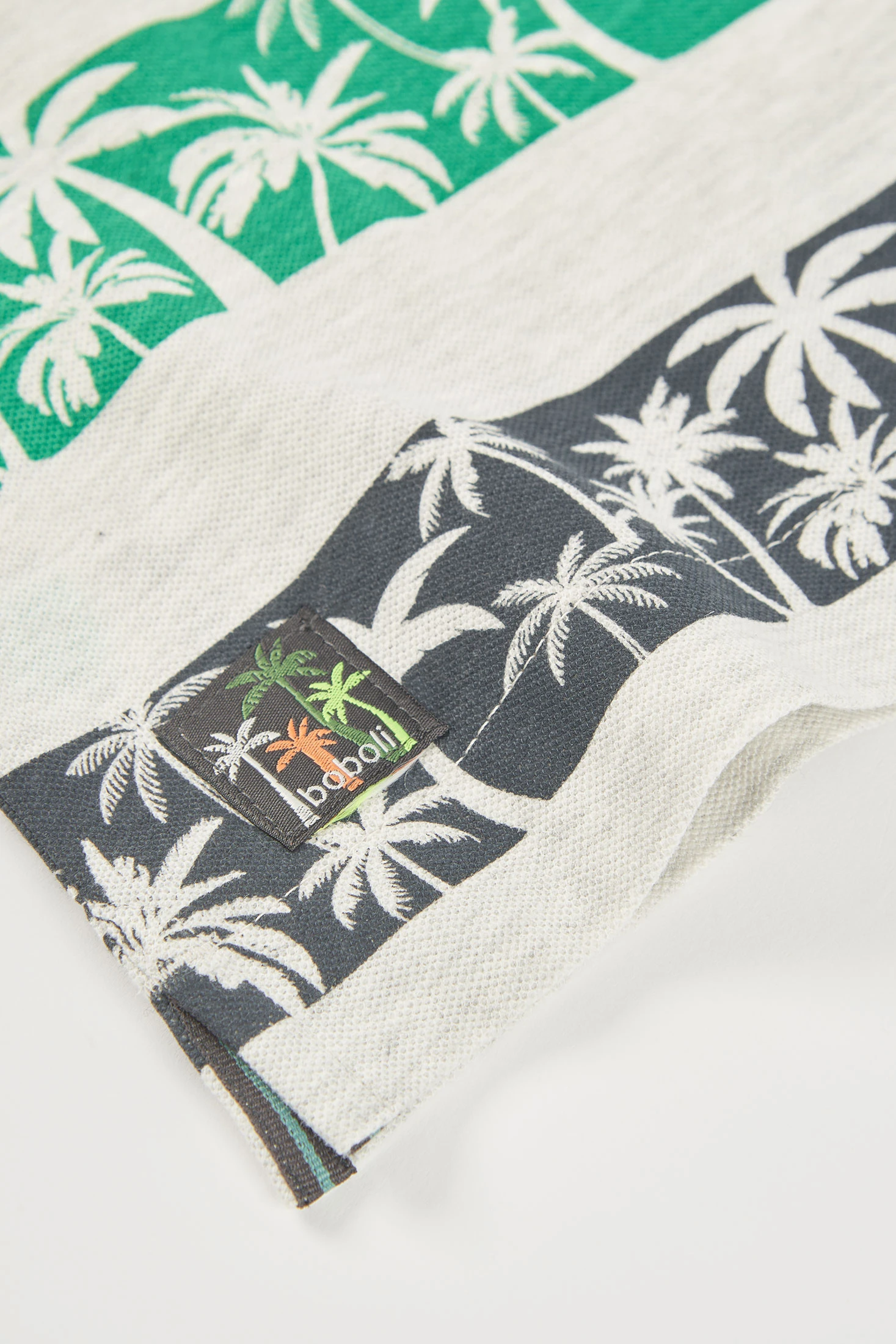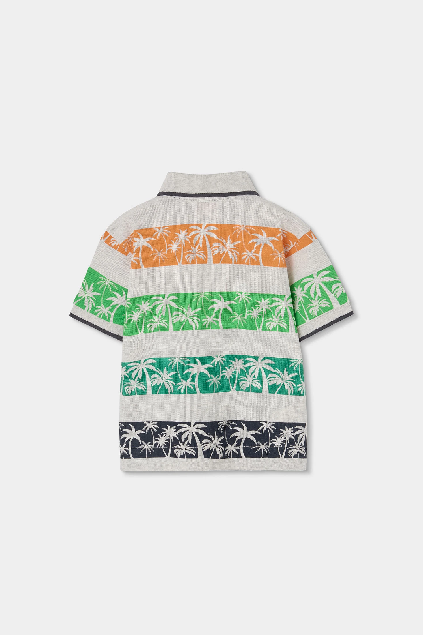 Piqu? polo shirt in raw melange colour, featuring a print of palm trees in vibrant stripes of green, orange, and dark grey. With a short sleeve design and classic collar, it is ideal for warm climates. Available in sizes from 12 months to 10 years, it pairs perfectly with shorts for a fresh, summery look. Its cotton material provides comfort and breathability, being a practical and versatile garment for children's daily wear.