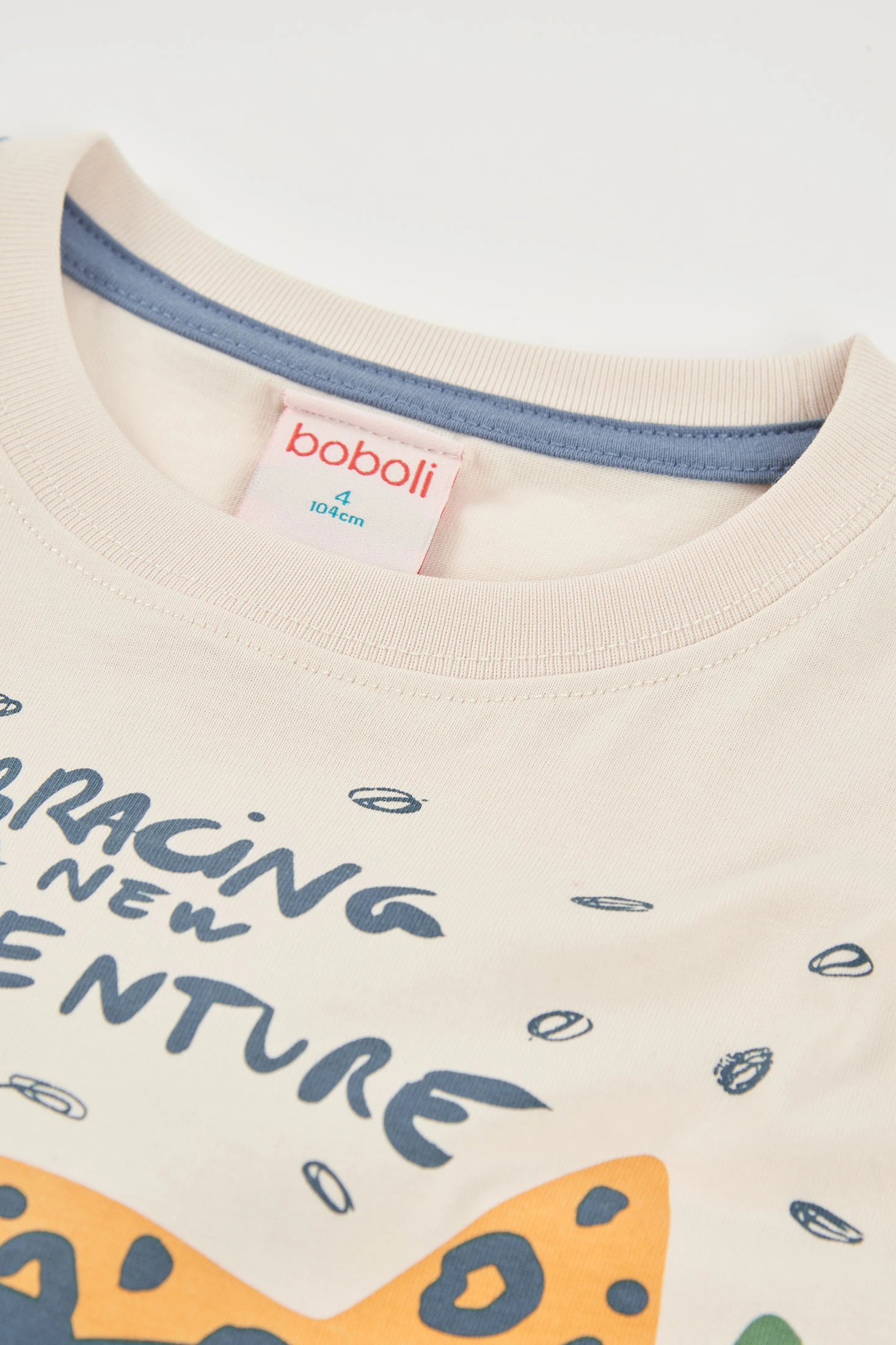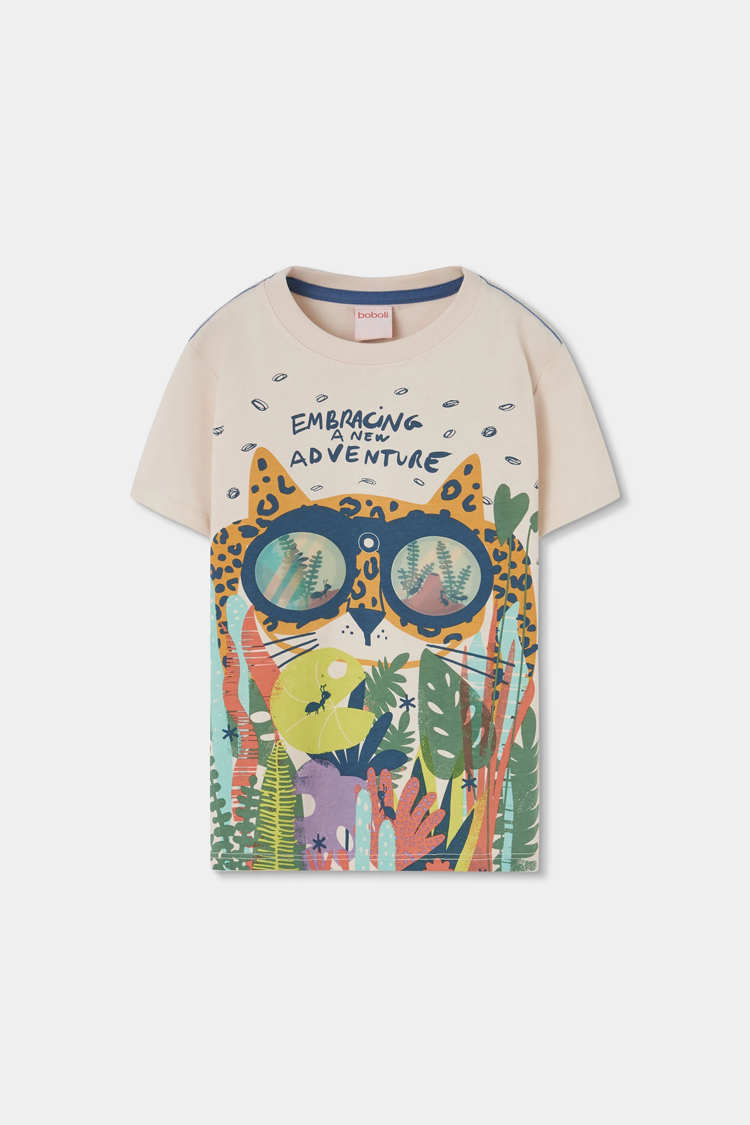 Raw cotton T-shirt for boys, ideal for summer, featuring a cheerful design with a large front print of a leopard with glasses and an inspiring phrase. Its cotton fabric provides comfort and breathability, perfect for daily use. Available in sizes from 12 months to 10 years, it adapts to your little one?s growth. Its neutral colour allows easy pairing with shorts or jeans, making this T-shirt a versatile and fun option for everyday adventures.