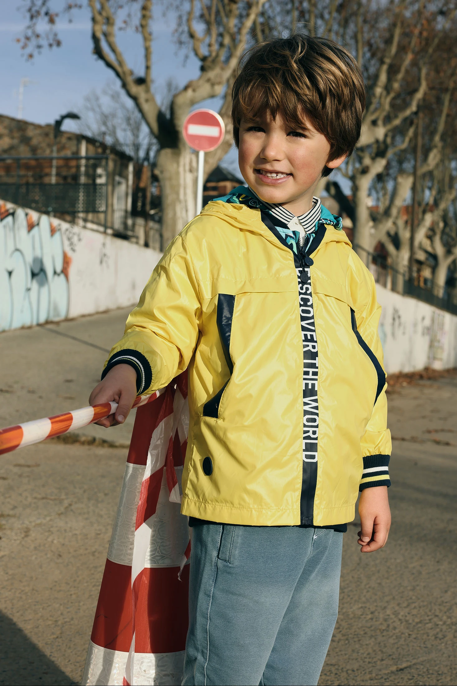 Yellow parka for boys, made with technical fabric, perfect for transitional seasons. It offers protection and comfort, ideal for outdoor activities. Designed for ages 12 months to 10 years, this garment features a hood, zip closure, and navy blue details. A message on the zip adds an adventurous touch. Its versatile style makes it easy to pair for everyday wear.