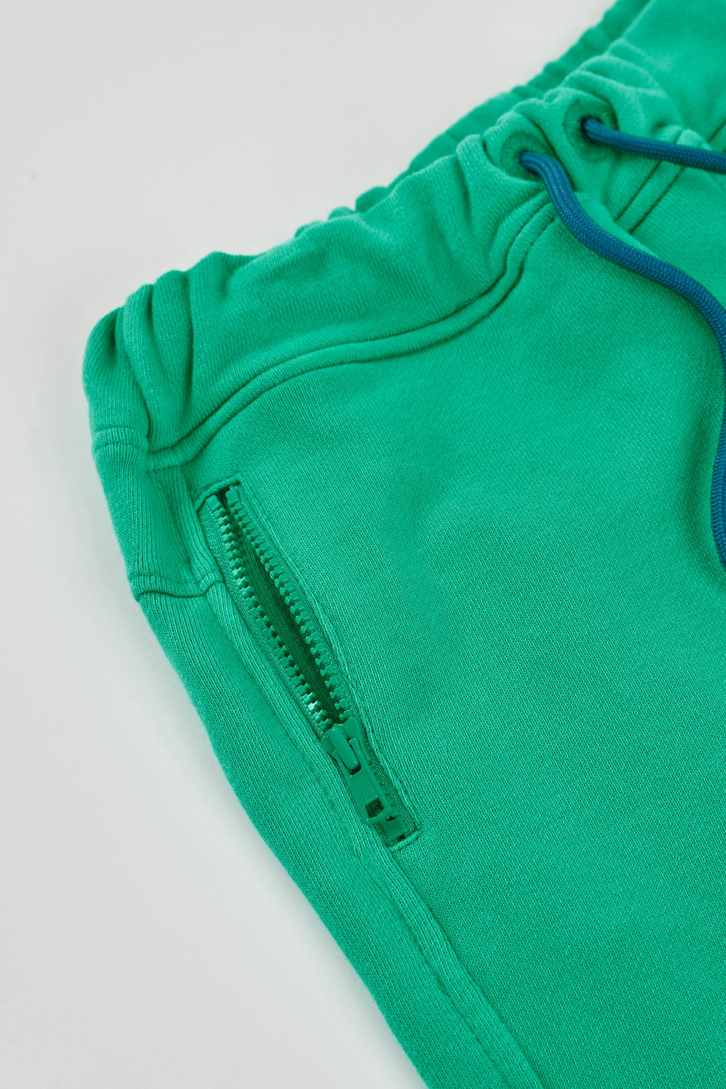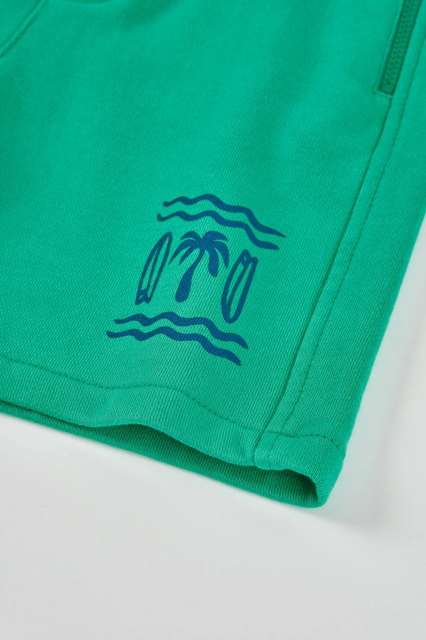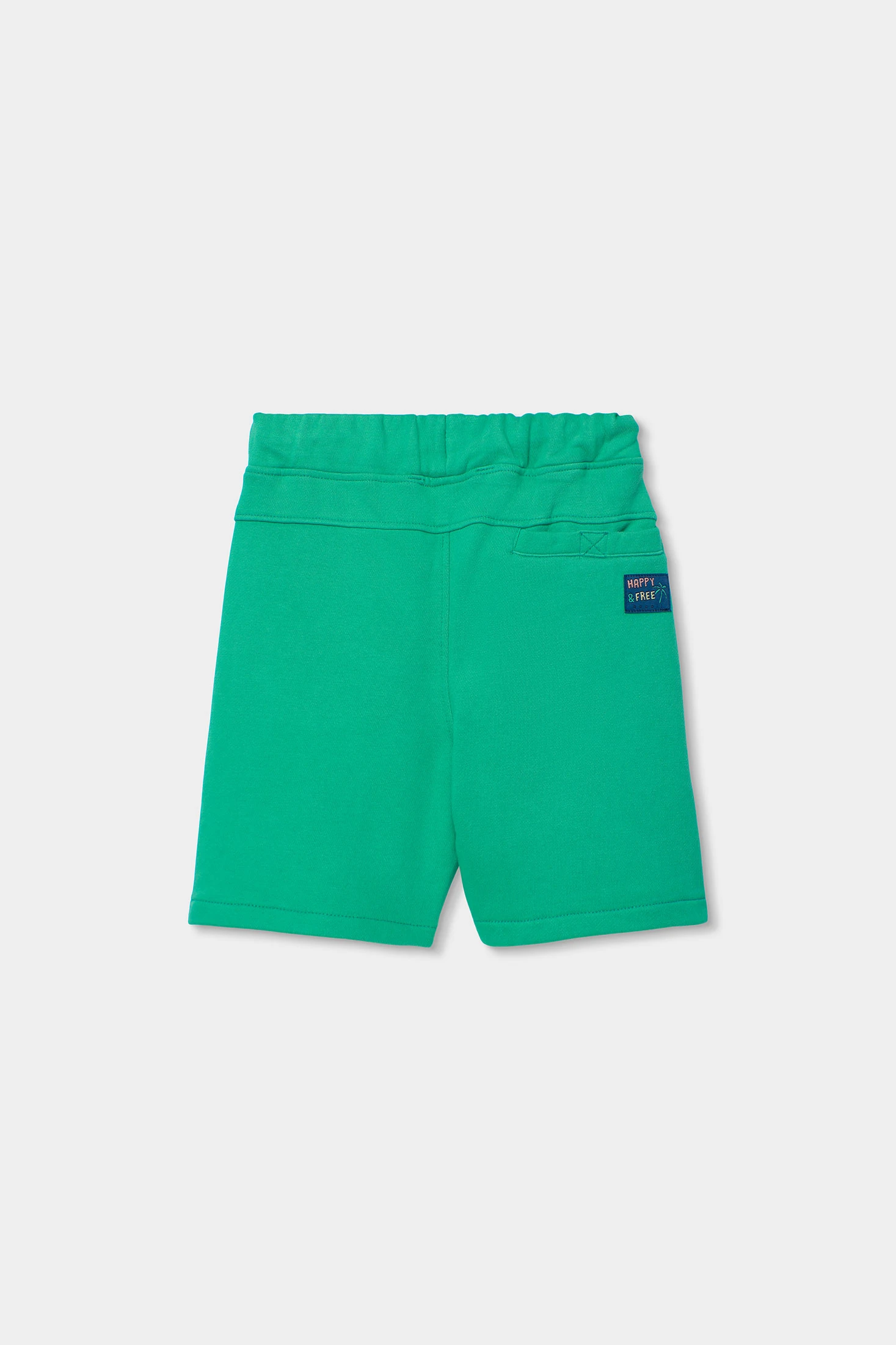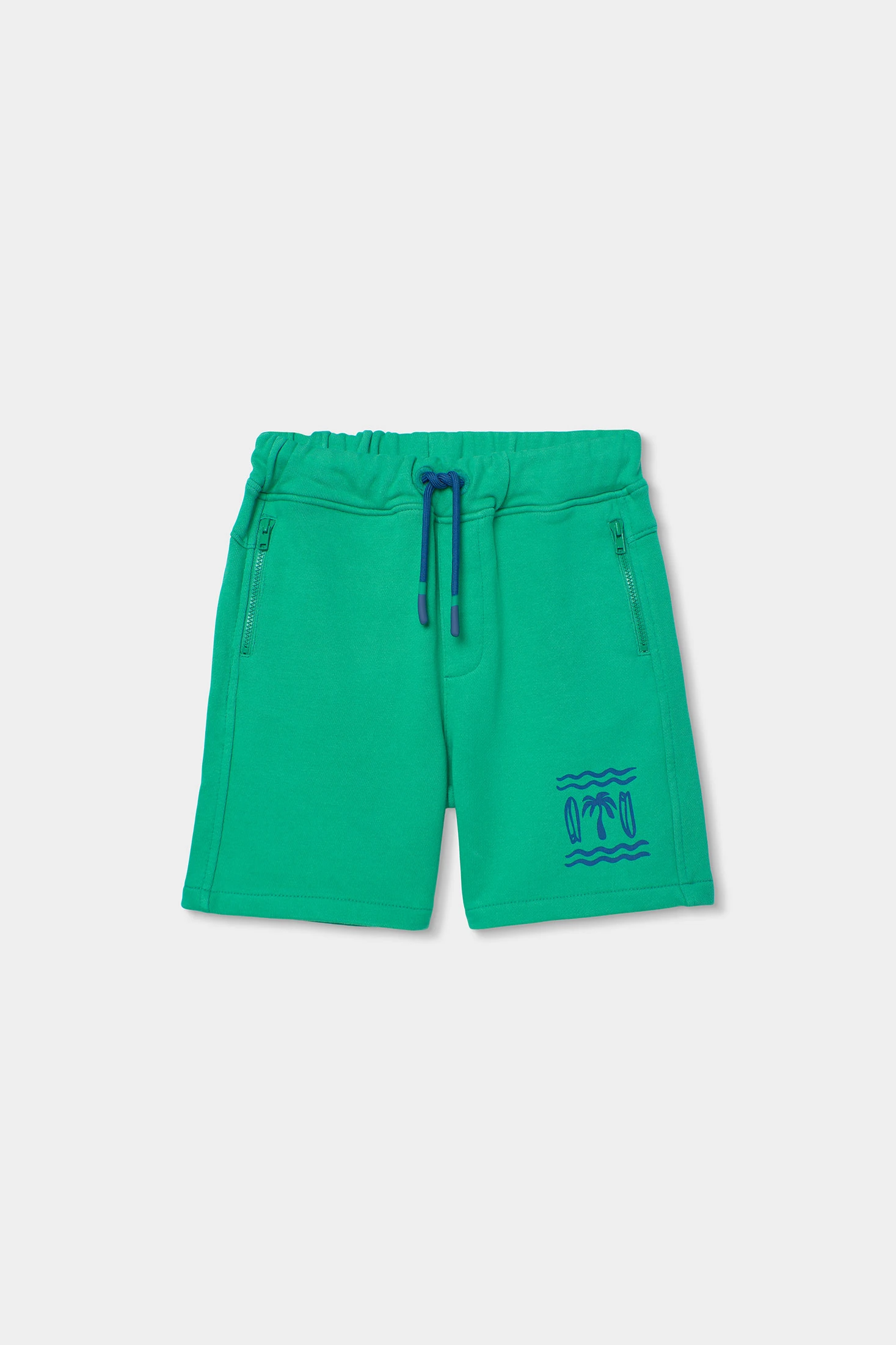 Fleece shorts for boys, perfect for the summer, crafted from soft and comfortable fabric. Presented in a vibrant green colour, they add freshness to any outfit. Featuring a fun print of blue palm trees, ideal for adding a touch of beach style. The adjustable drawstring waistband ensures a perfect fit. Available in sizes from 2 years to 14 years, these shorts are a versatile option to pair with t-shirts or lightweight sweatshirts in warm weather.