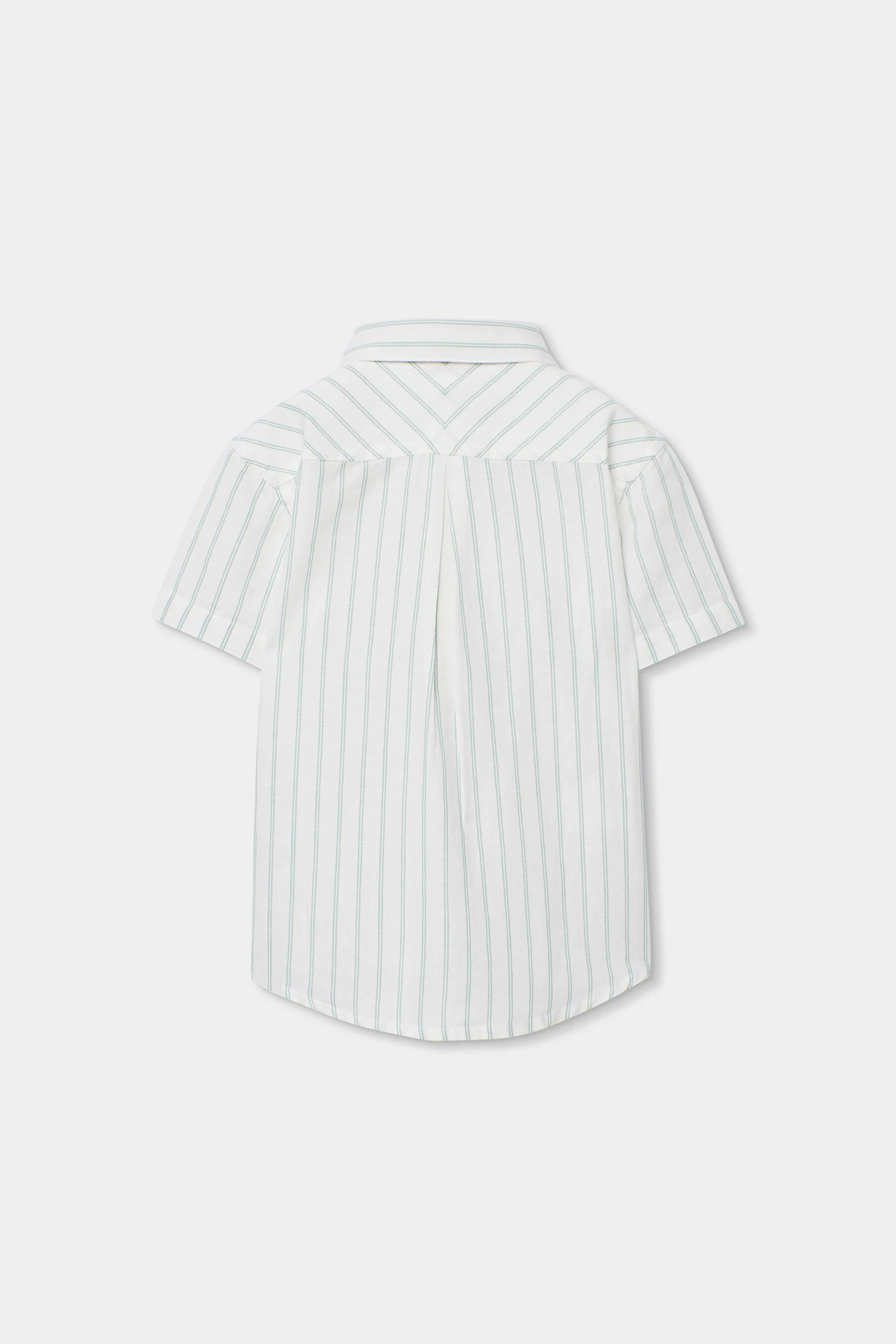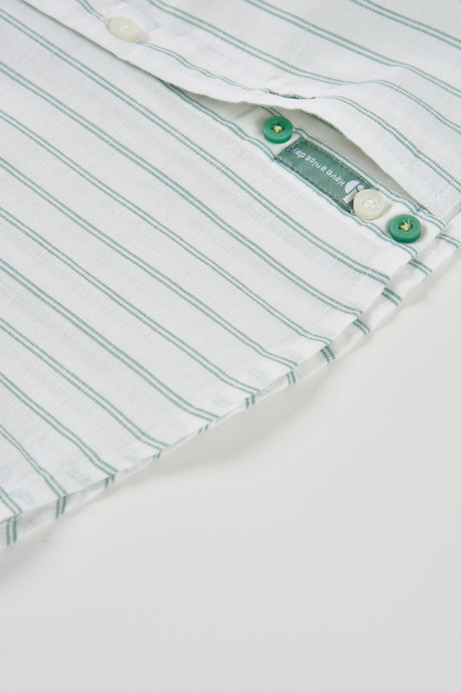 Striped linen shirt for boys, perfect for an elegant and fresh look during the warmer months. Made from a lightweight material, it provides all-day comfort. Its design features vertical stripes in light tones and short sleeves, adding a chic touch. Available in sizes from 12 months to 10 years, it caters to various ages. Ideal to pair with linen trousers or jeans, this shirt is a versatile choice for both casual and formal events.