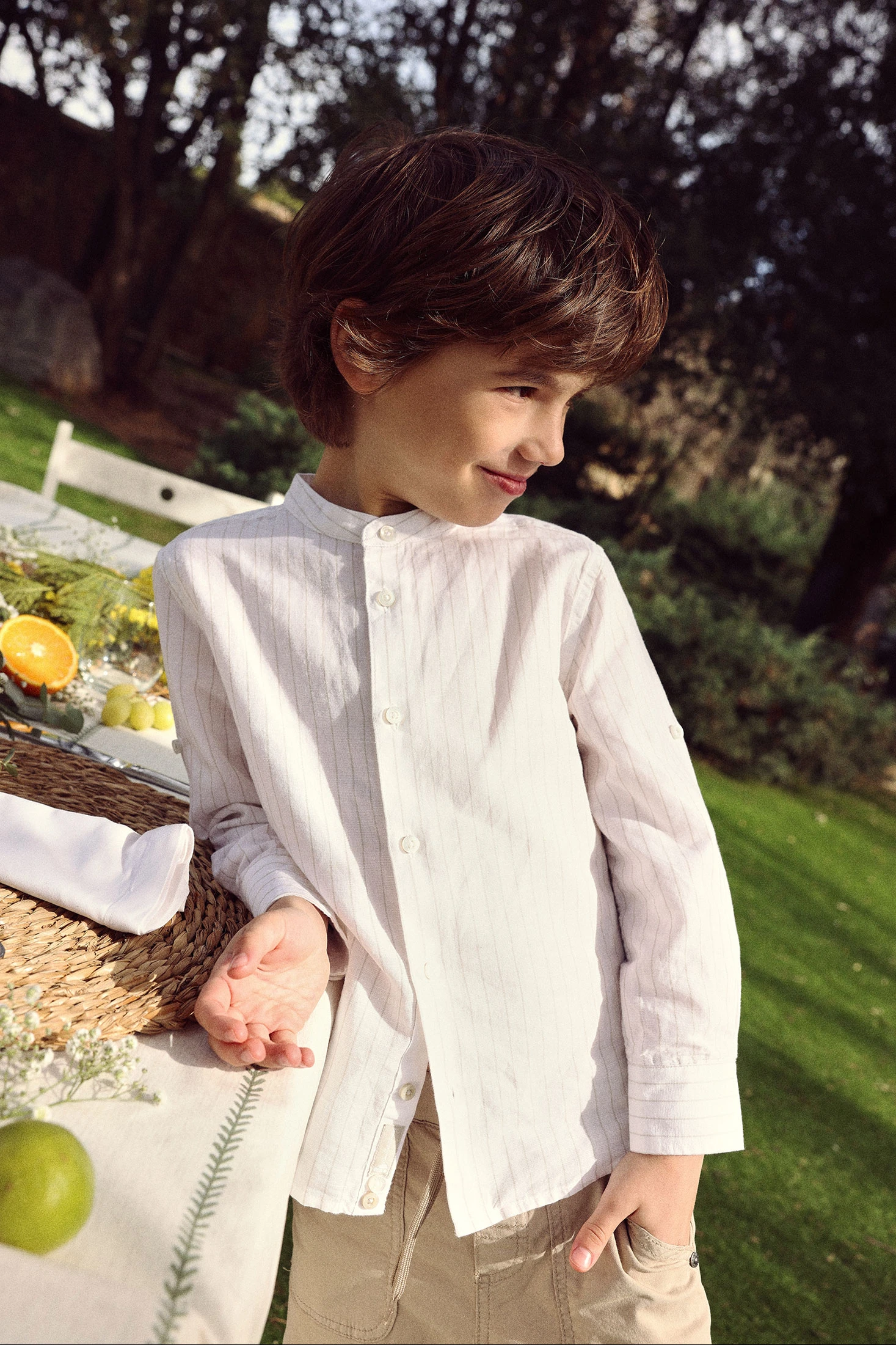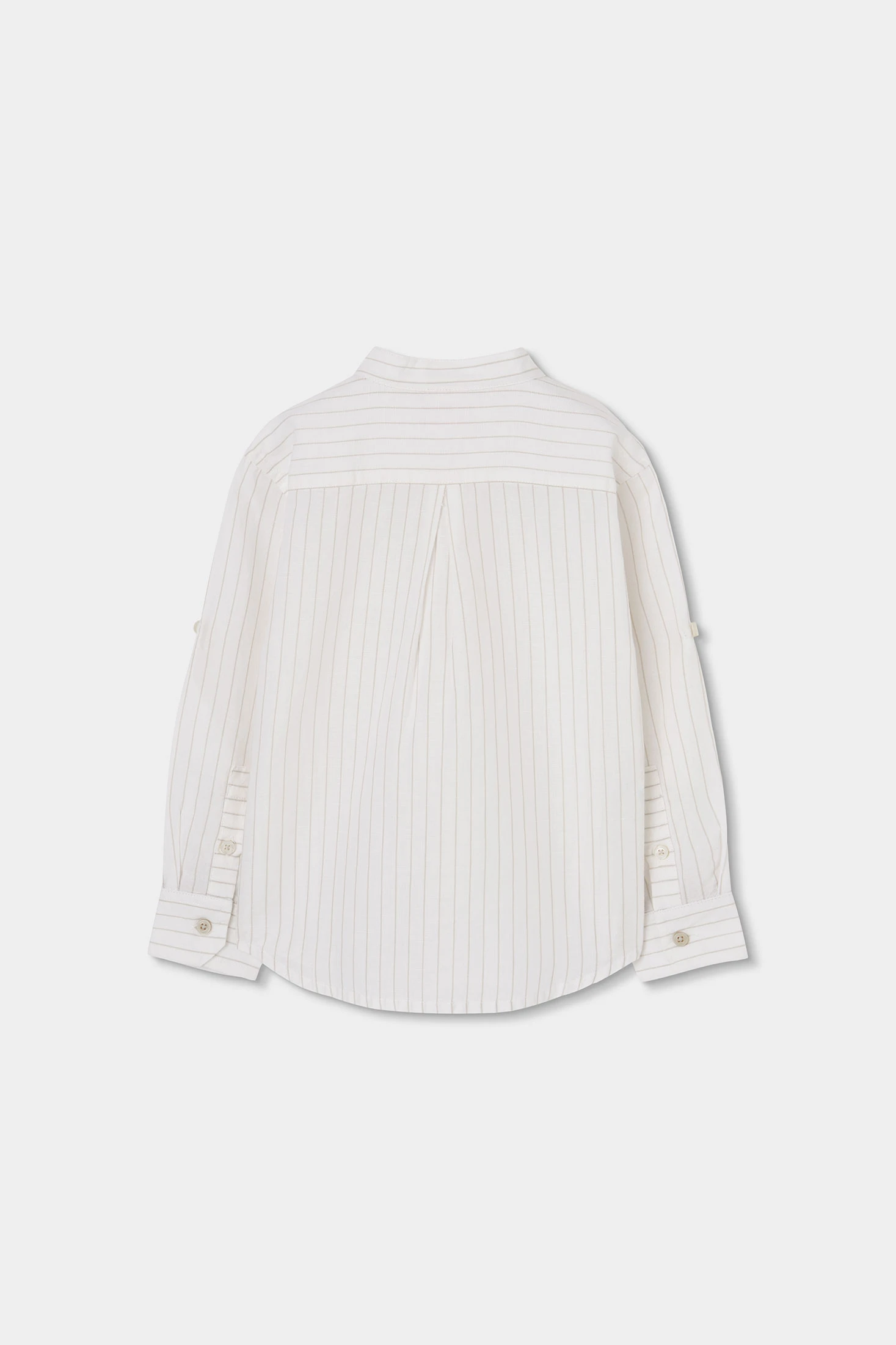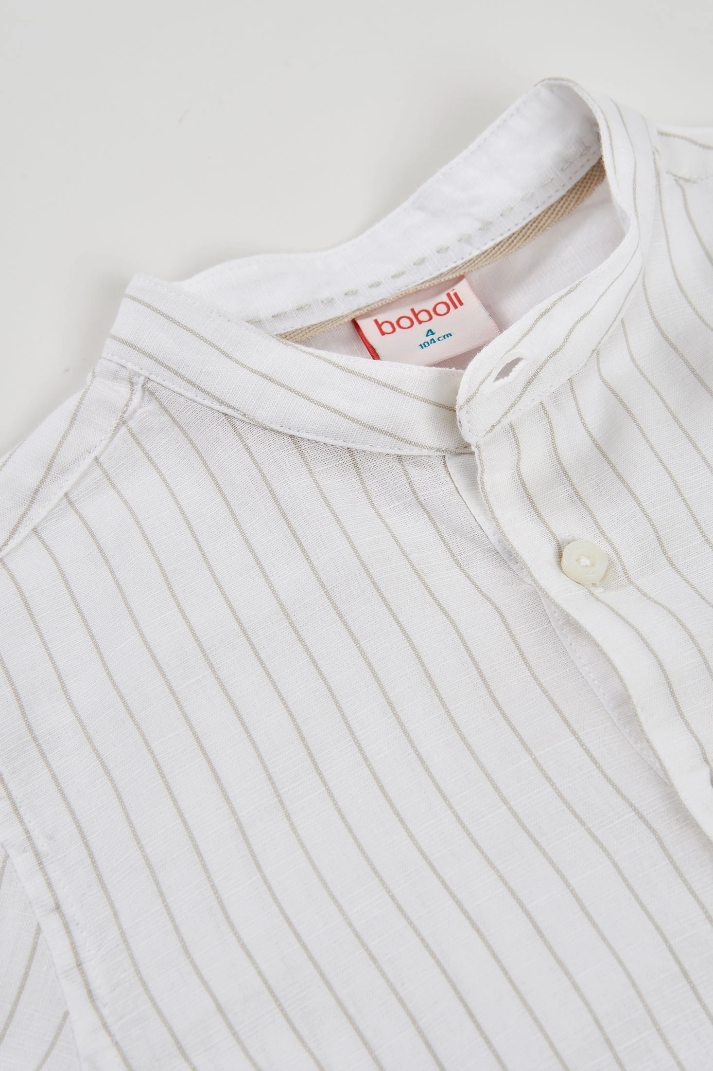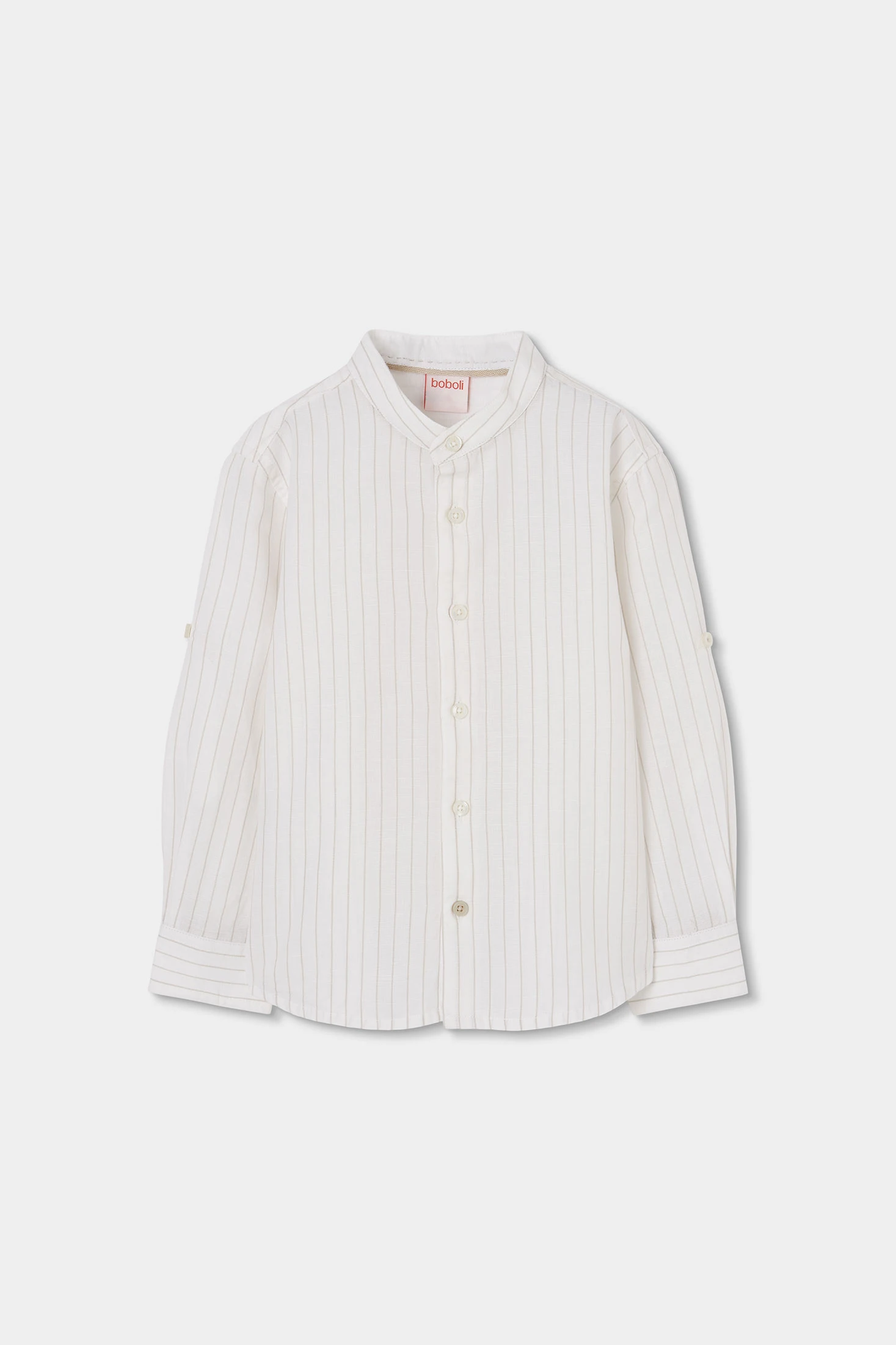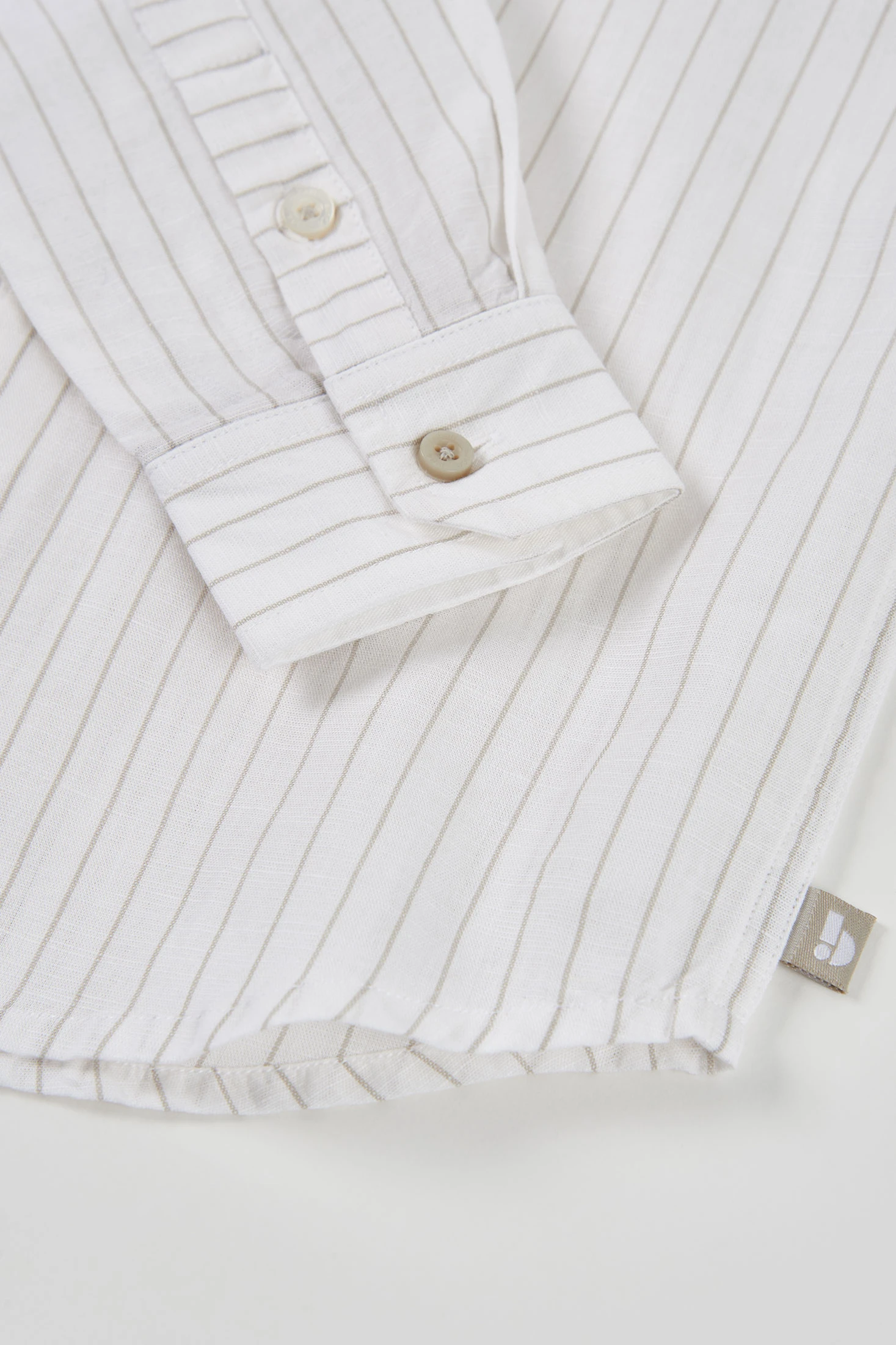 Striped linen shirt for boys, perfect for elegant occasions throughout the year. Featuring a classic design of vertical stripes in a soft beige colour, it offers a fresh and sophisticated look. It has a mandarin collar and buttoned front, ideal for pairing with casual or formal trousers. Available in sizes from 12 months to 14 years, this garment is versatile and comfortable. Its linen fabric ensures breathability and comfort, making it an ideal choice for any special event.