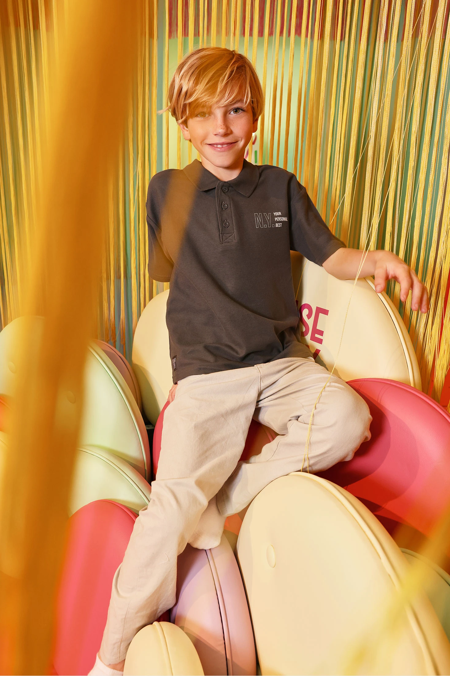 Beige linen trousers for boys, ideal for an elegant and comfortable look. Its simple and classic design makes it perfect for various occasions. Made from linen, it offers freshness and lightness, making it perfect for warm climates. It features a comfortable fit with button and zip fastening. Available in sizes from 12 months to 14 years, it perfectly fits growing children. Its neutral beige colour allows for versatile combinations with shirts or polo shirts in different shades. It is a basic wardrobe staple that provides style and comfort.
