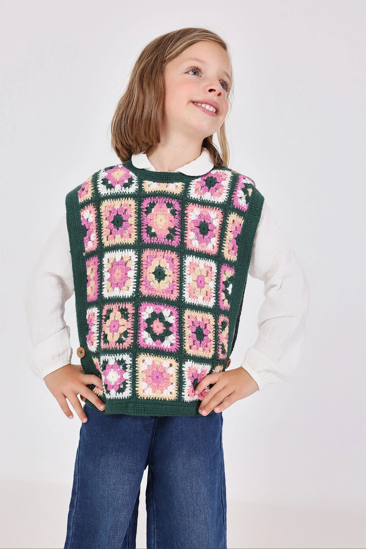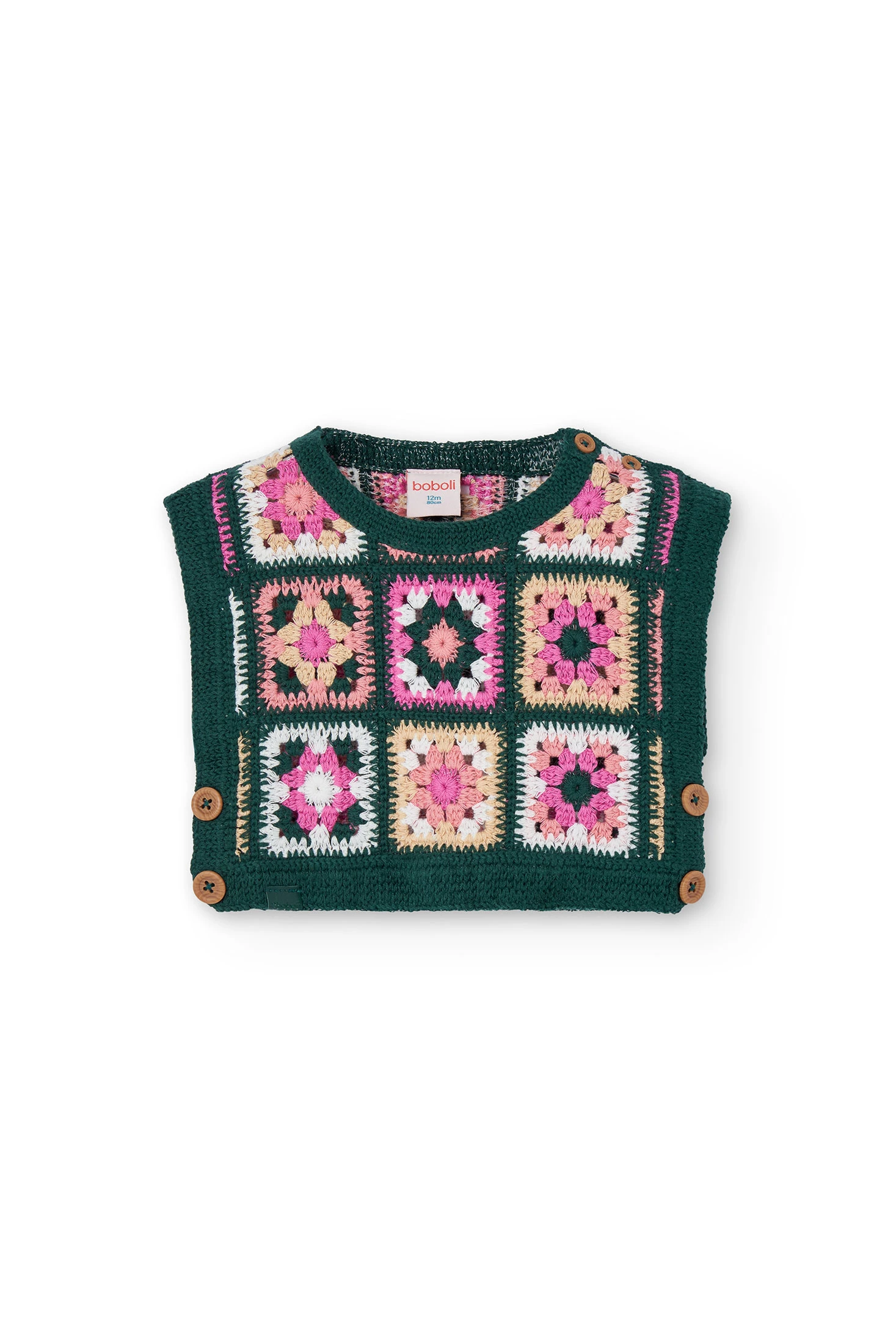 Knitted vest for girls with a checkered design in shades of green, ideal for the autumn and winter seasons. Crafted from a warm and soft fabric that ensures your little one's comfort and wellbeing, while adding a charming and cosy touch. It features practical side buttons for easy adjustment and is available in sizes from 12 months to 10 years. Perfect for pairing with trousers or skirts, this versatile garment complements a casual and comfortable everyday look.