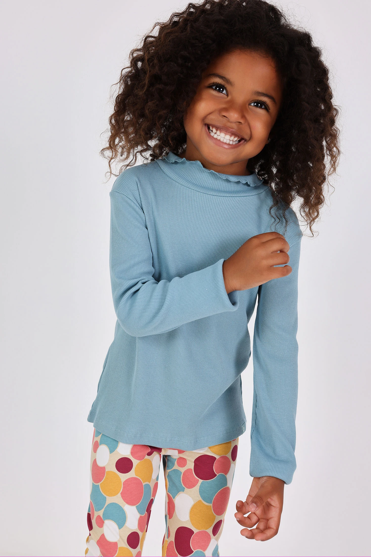 Cotton T-shirt for girls in aqua green, perfect for cooler climates. Designed with an elegant round neckline adorned with a delicate frill and long sleeves, it offers comfort and adaptability. Made from high-quality materials, it is available in sizes from 12 months to 10 years, covering a wide range of stages in a child's growth. Its versatility allows it to be easily paired with trousers or skirts, making it ideal for both casual and formal occasions. An essential addition to the autumn and winter wardrobe, this T-shirt guarantees warmth and style.
