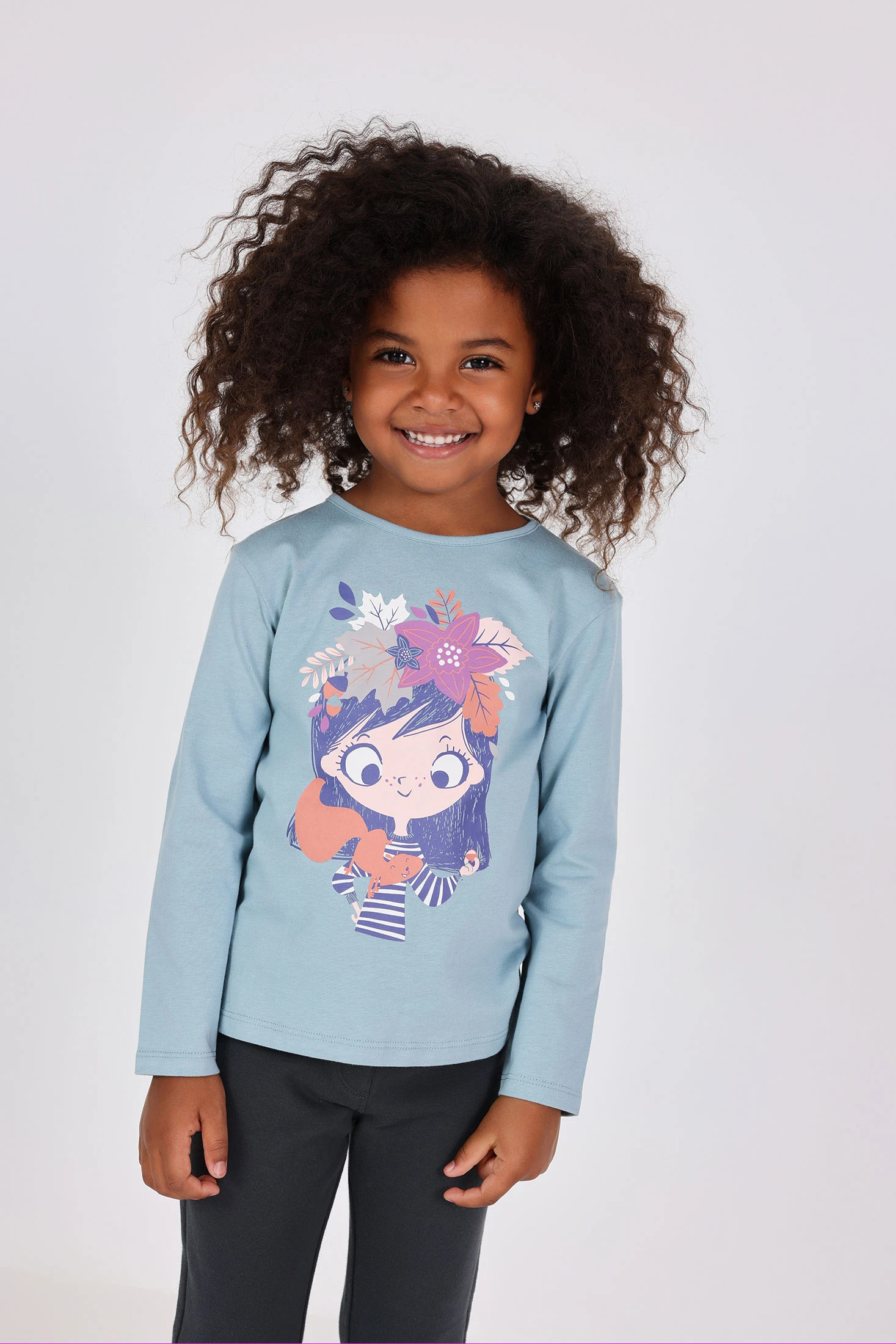 Long-sleeved T-shirt ideal for the autumn and winter season, crafted from soft knitted fabric that offers comfort and warmth. Attractive blue colour with a fun print of girls that will delight the little ones. Designed with a practical round neck that makes daily use easy. Available in sizes from 12 months to 10 years. Perfect for pairing with trousers or skirts, it is a charming and versatile option for adding a cheerful and original touch to children's wardrobe.