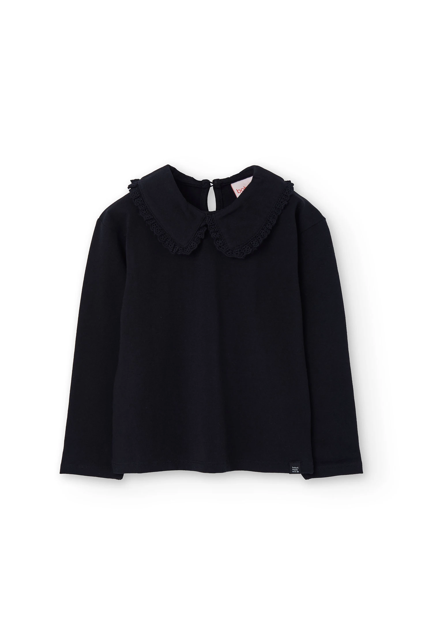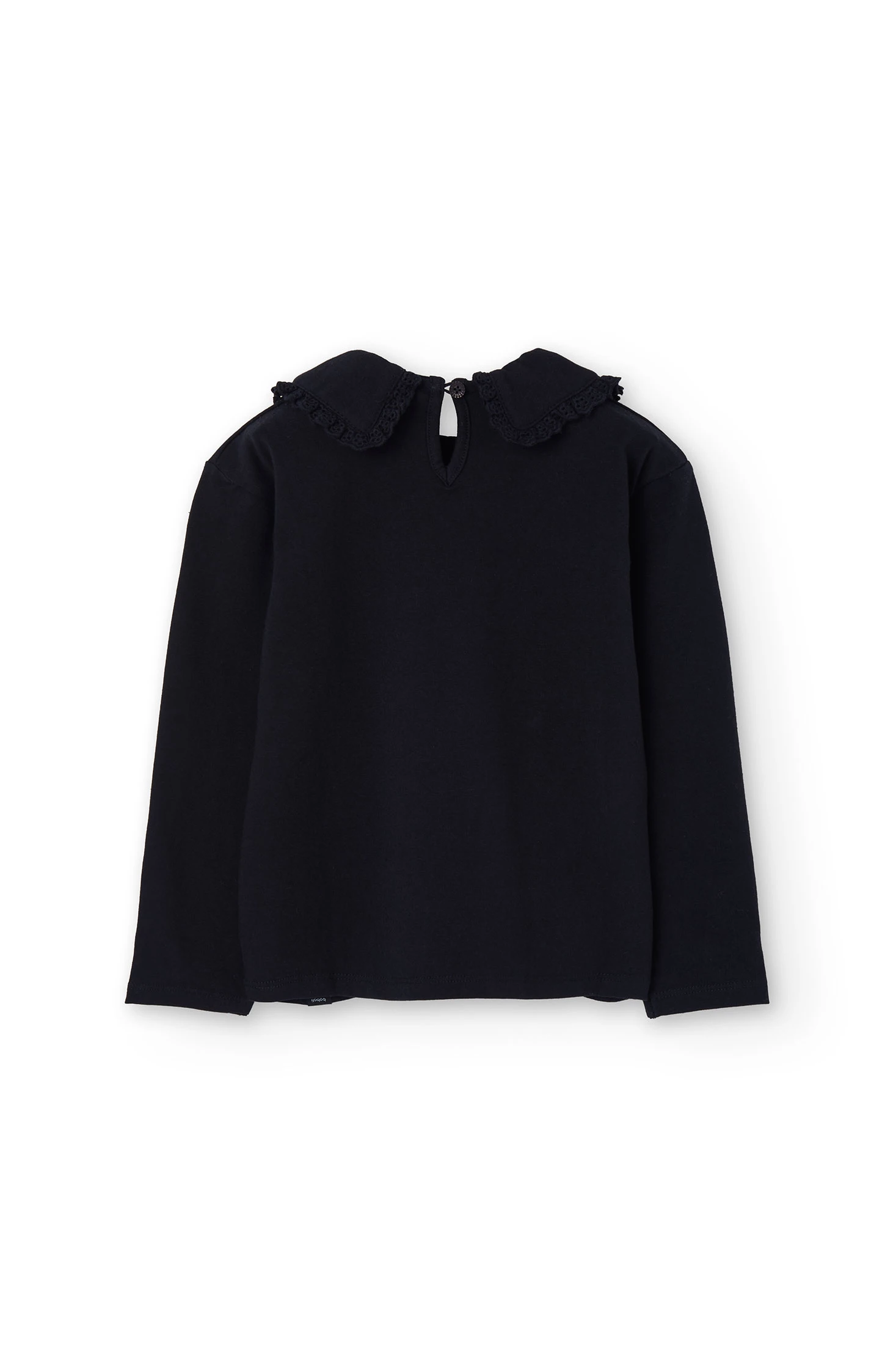 Black knitted T-shirt for girls, designed for the autumn and winter seasons, offers comfort and warmth with its soft fabric. The round neck design and long sleeves are perfectly suited to maintain comfort on cold days. Available in sizes from 2 to 14 years, its plain style makes it a versatile garment, easy to combine with other pieces, adding an elegant and timeless touch to children's wardrobe.