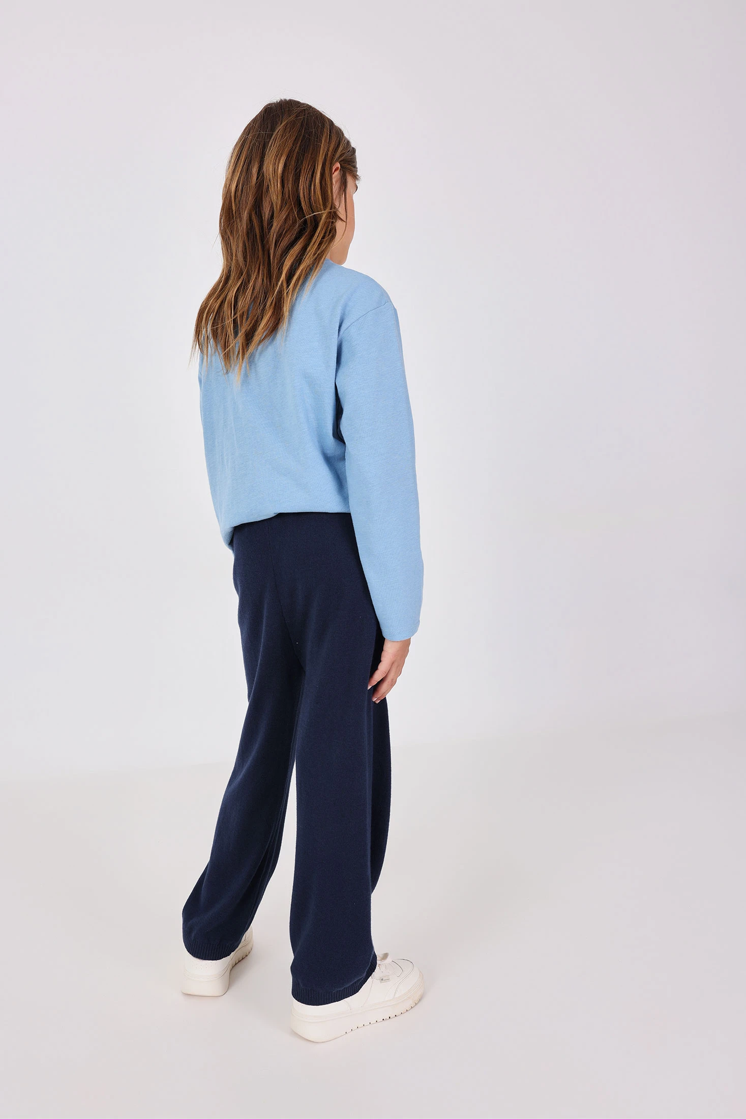 Navy blue knit trousers are an ideal choice for the autumn and winter months, offering warmth and comfort thanks to their soft fabric. Specially designed for girls aged 2 to 14, they feature an adjustable waistband that provides a comfortable and secure fit. Their classic and elegant tone makes them perfect for pairing with shirts and jumpers, in both neutral and vibrant colours. A versatile garment suitable for everyday wear as well as family gatherings, ensuring your daughter always looks fashionable.