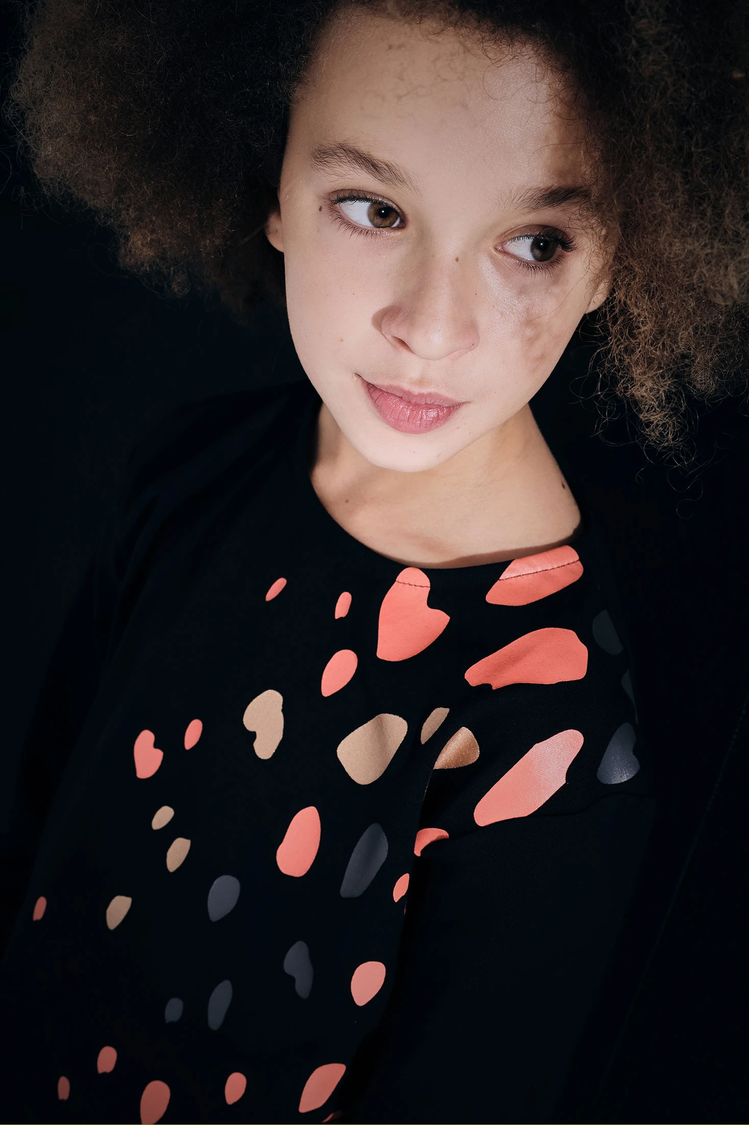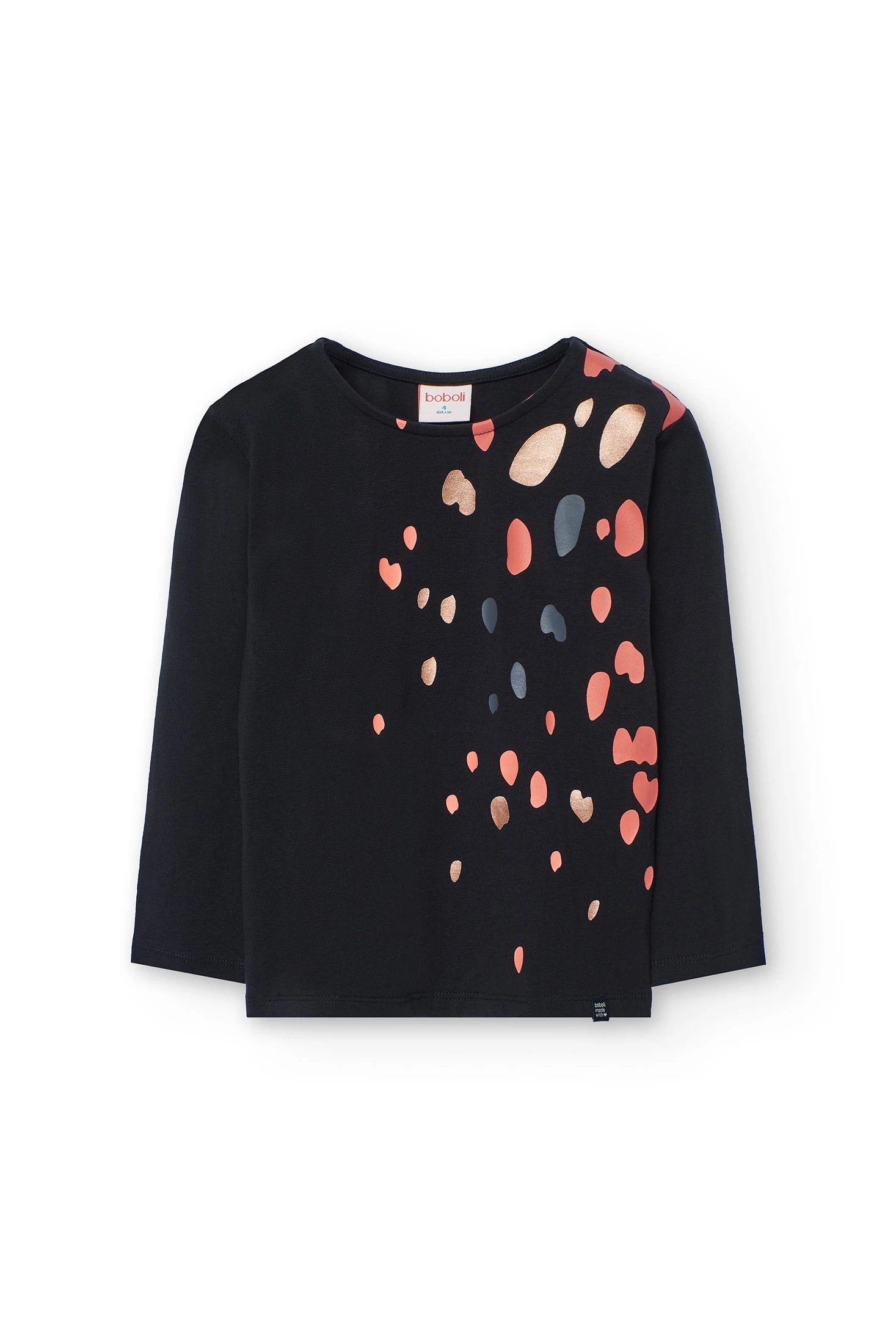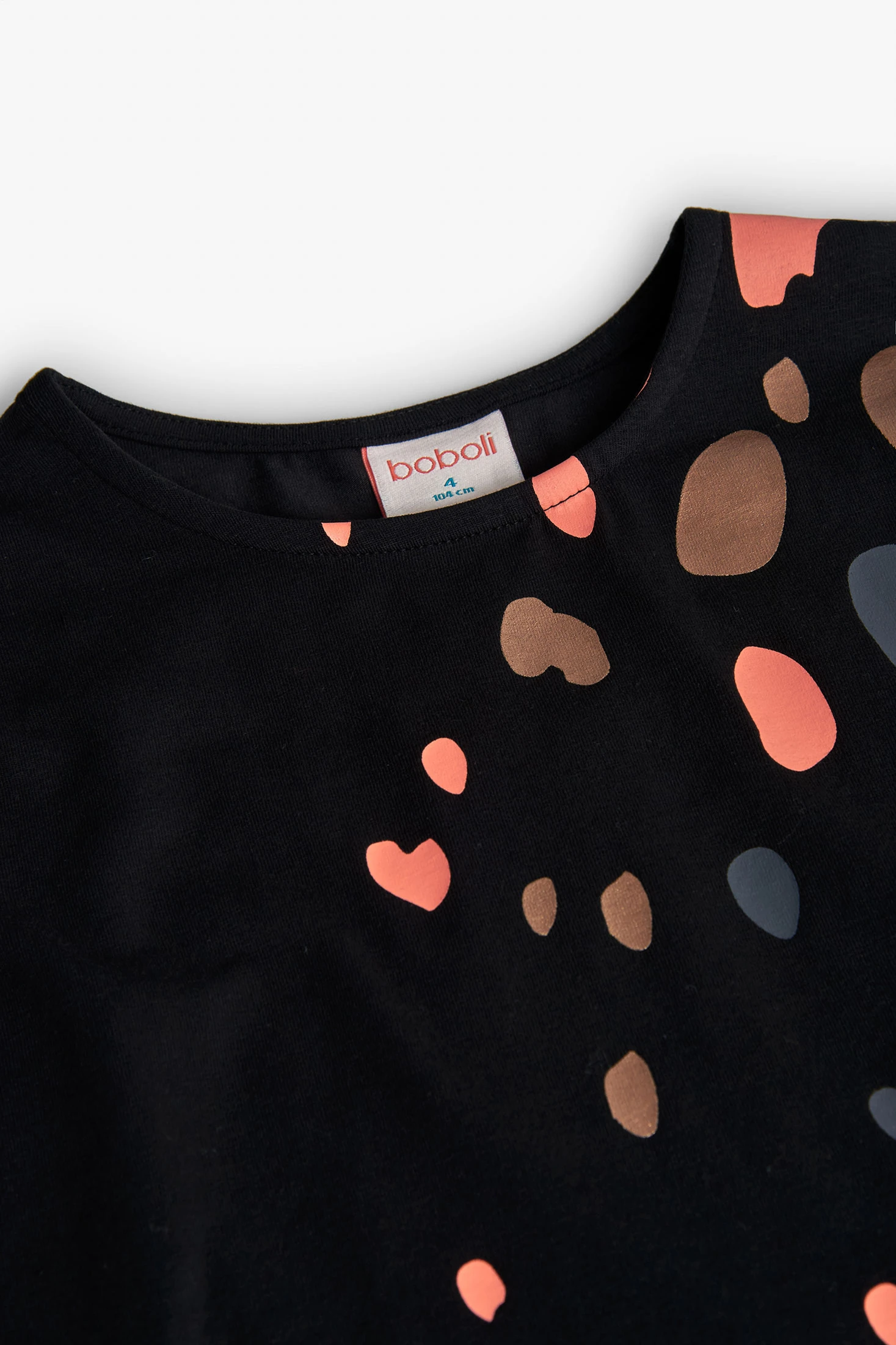 Knitted black T-shirt for girls with an elegant abstract print in various colours, designed to add a modern and sophisticated touch to any girl's wardrobe. Crafted from high-quality knit fabric, this T-shirt ensures comfort and freshness, making it perfect for the autumn and winter season. Available in sizes for girls aged 2 to 14, it guarantees a comfortable fit for everyday wear. Pair it with trousers or skirts to create casual or more formal looks, suitable for any occasion.