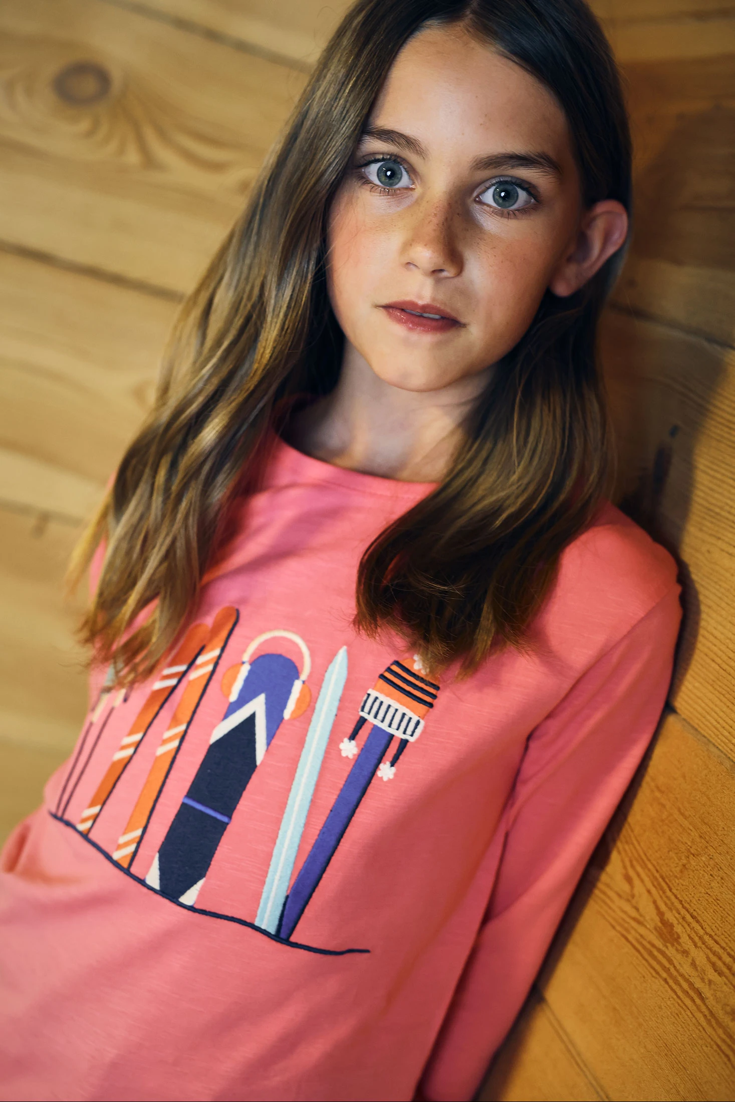 Pink lamé knit T-shirt for girls, ideal for the autumn season due to its fresh and lightweight design. Crafted from soft cotton, it offers comfort and breathability on warmer days. Available in sizes from 2 to 14 years, it fits perfectly to the children's silhouette. The pink tone easily pairs with skirts, trousers, creating a casual and modern style. Perfect for everyday wear, it guarantees the freedom of movement necessary for girls to enjoy their activities to the fullest.