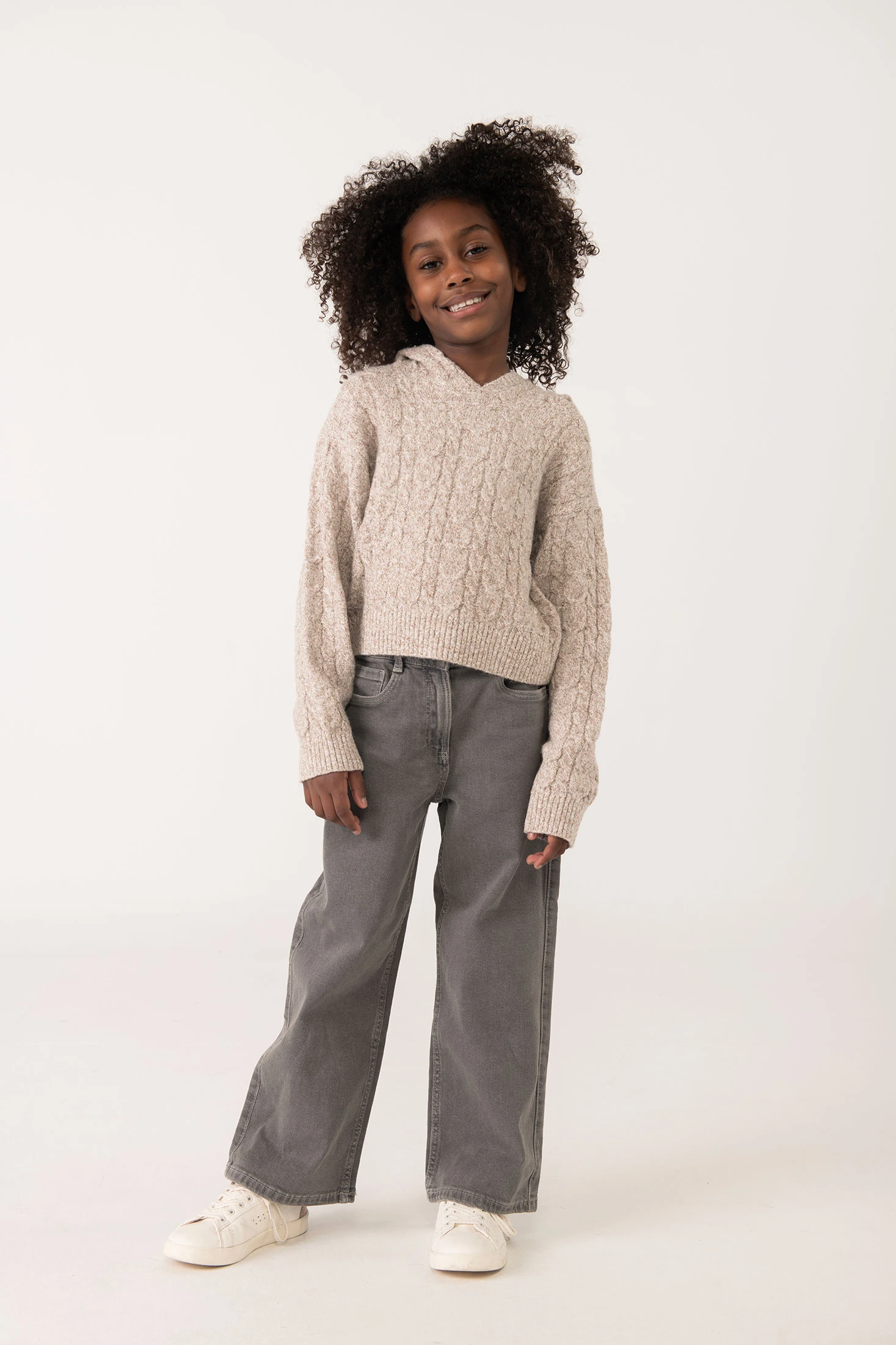 Knitted jumper for girls in brown, with a hood. It offers warmth and comfort, perfect for keeping little ones cosy during cold days. Crafted in soft knit, it easily pairs with trousers or skirts, creating a versatile and cheerful look. Available in sizes from 2 to 14 years, this design is a practical and stylish choice for any children's wardrobe.
