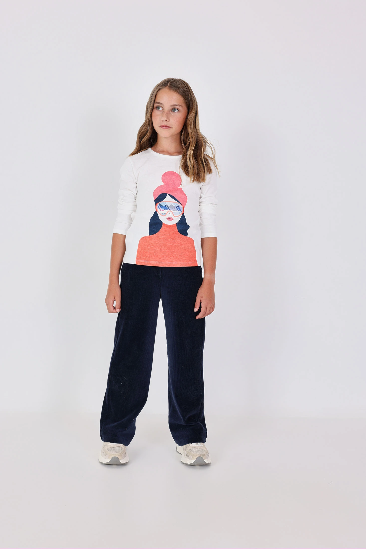 Dark blue knit corduroy trousers, perfect for girls during the autumn and winter months, featuring a wide-leg design that offers comfort and elegance. The corduroy fabric provides warmth, while the elastic waistband ensures a comfortable fit and easy dressing. Available in sizes from 2 to 14, it accommodates your daughter's growth. Ideal for pairing with jumpers or blouses, adding a casual and sophisticated style to any outfit.