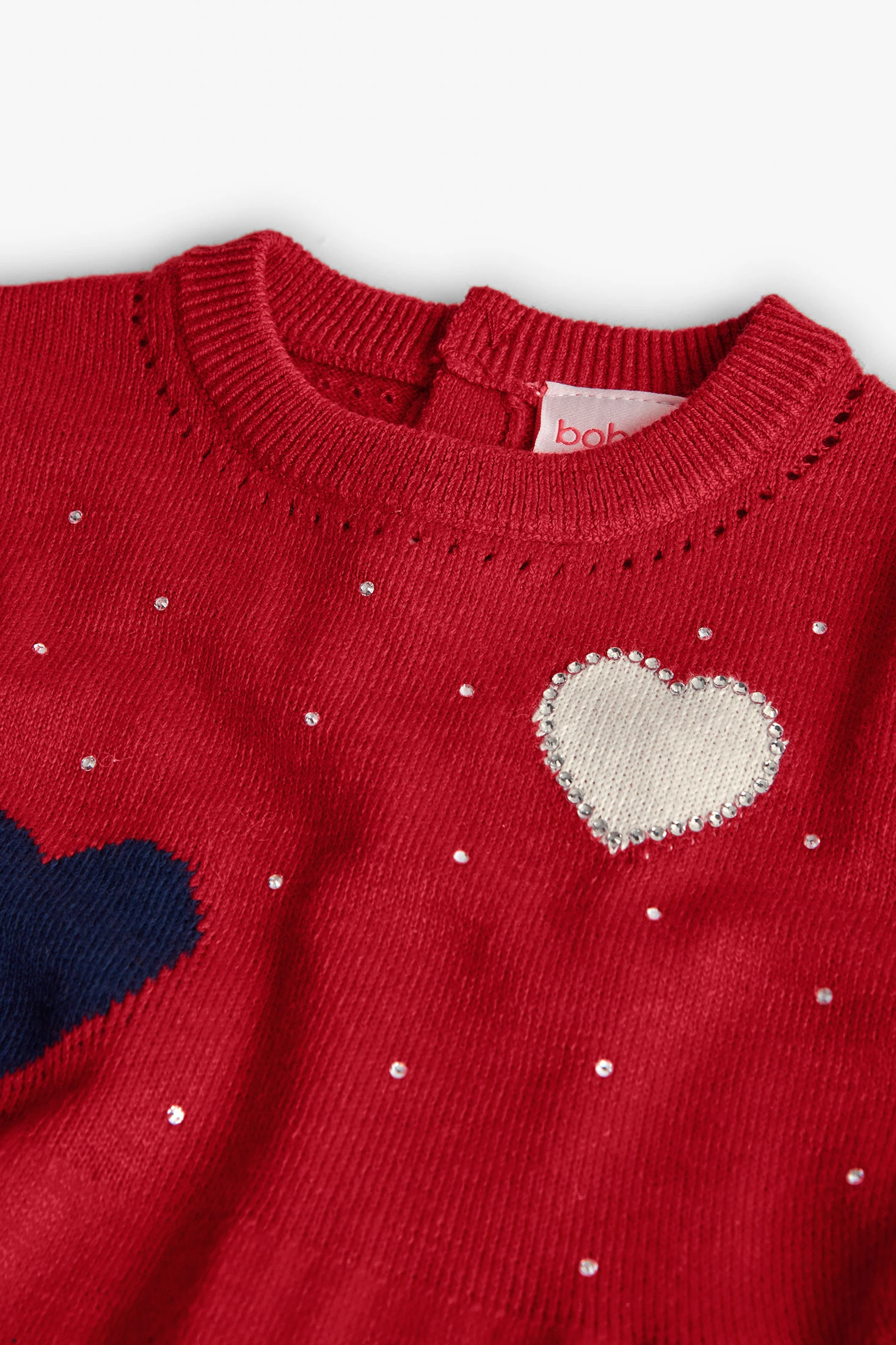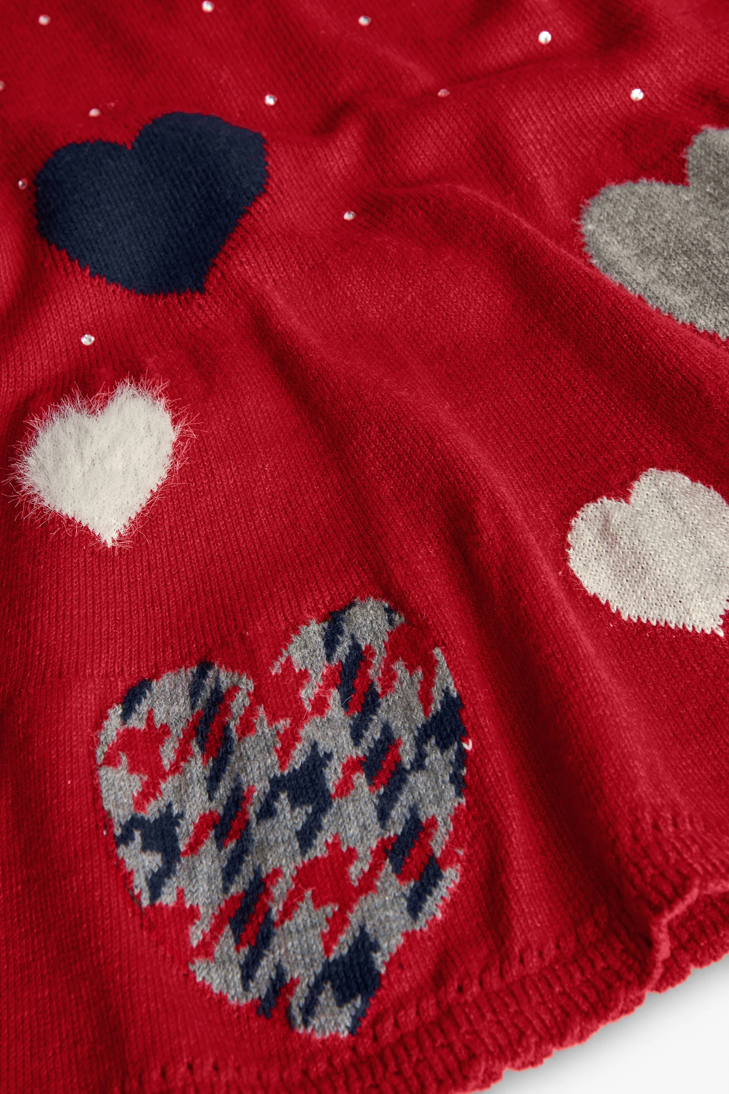 Knitted dress in maroon colour, designed with charming hearts, perfect for the autumn-winter season. Made with soft materials, it offers warmth and style, featuring a round neckline and long sleeves for added comfort. Available in sizes from 12 months to 10 years, it can be easily paired with tights to create an adorable look for any occasion, whether special or for everyday wear. Ideal for parents seeking a charming and comfortable style for their little ones.