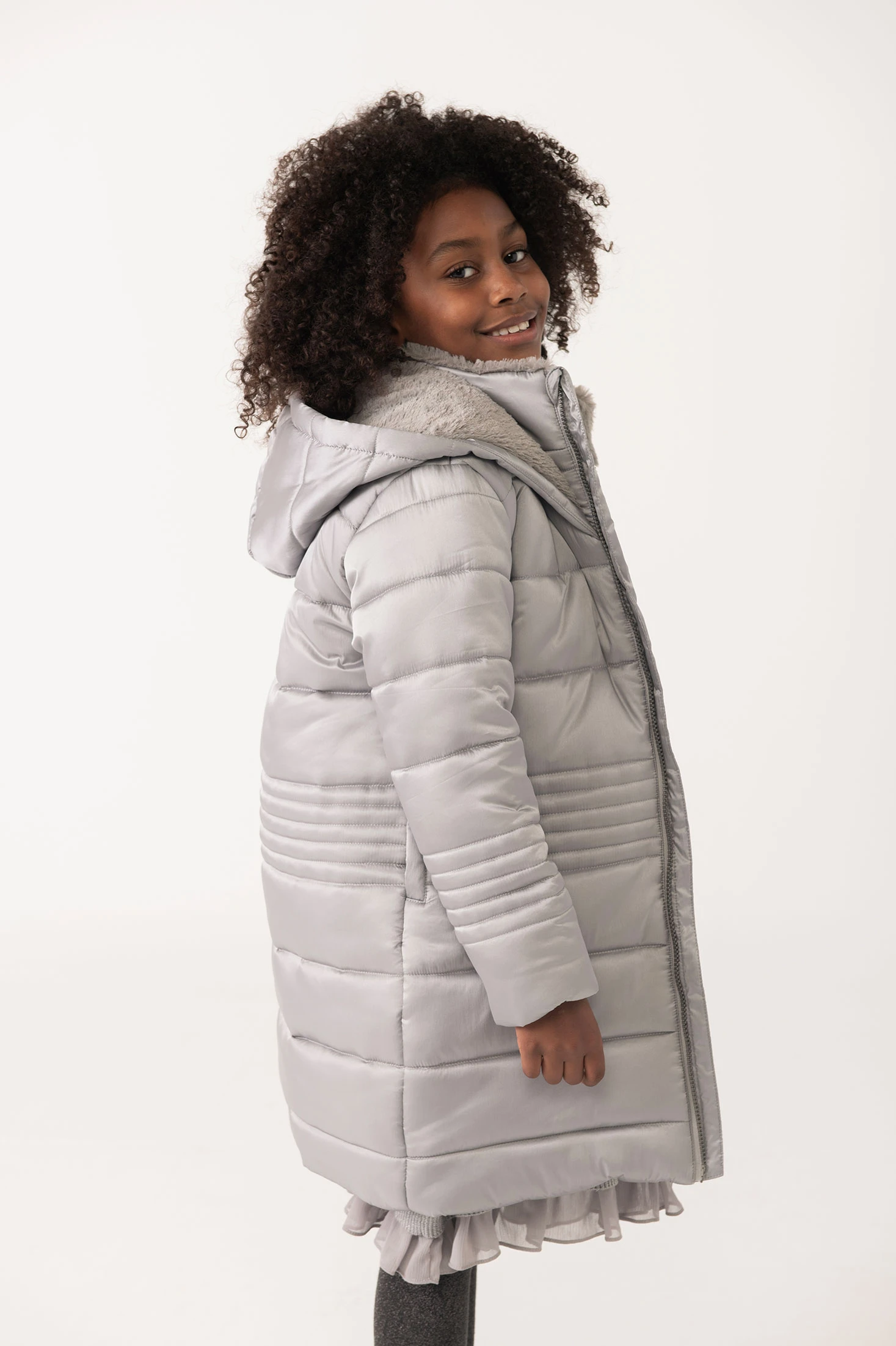 Grey parka for girls, designed to face winter with style and comfort. Made from technical fabric, it offers excellent resistance to wind and water, ideal for rainy days. Equipped with a hood and zip closure, it provides optimal protection against the cold. Available in sizes from 2 to 14 years, this versatile garment can be easily paired with trousers or skirts, offering an elegant solution for children's winter outerwear.
