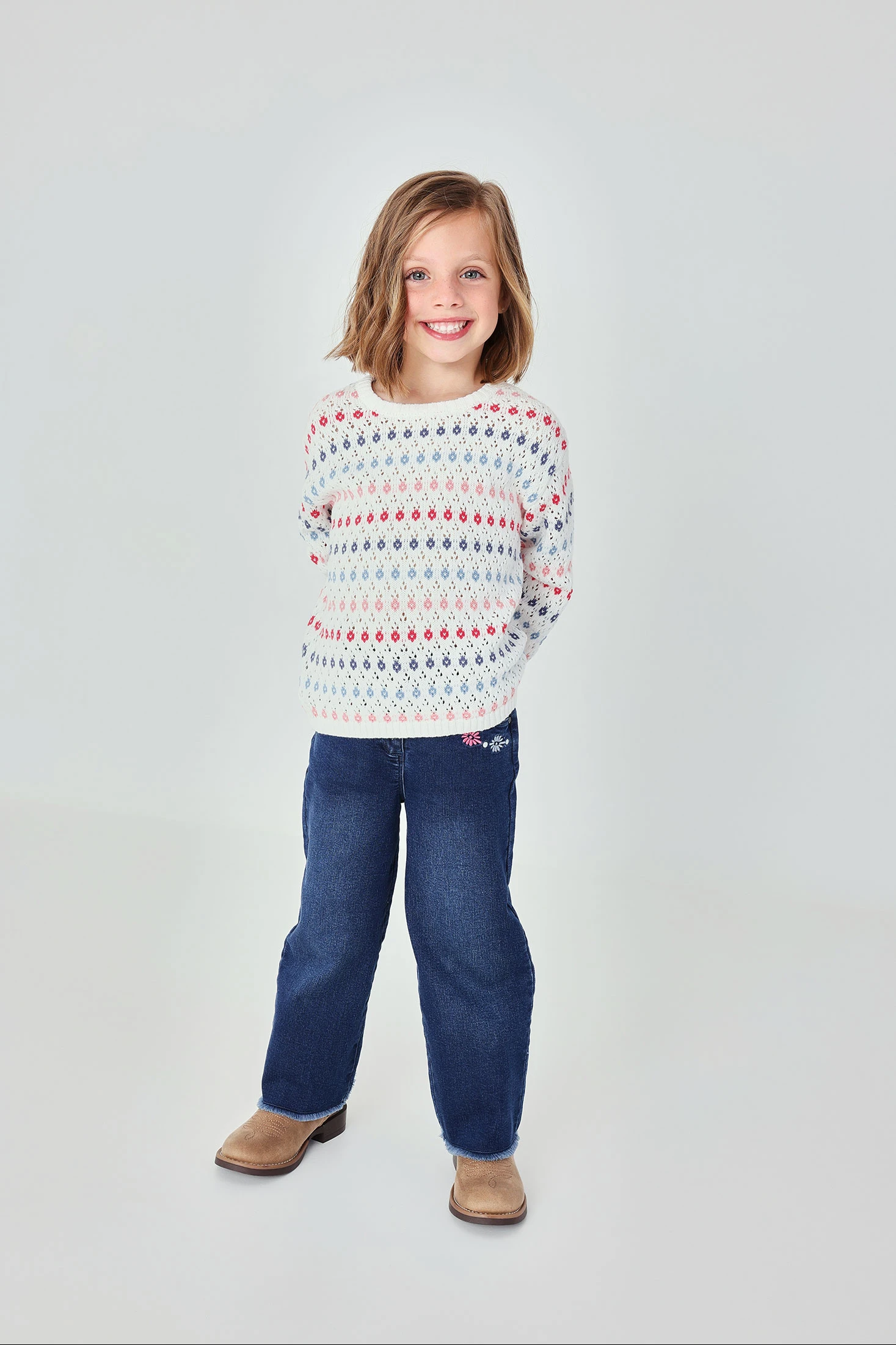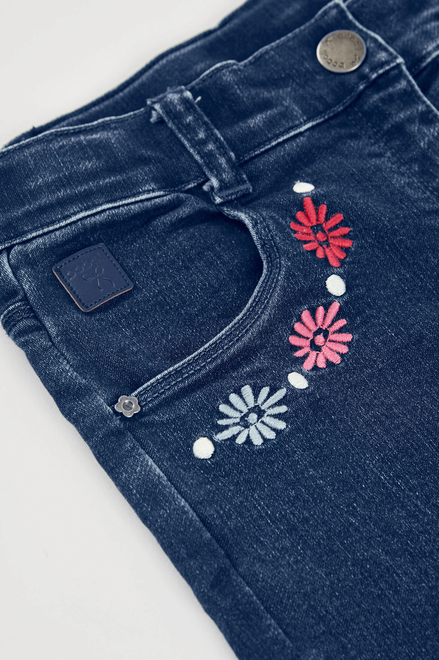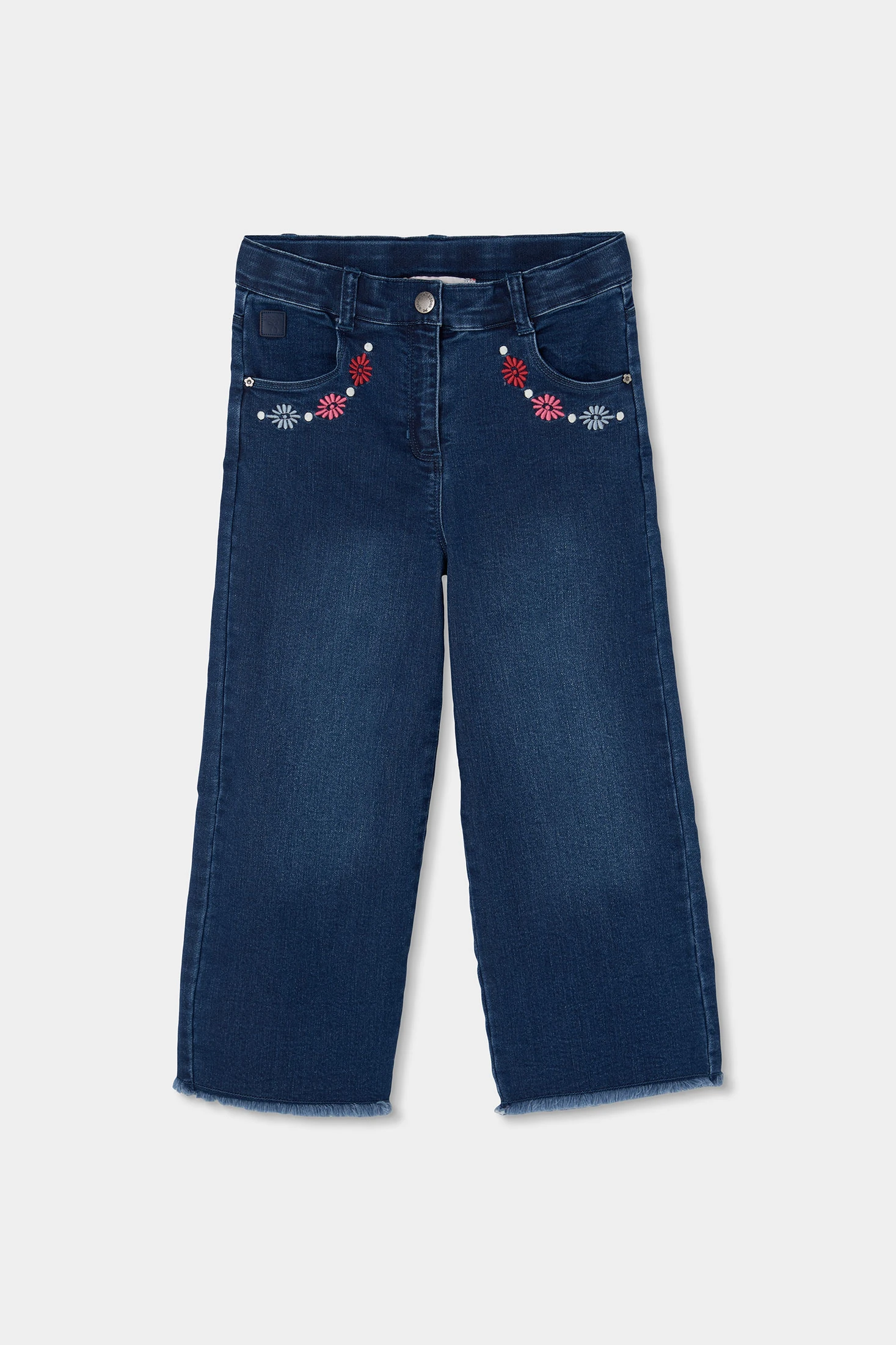 Blue denim trousers for girls, ideal for adding a touch of style to any outfit. Crafted from durable and comfortable denim, it features embroidered details on the front area that provide a decorative touch. Available in sizes from 12 months to 10 years. Its straight-leg design and button closure make it easy to pair with t-shirts and sweaters for a casual look. Perfect for everyday wear, these trousers are a versatile garment that suits various occasions.
