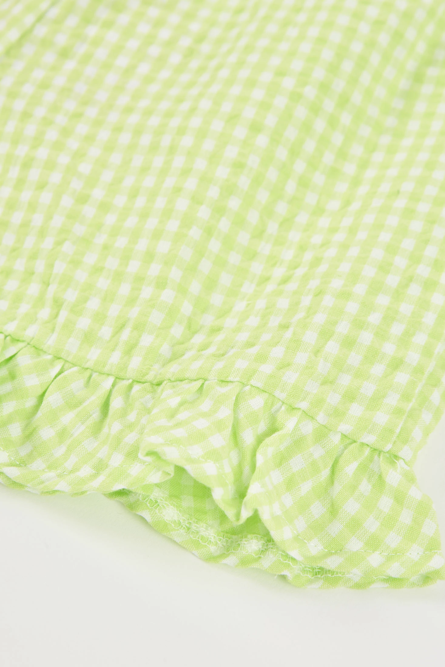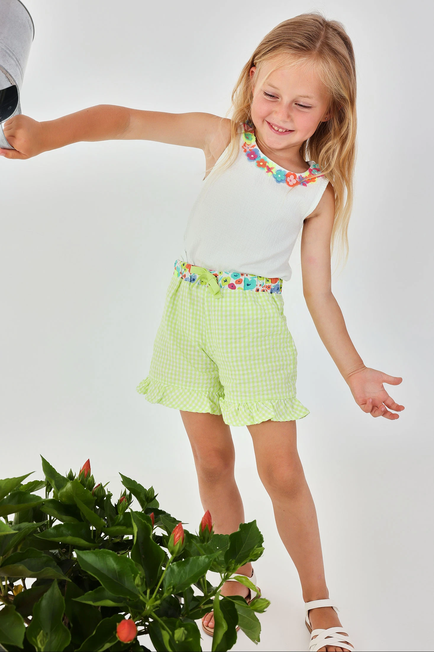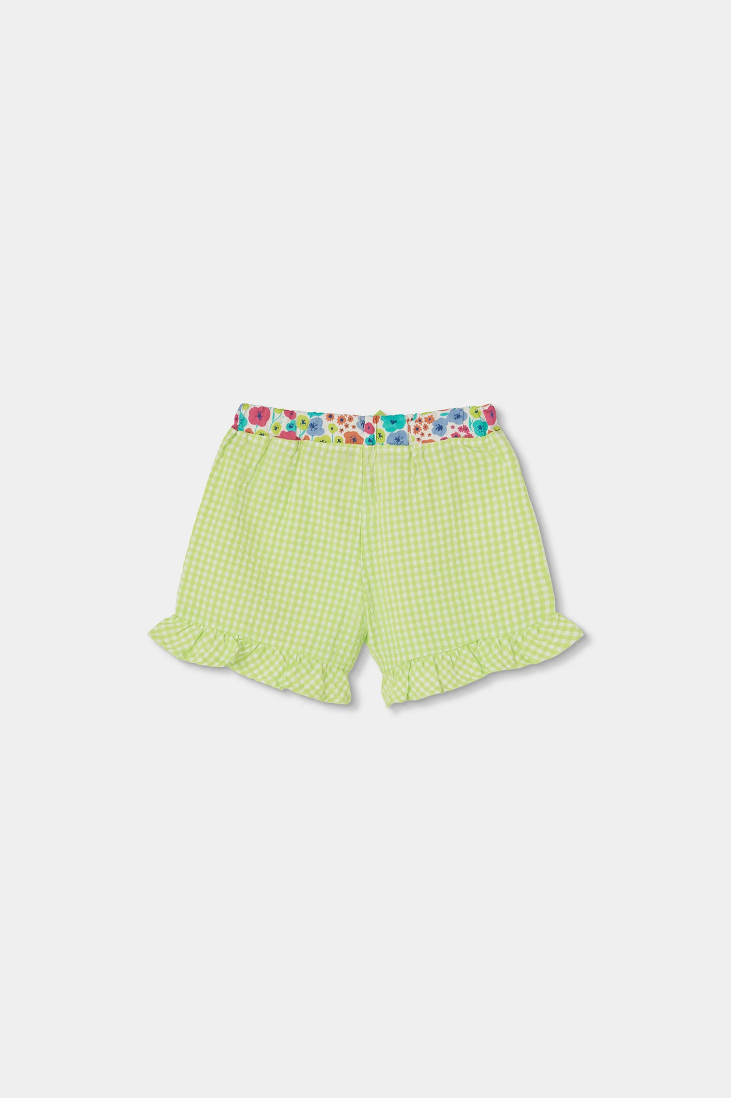 Poplin shorts for girls. They feature a gingham check design in lime and pearl tones, combined with a multicoloured floral print elastic waistband. The poplin fabric is light and breathable, ideal for hot days. Available in sizes from 12 months to 10 years, these shorts offer comfort and style. Pair them with neutral-toned T-shirts for a balanced and modern outfit.