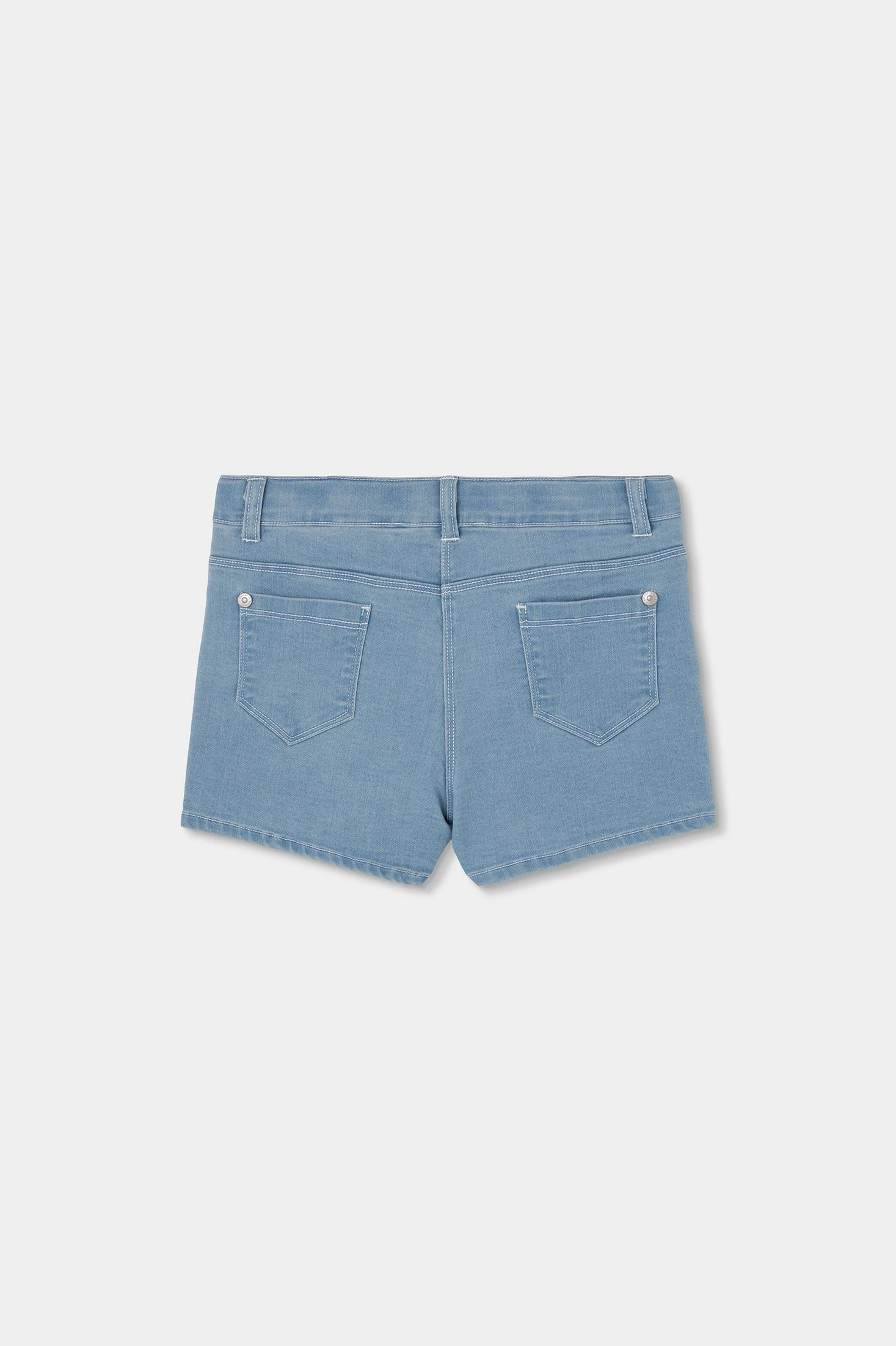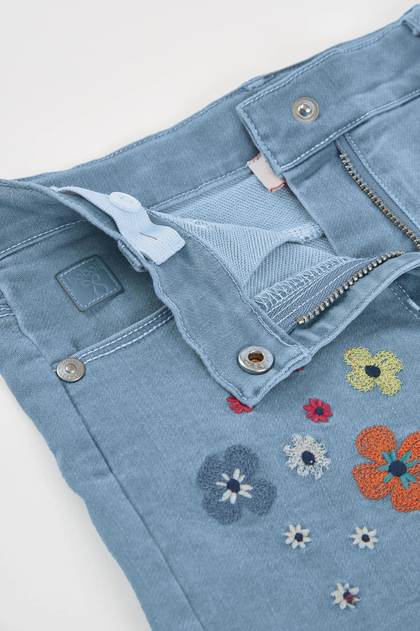 Bleach denim shorts for girls, ideal for summer. They feature embroidered flowers in various colours that add a cheerful and fun touch. Made from denim, with an adjustable waistband and an interior button, they offer durability and comfort for daily wear. Available in sizes from 12 months to 10 years, they adapt to different growth stages. Pair them with plain blouses to make the floral pattern stand out.