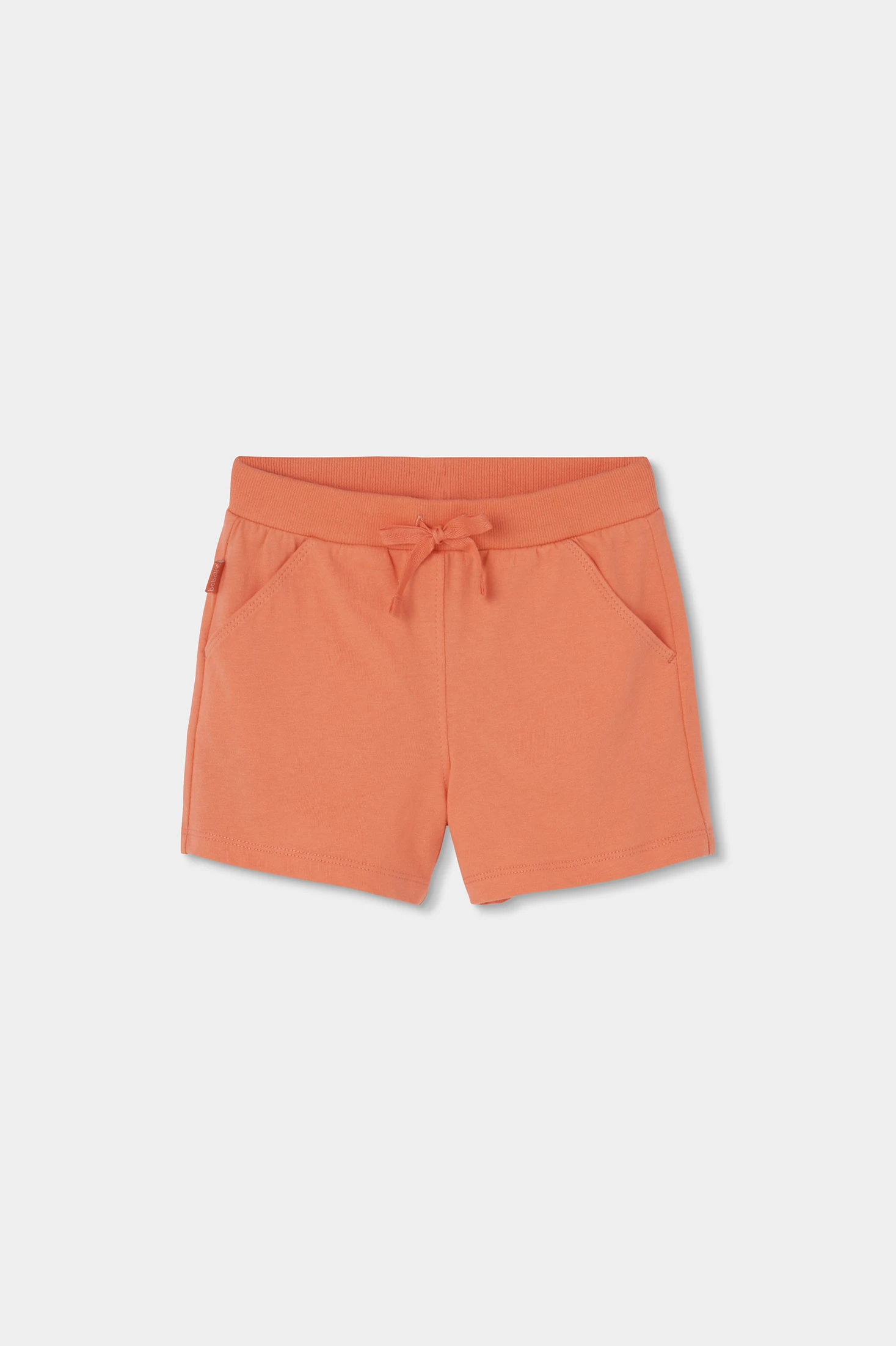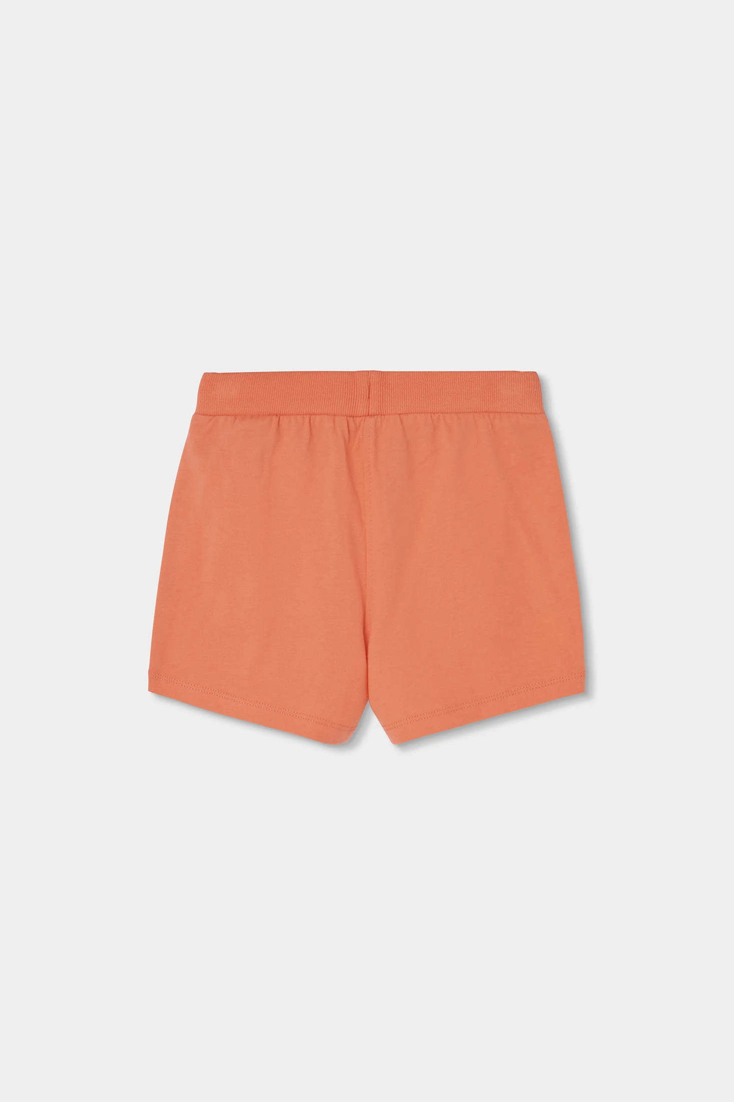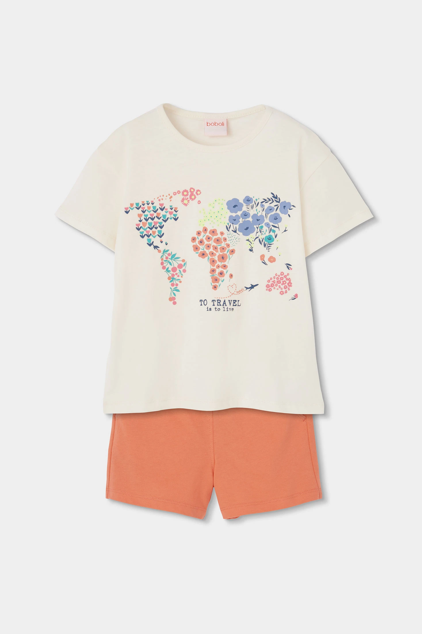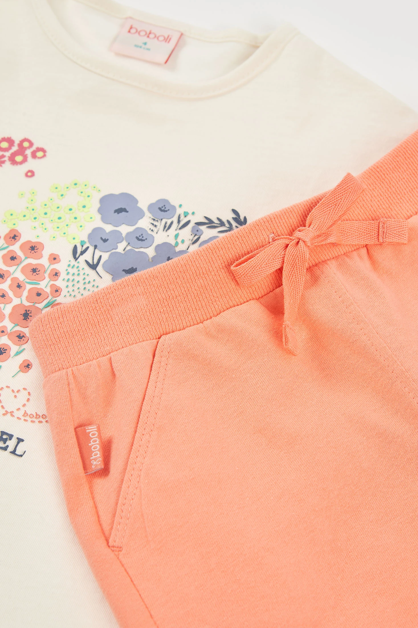 Set of cotton t-shirt and shorts for girls, ideal for summer. The pearl-coloured t-shirt features a lively print in various colours, adding a fun touch. The shorts are orange. Available in sizes from 12 months to 10 years, it suits different ages. Perfect for warm days, this set combines style and comfort, making it ideal for casual outings and playtime.