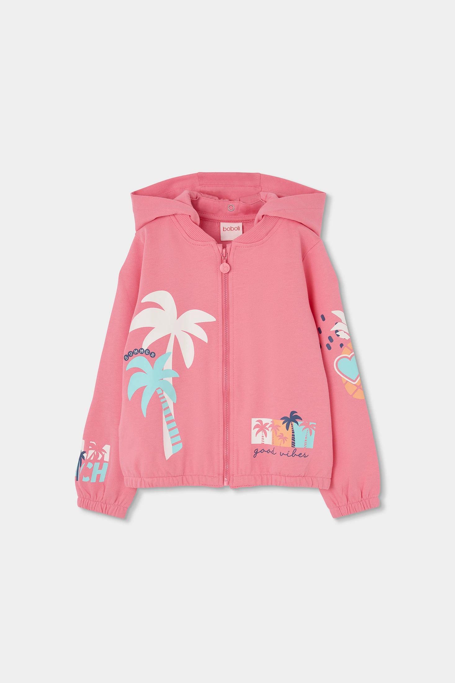 Plush jacket for girls, ideal for transitional seasons. Its soft and warm pink fabric makes it attractive and comfortable. It features a design with palm tree prints and the phrase "good vibes", adding a cheerful and modern touch. Includes a practical hood and zip closure for ease of use. Available in sizes from 12 months to 14 years, it is perfect to pair with jeans or leggings for a casual and fun look.