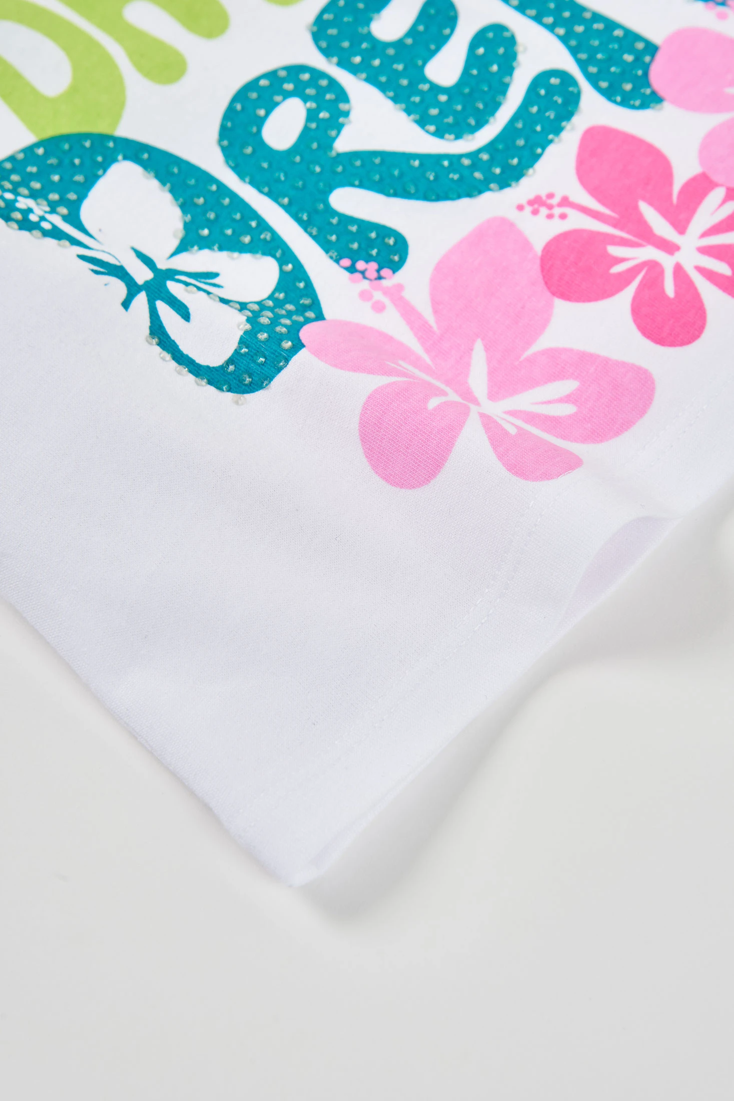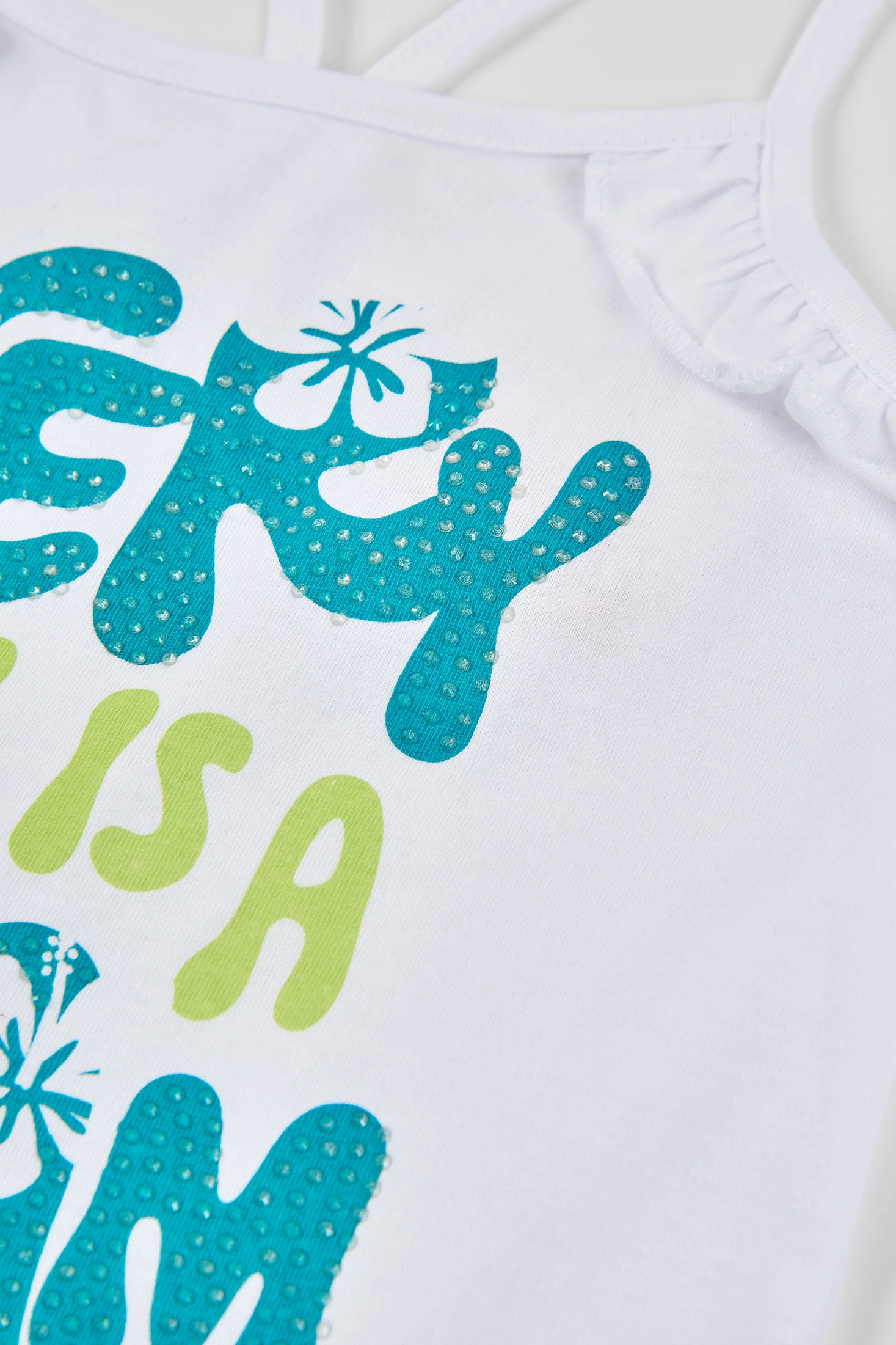 Sleeveless T-shirt for girls made from white jersey fabric, perfect for the warmer months. It features a striking colourful print with text and flowers, offering a fresh and cheerful style. Designed for girls aged 2 to 14 years, it ensures a perfect fit at every stage. Thin straps and lightweight material guarantee all-day comfort. Perfect to pair with shorts or skirts, adding a summery touch to any outfit.
