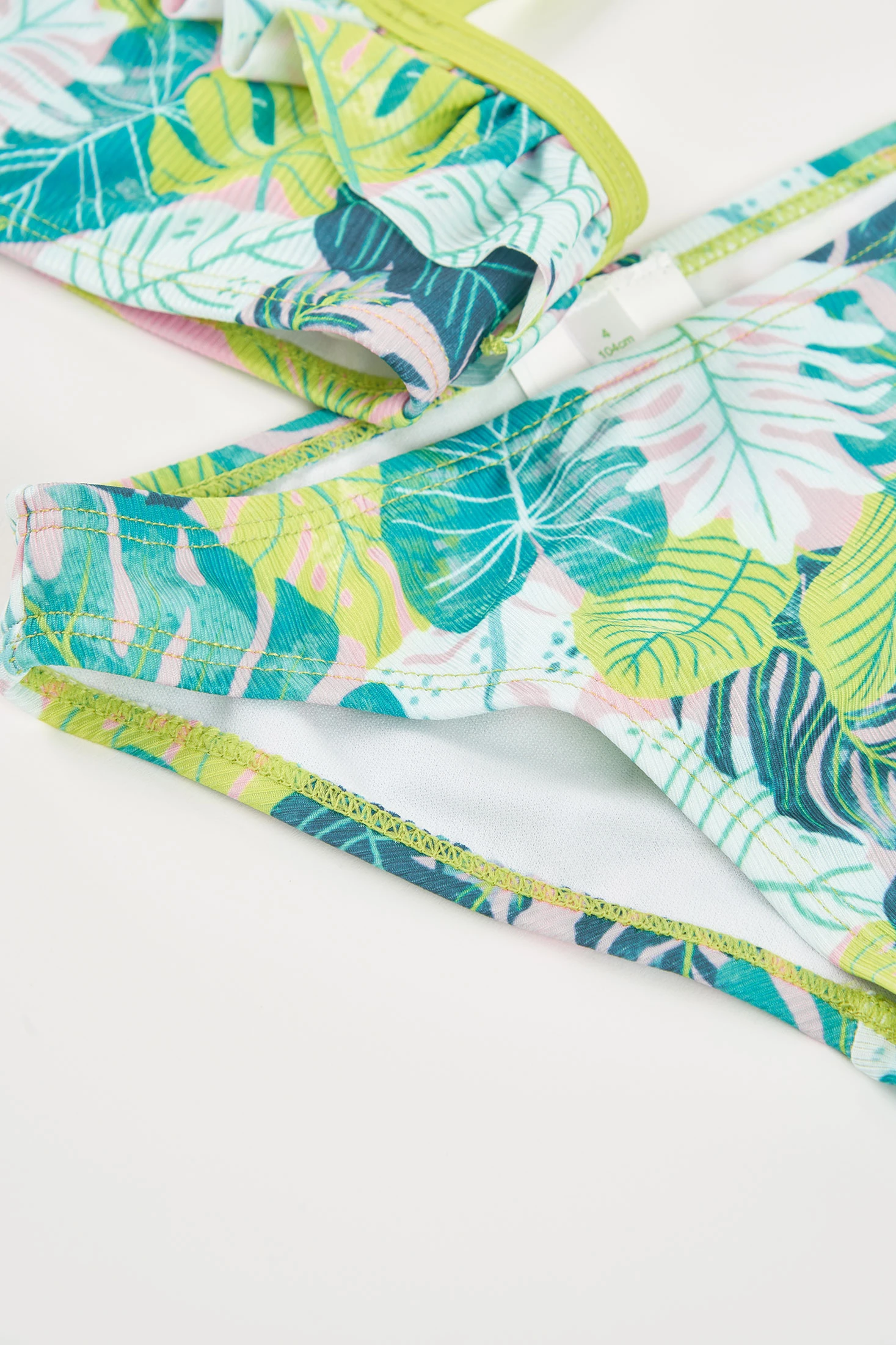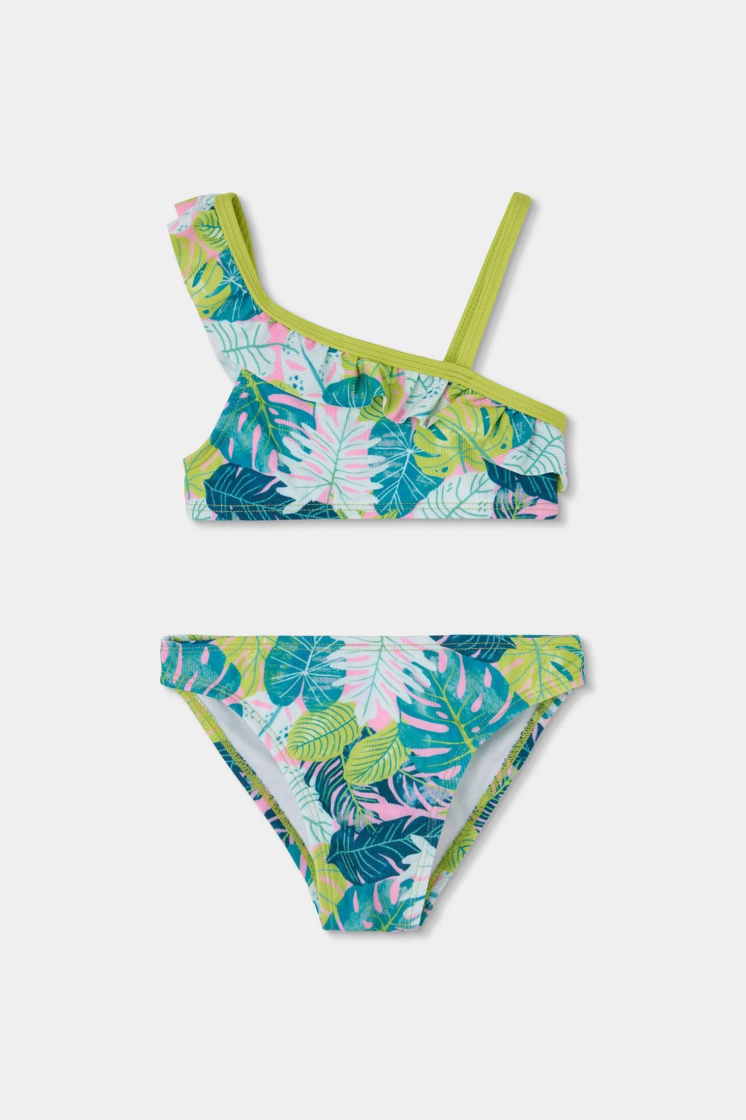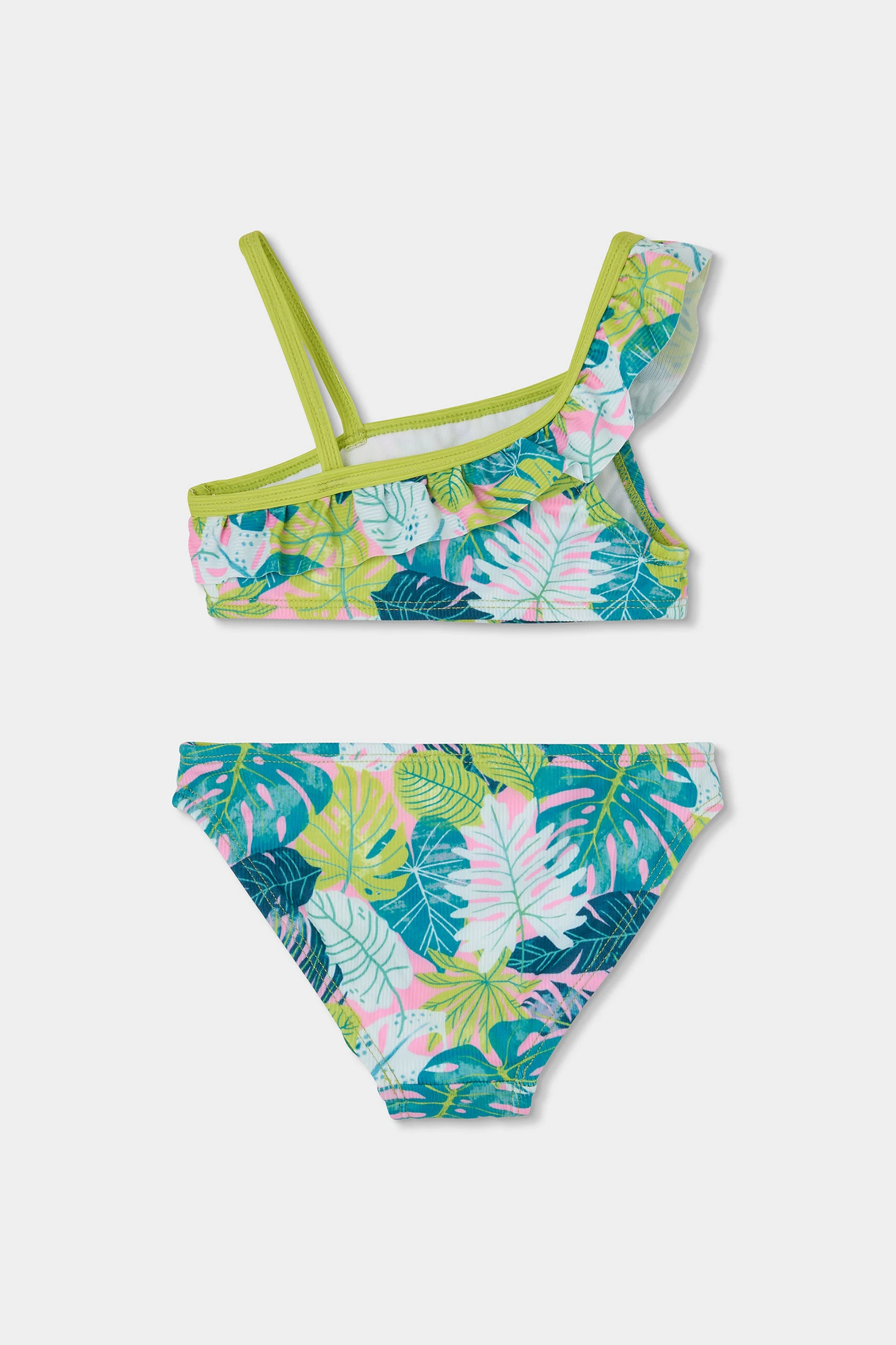 Girls' bikini featuring a colourful tropical leaf print in blue, green, and pink, ideal for summer. Made from stretch material with UPF50 sun protection, it ensures comfort and freedom of movement. Designed with one thin strap and a wider strap with a decorative ruffle, it adds a modern touch. Available in sizes for ages ranging from 2 to 14 years. Perfect for beach or pool days, it is a practical and stylish option for little ones.