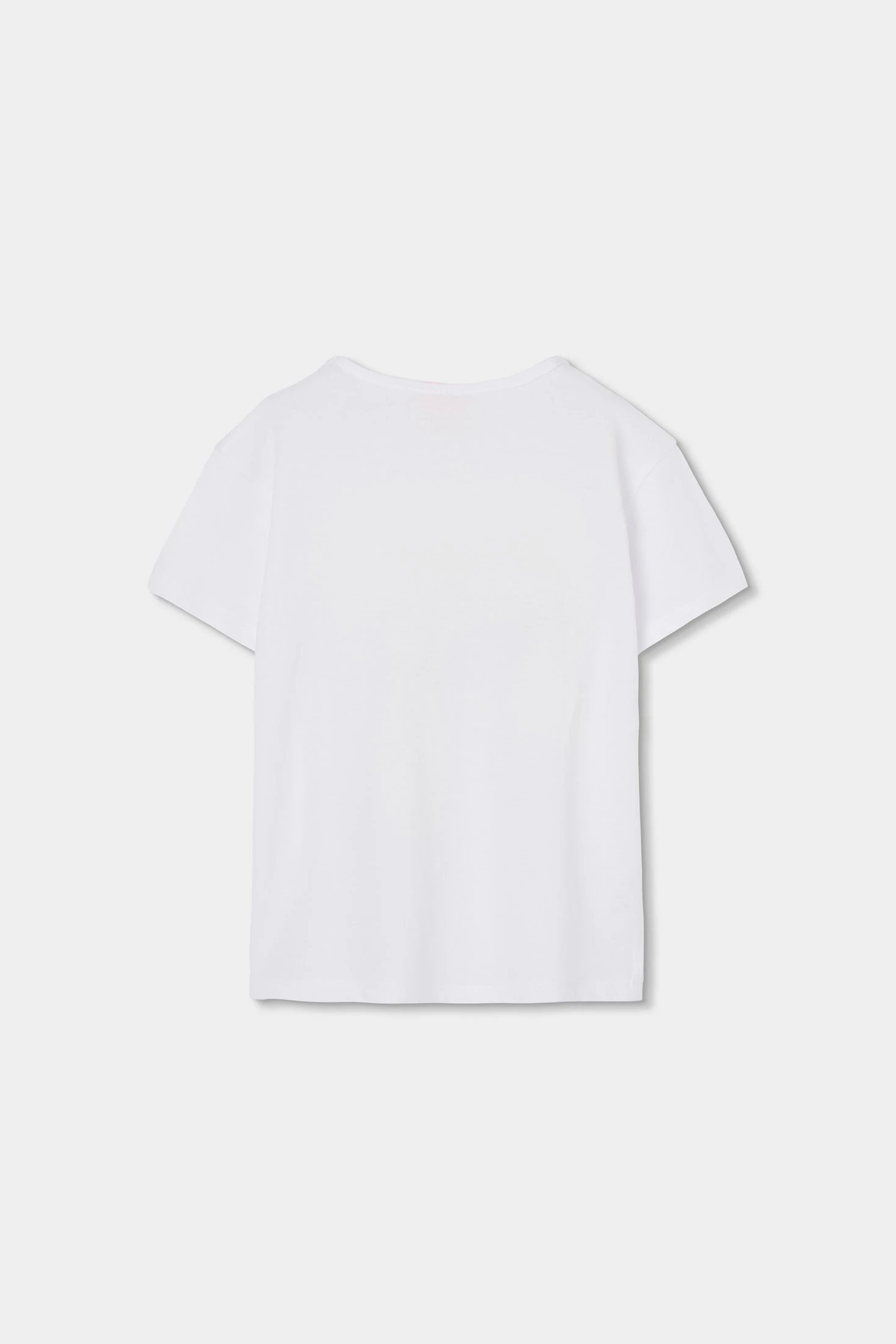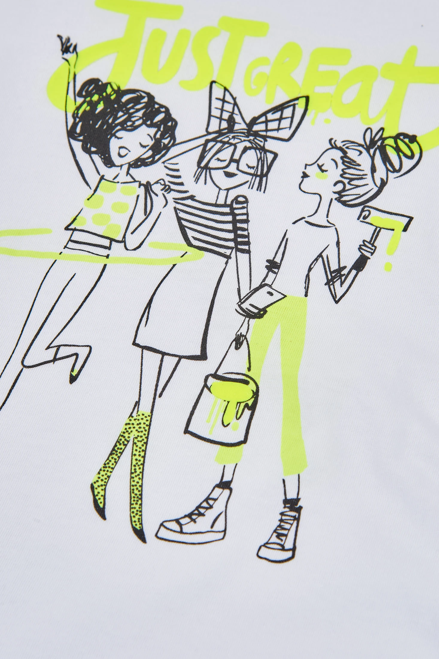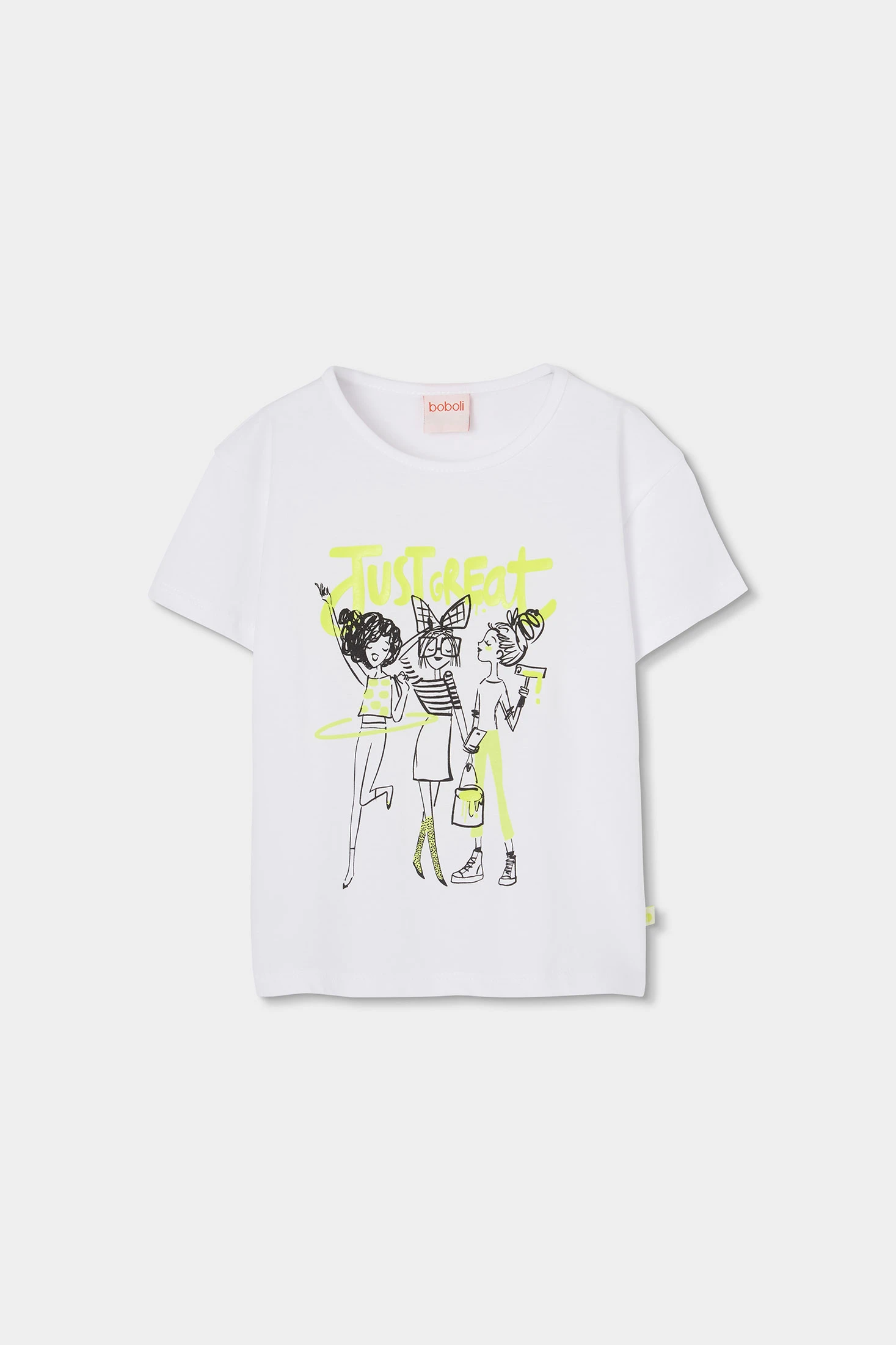 Elastic knit T-shirt for girls, perfect for everyday wear. Made from white cotton, its fabric provides comfort and freedom of movement. It features an eye-catching graphic design on the front that adds a touch of modern style. With a round neck and short sleeves, it is versatile to pair with any outfit. Available in sizes from 2 to 14 years, it is ideal for girls of all ages. An essential basic in any wardrobe, easy to pair with jeans or skirts for a casual and comfortable look.