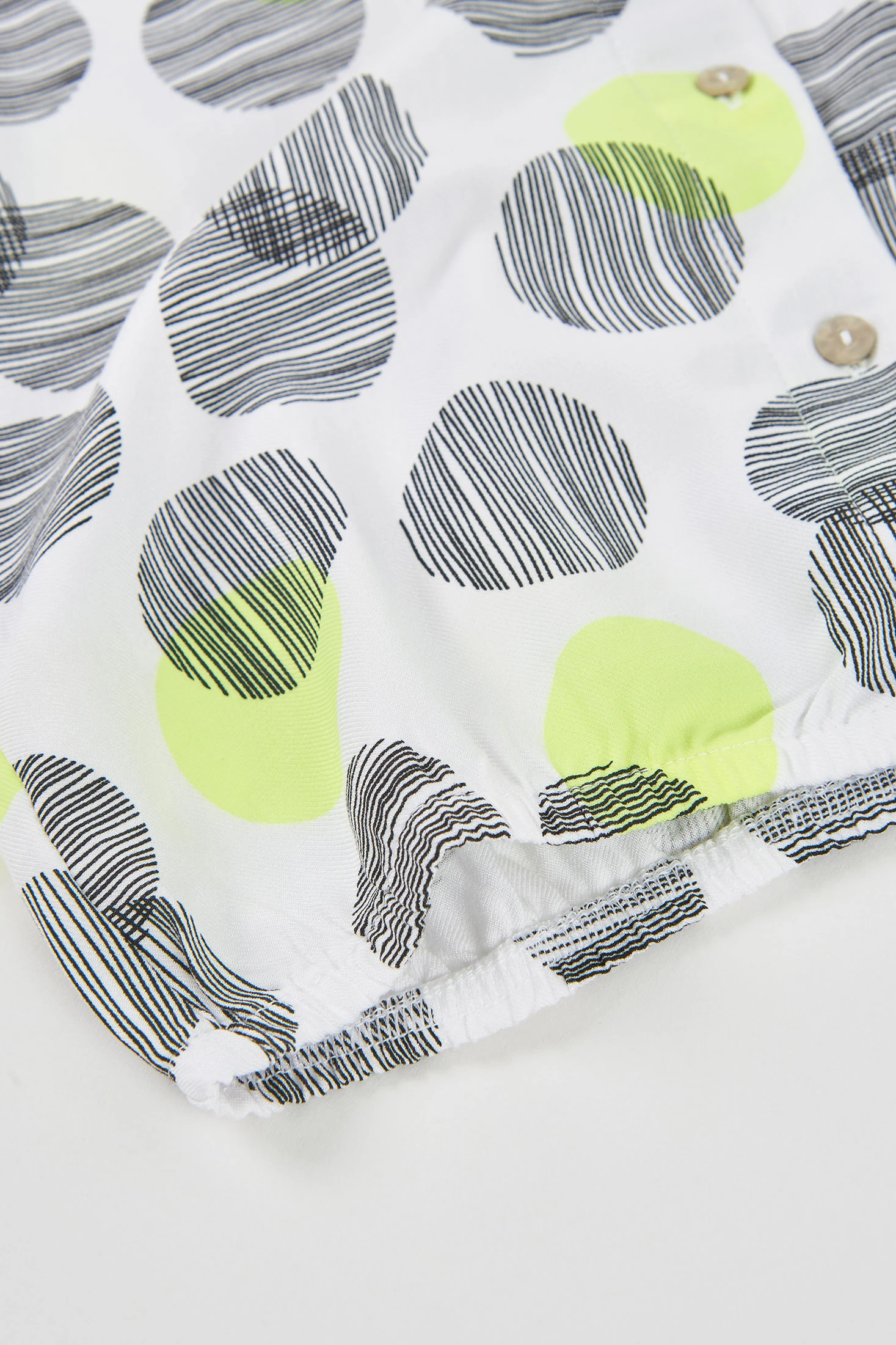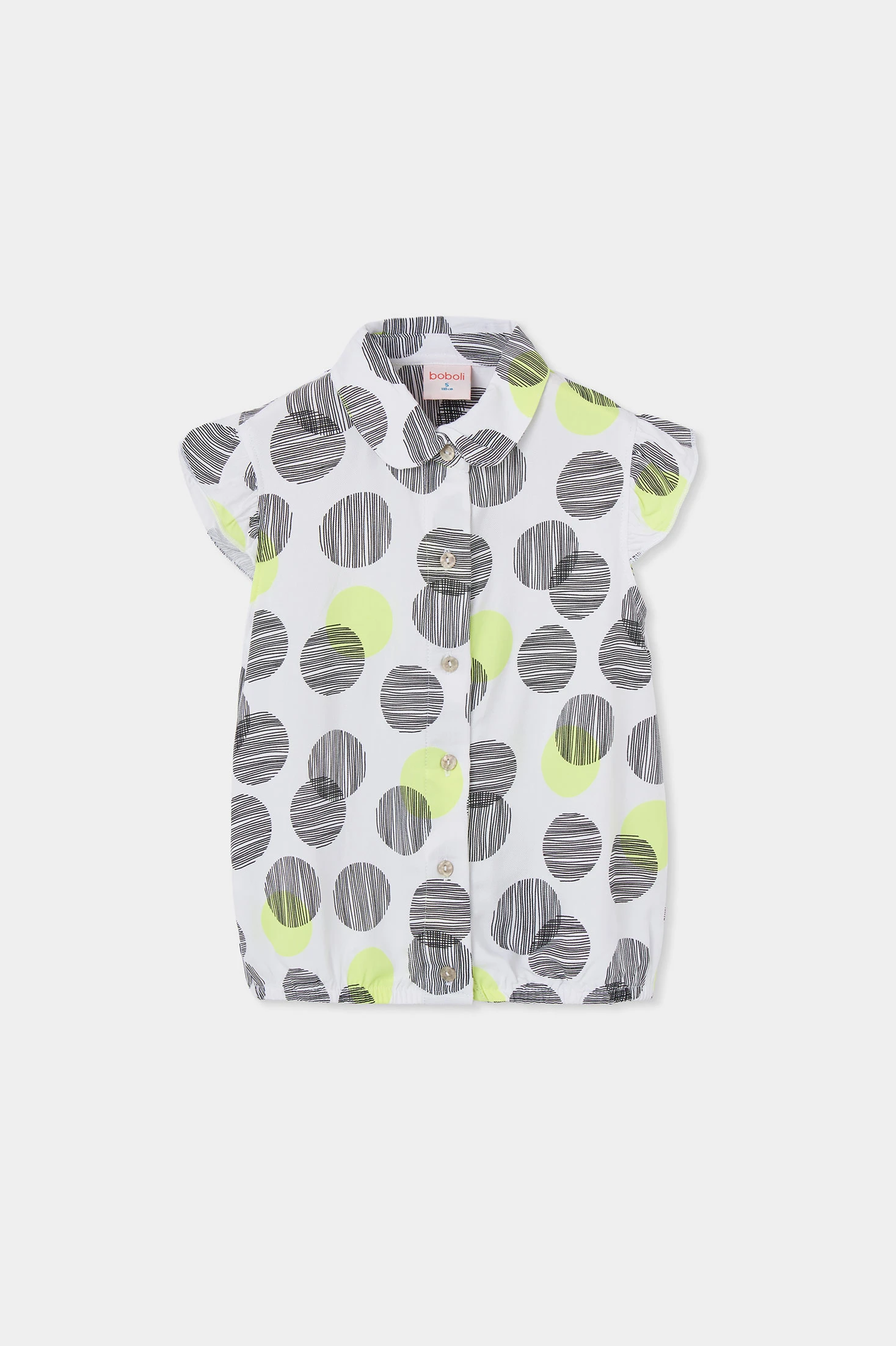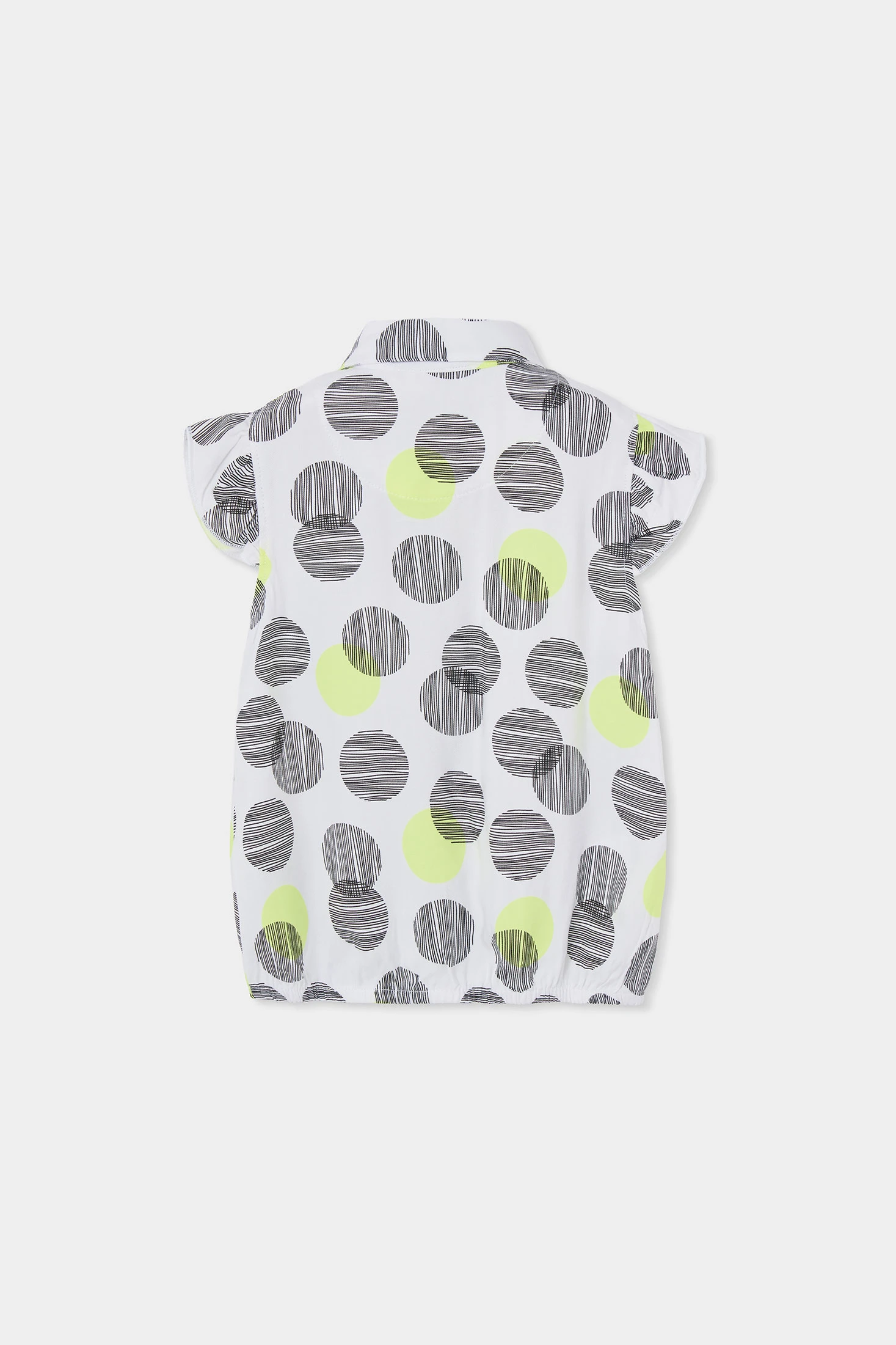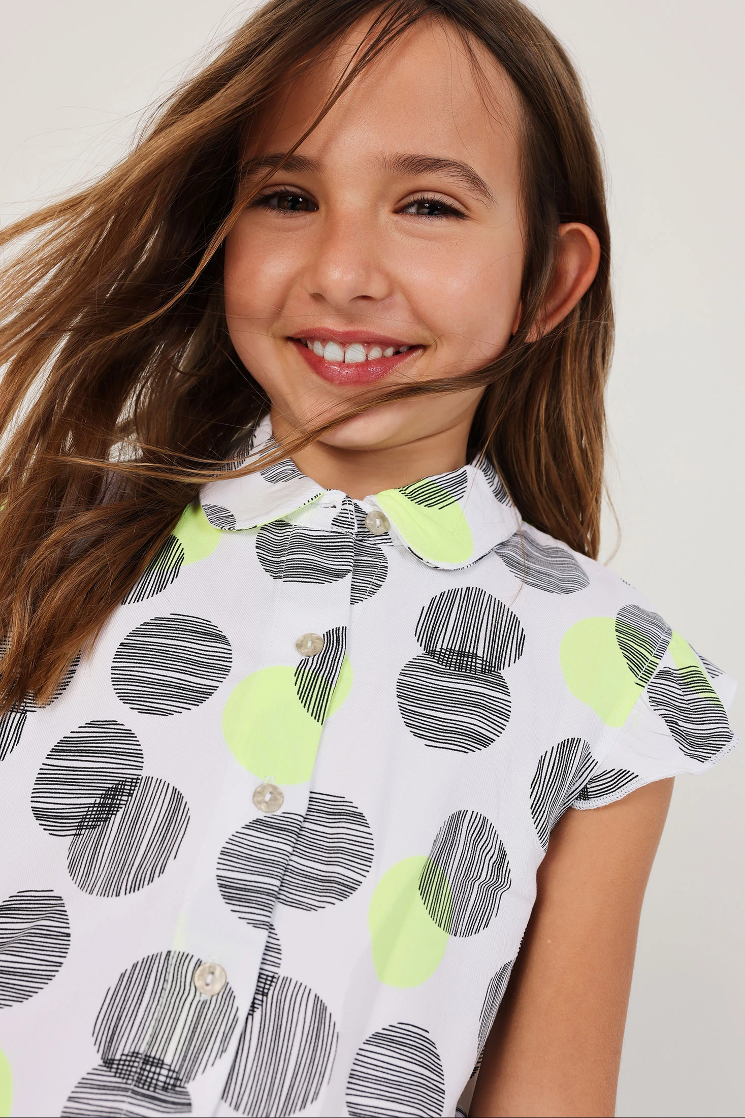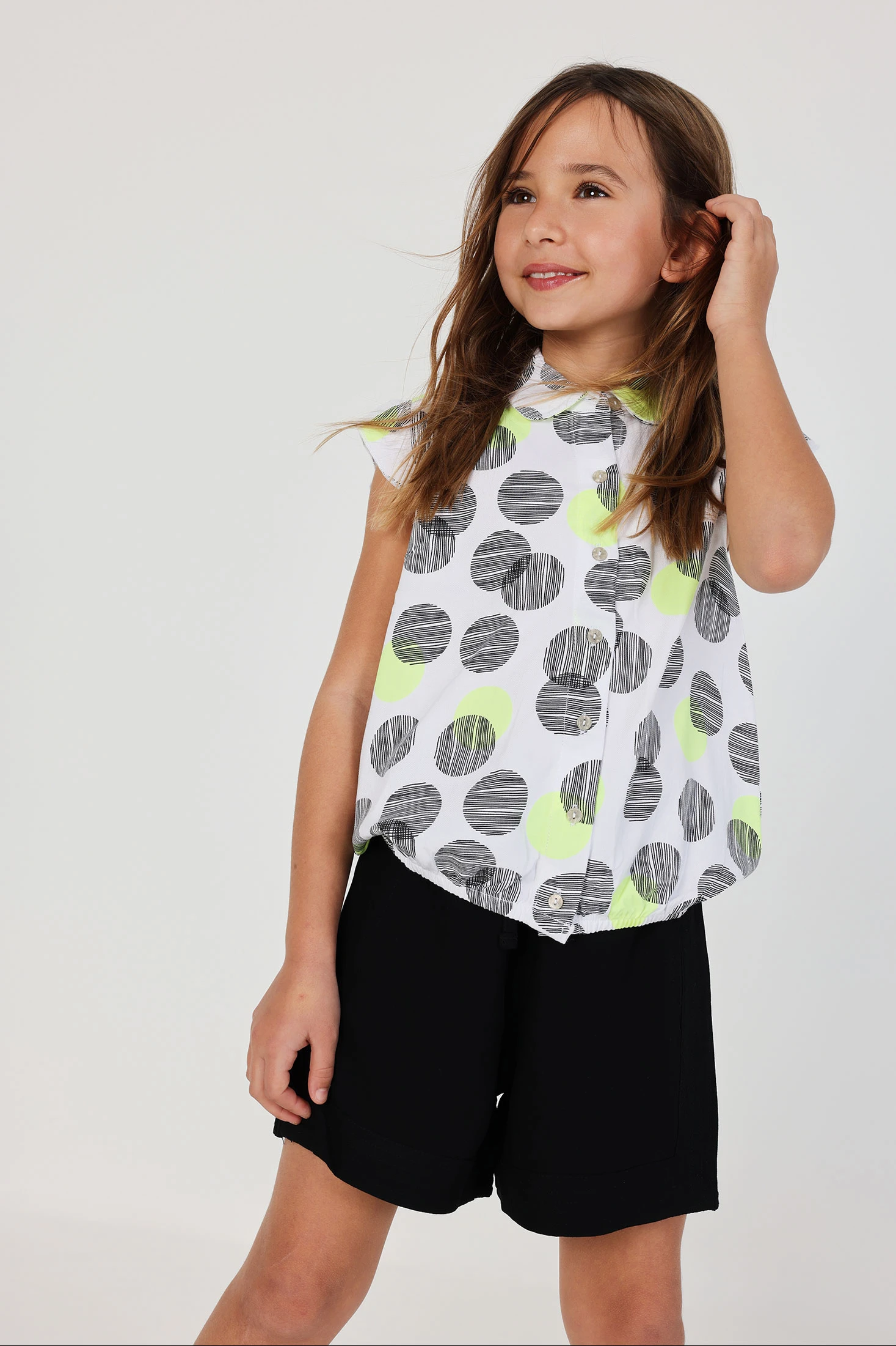 Cool and playful blouse for girls, perfect for spring and summer. Made from cotton, it ensures comfort and freshness. It features a print of black and neon green circles on a white background, adding a modern touch. The sleeveless design and classic collar offer a casual style ideal for sunny days. Available in sizes from 2 years to 14 years, it is perfect to pair with shorts or skirts. The waist tie detail gives a chic finish to the garment.