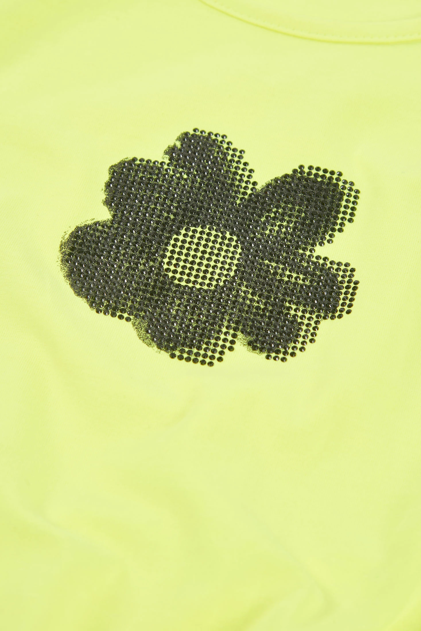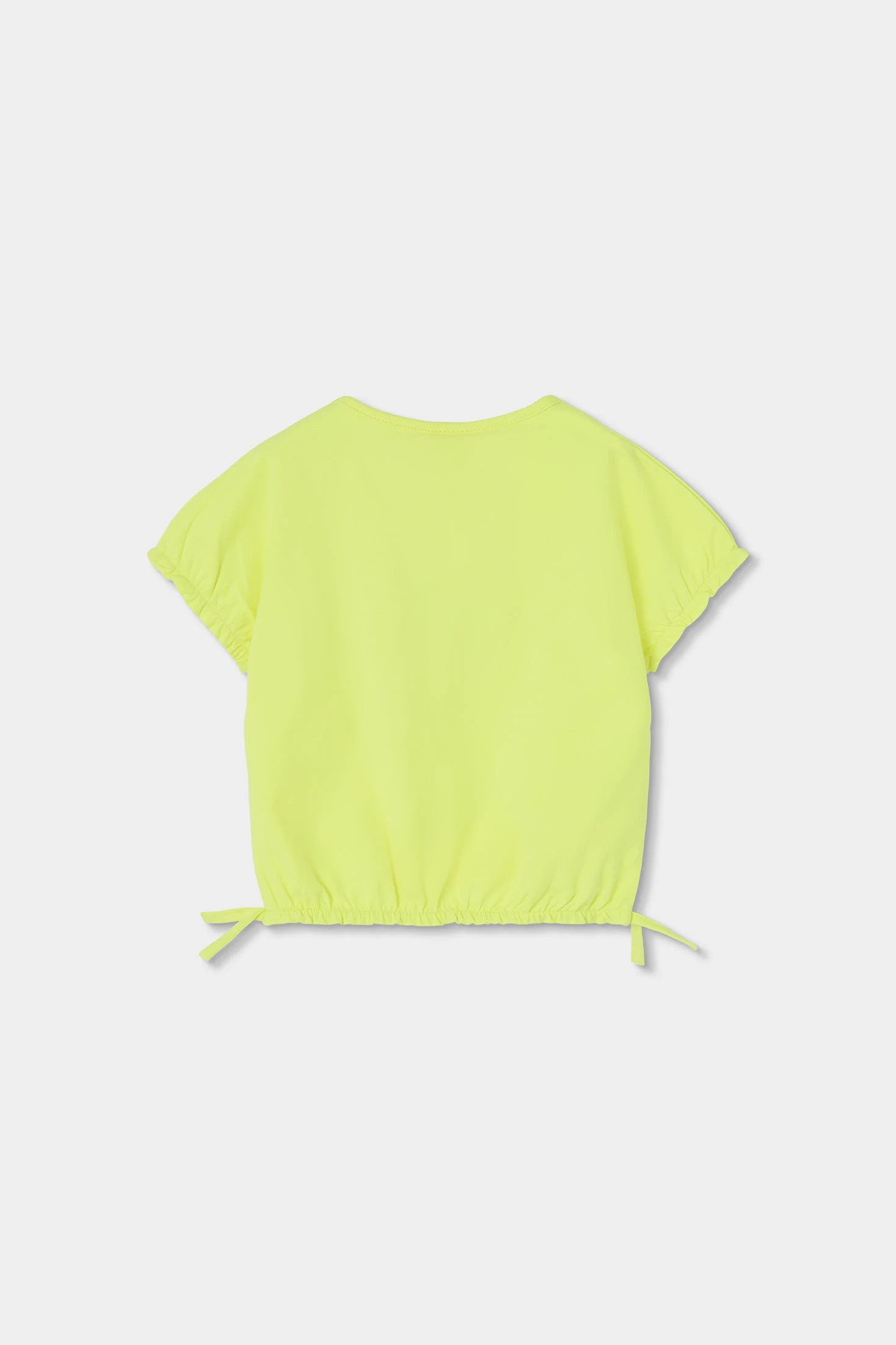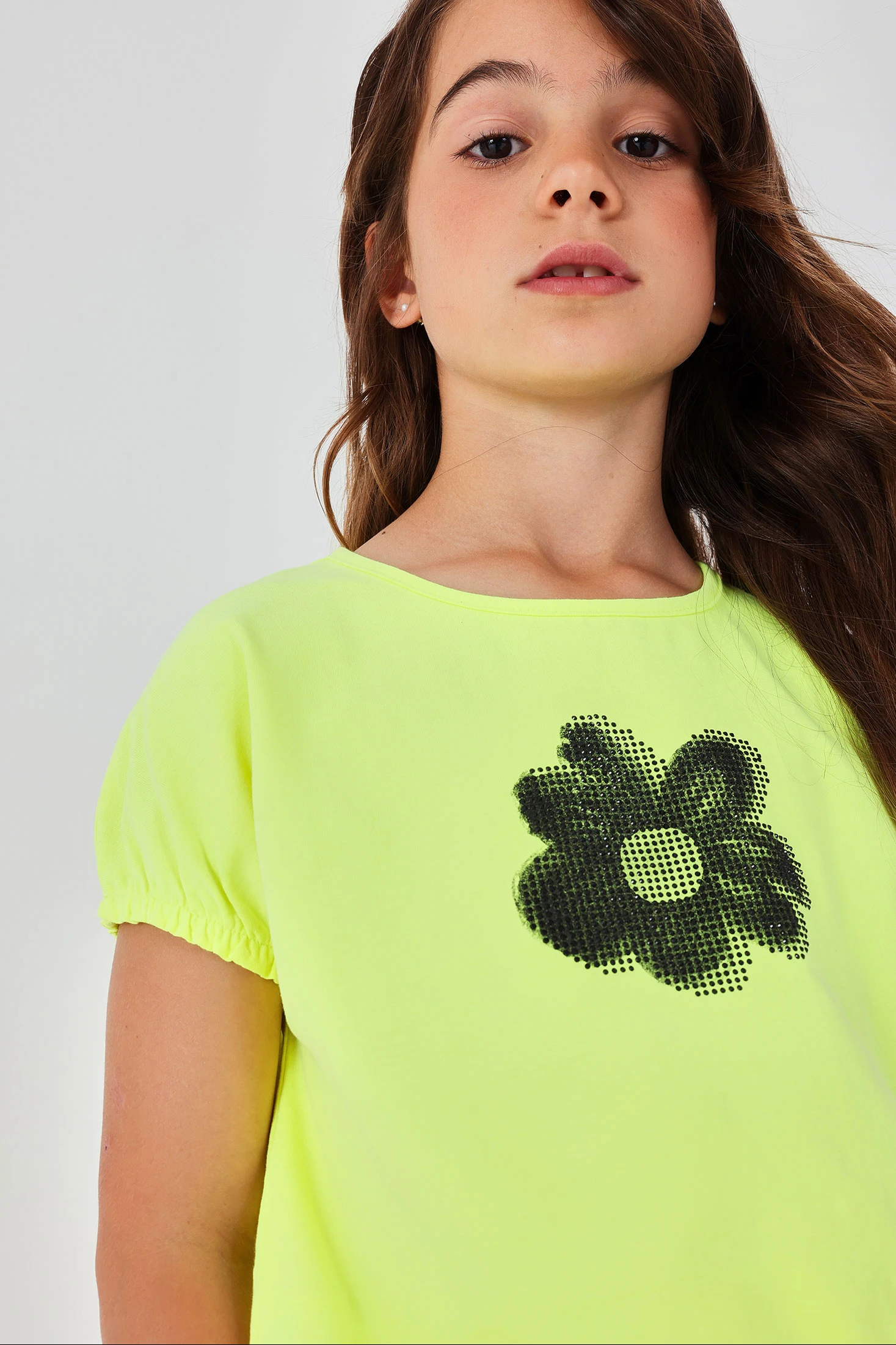Neon green stretch knit T-shirt for girls, ideal for the spring and summer season. Its soft and flexible material provides all-day comfort. The design features a striking flower print on the front, adding a fun and fresh touch. With a round neckline and short sleeves, it?s perfect for outdoor activities. Available in sizes from 2 to 14 years, it accommodates your girl?s growth. This garment is easy to pair with skirts or shorts for a cheerful and summery look.