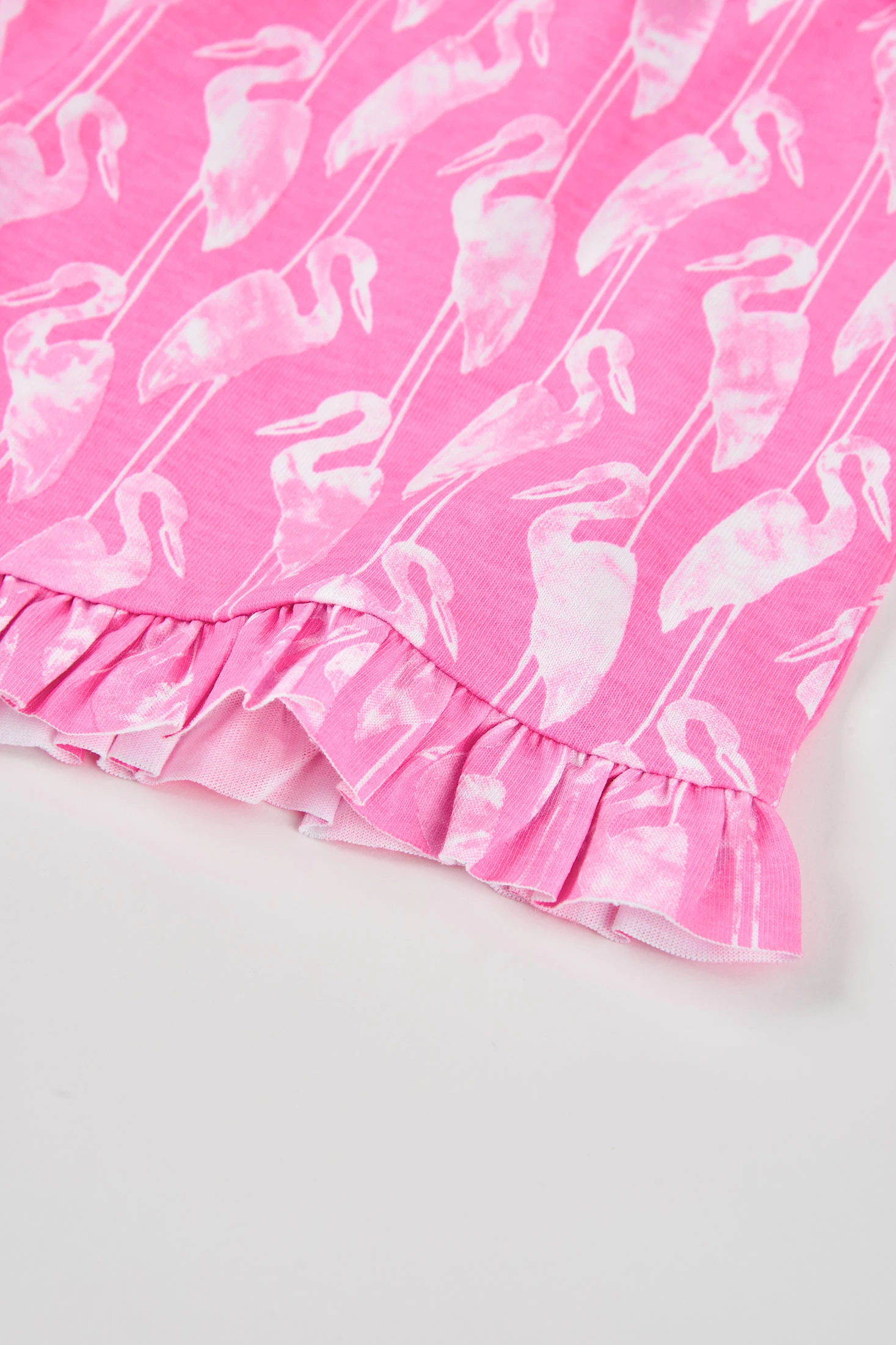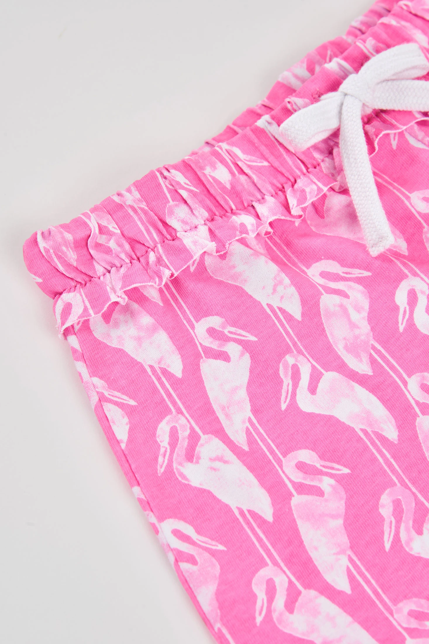 Printed cotton shorts for girls, perfect for summer. It features a fun design of birds on a fluorescent pink background, ideal for adding a cheerful touch to your little one's wardrobe. Its elastic waist with an adjustable bow ensures a comfortable fit, while the small ruffles at the bottom add a playful detail to the garment. Available in sizes from 2 years to 14 years, these shorts are a versatile and comfortable option for warm days.