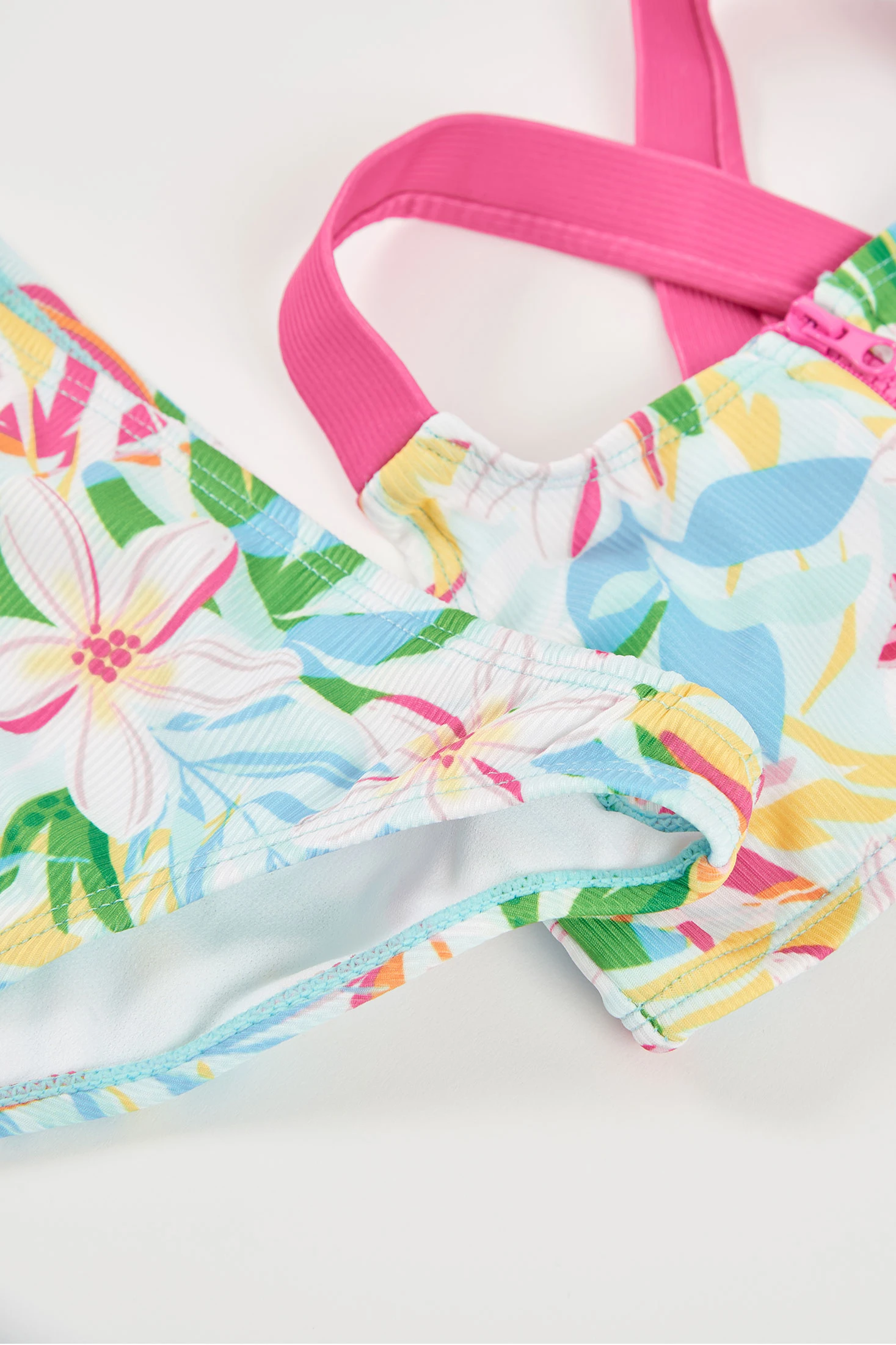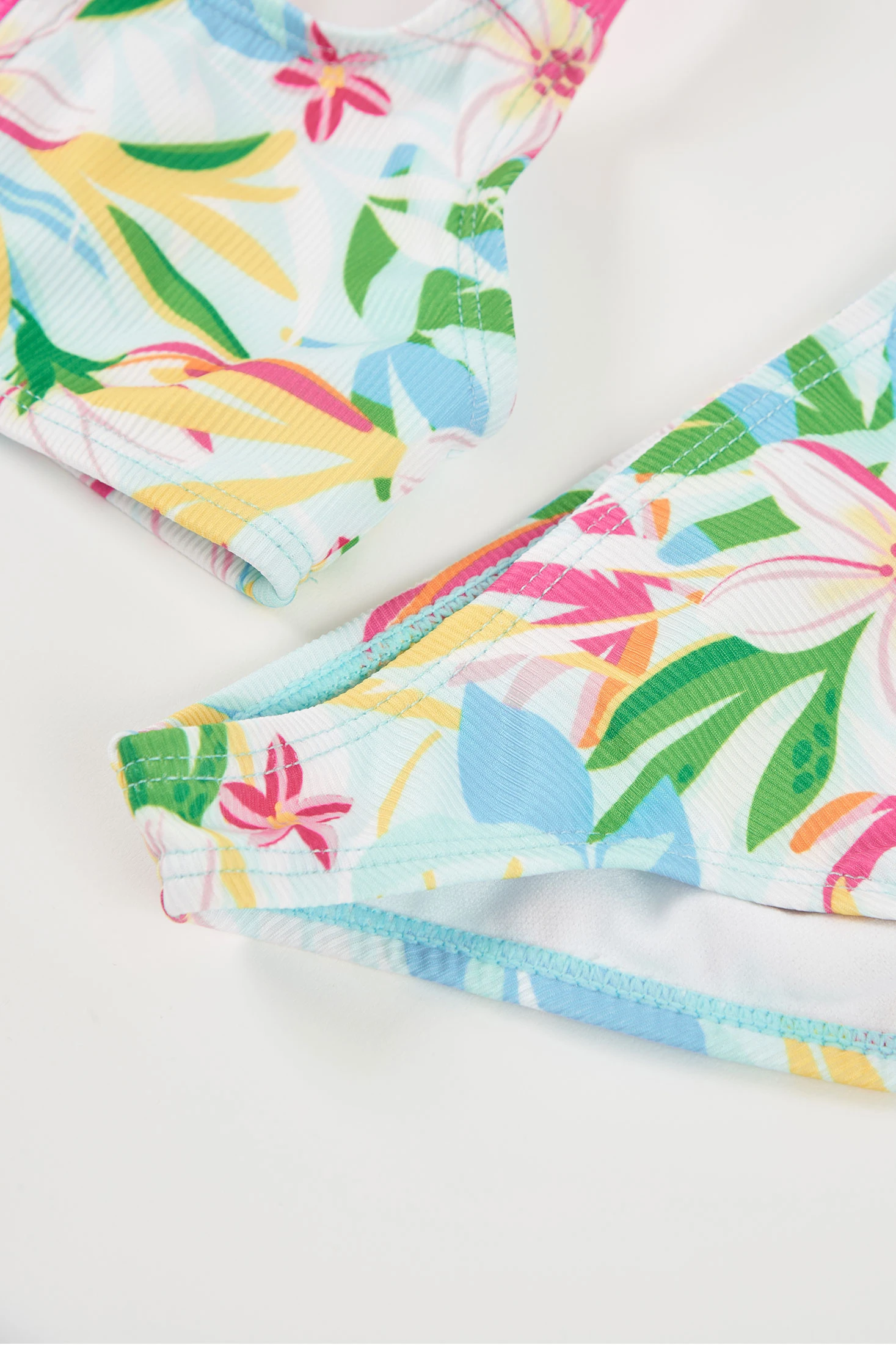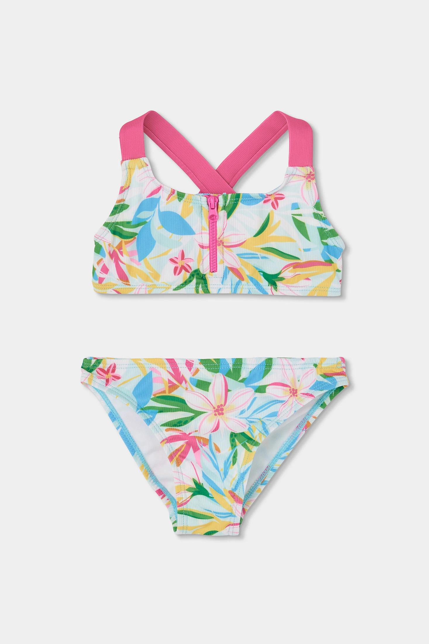 Girls' bikini with a vibrant floral print, ideal for summer. Made from soft and stretchy materials with UPF50 sun protection, it ensures comfort and freedom of movement in the water. Available in sizes from 2 years to 14 years, suitable for various ages. With its colourful design, this bikini is perfect for enjoying sunny days at the beach or pool, combining style and functionality.