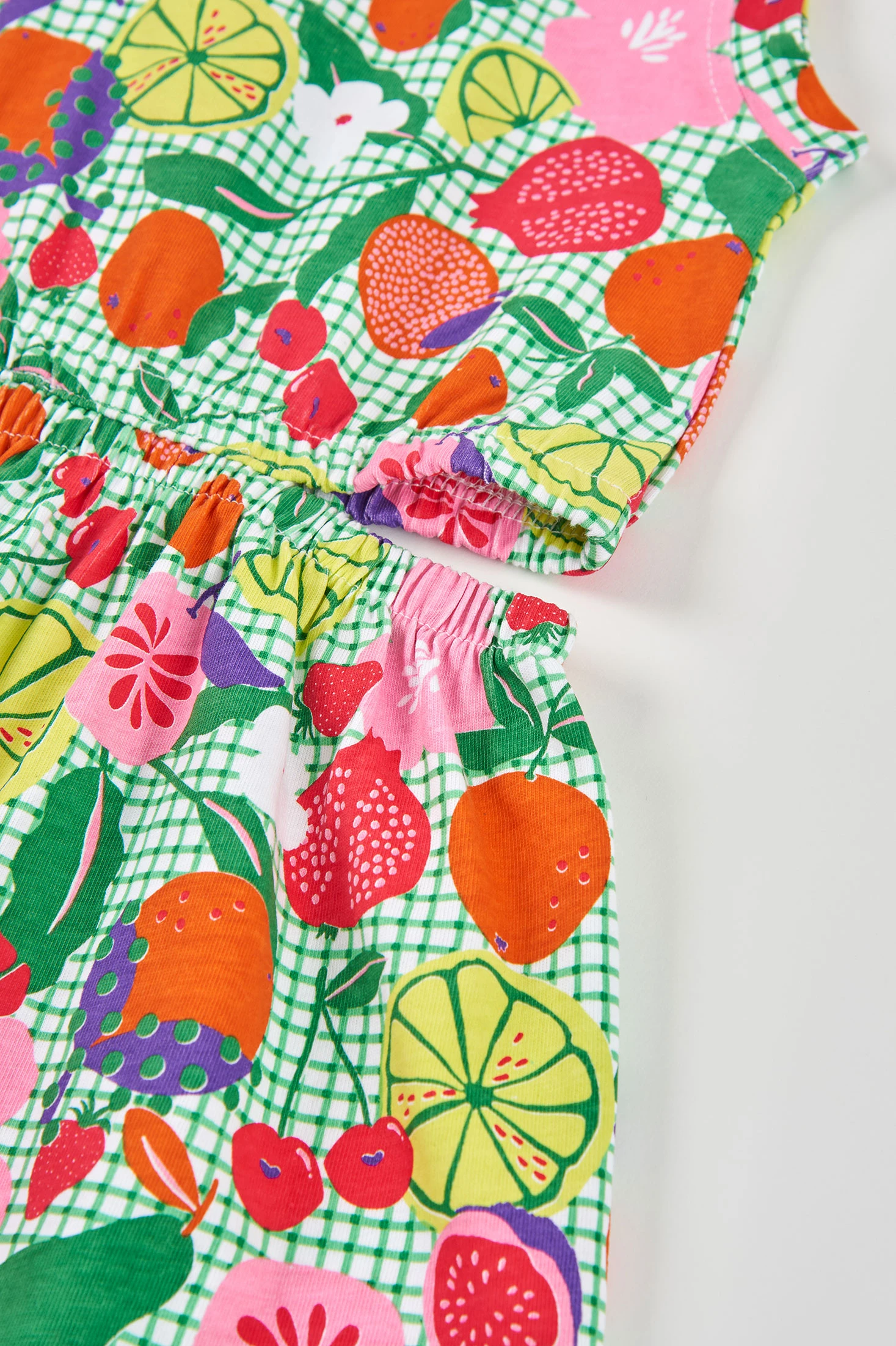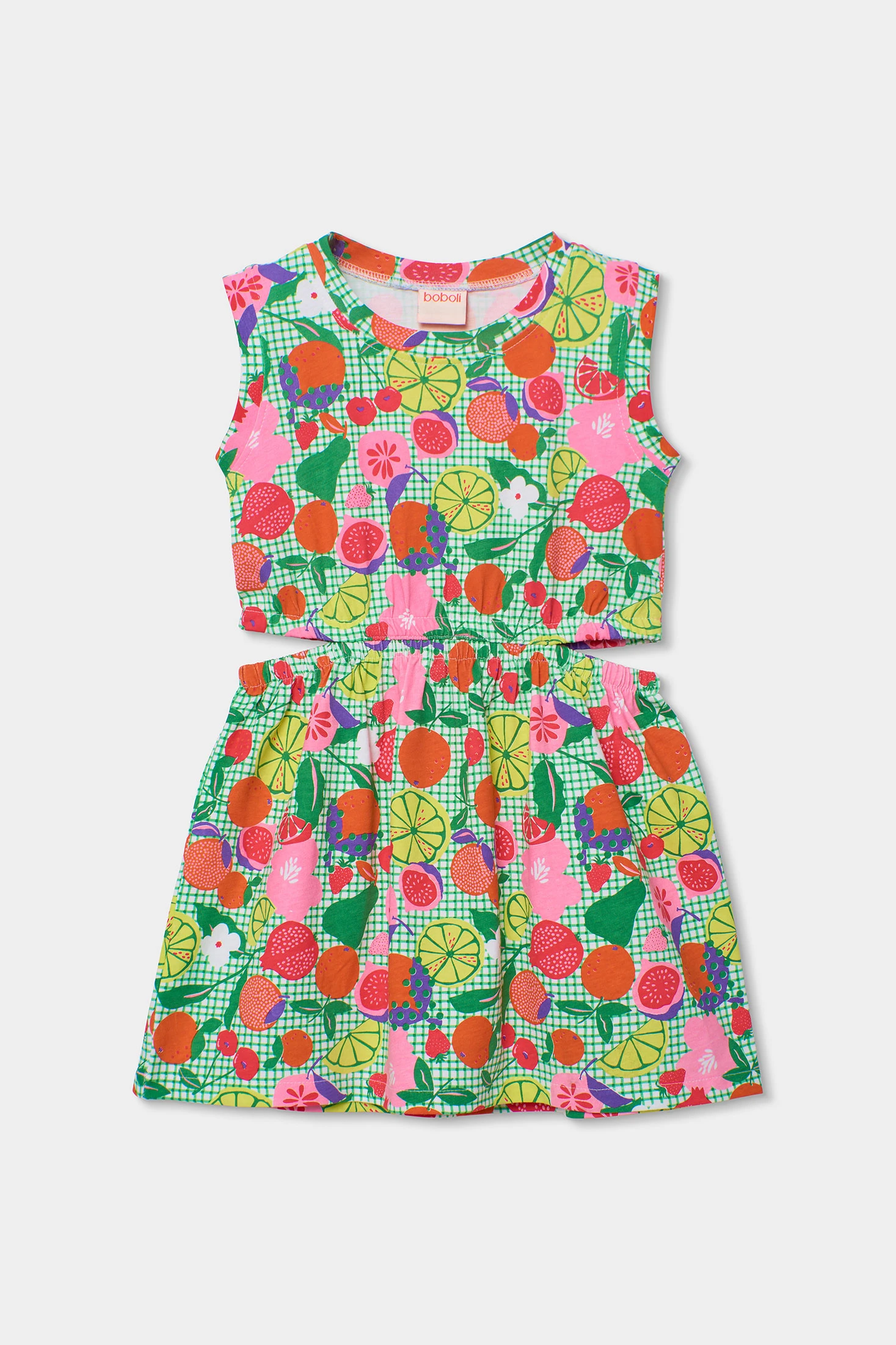 Knitted dress for girls featuring a vibrant fruit print. Sleeveless and with an elastic waistband, it is designed to offer comfort and a fresh feel. Its knitted material ensures softness and ease of movement, ideal for daily wear in warm climates. Available in sizes from 2 to 14 years, this dress is a versatile choice for casual occasions. Pair it with colourful accessories for a cheerful and lively look.