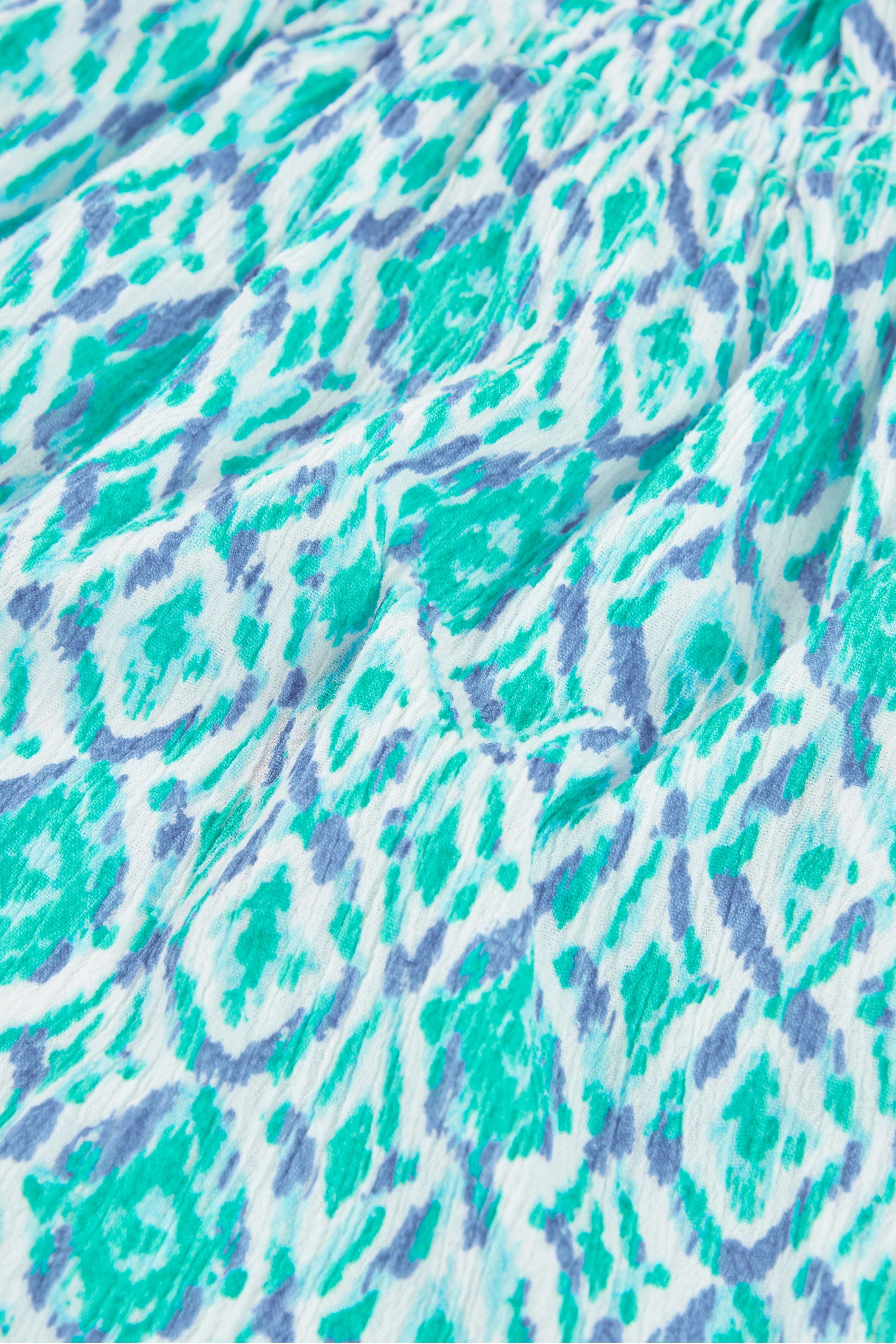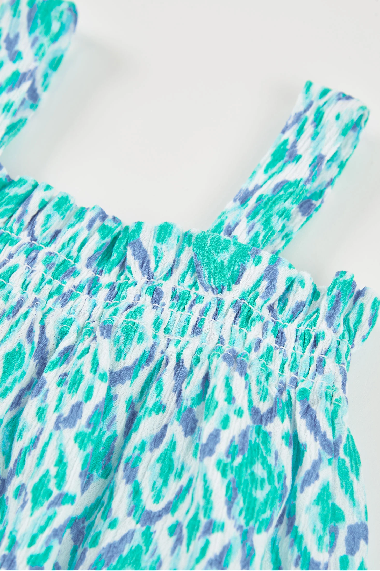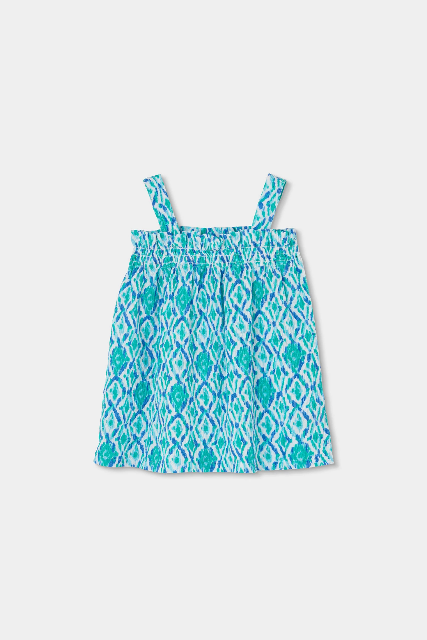 Printed blouse for girls, ideal for summer, made from crinkle cotton, a light and fresh fabric, perfect for staying comfortable in warm climates. It features a colourful design in blue and green tones with ethnic motifs. It has wide straps for a comfortable fit. Available in sizes from 2 years to 14 years, it's a versatile garment that can be paired with shorts or skirts for a casual and fun look.